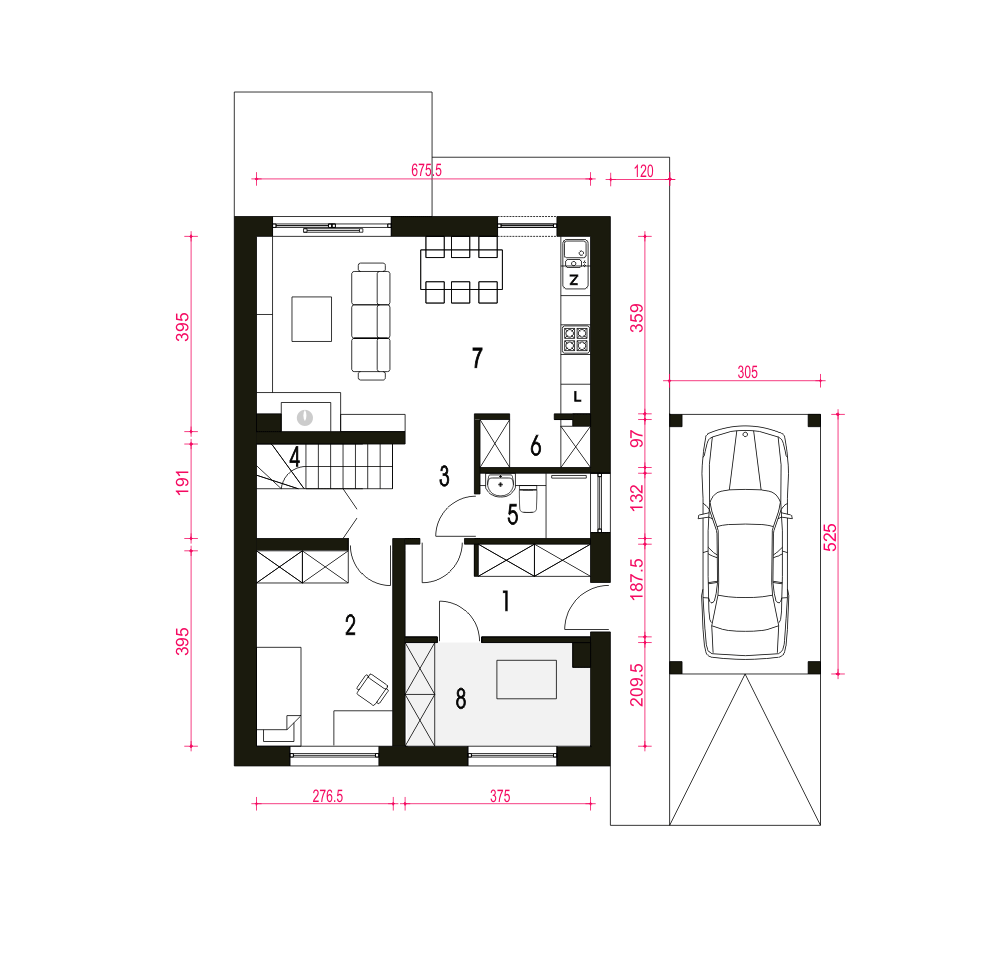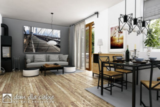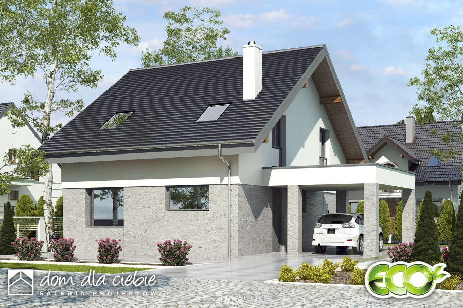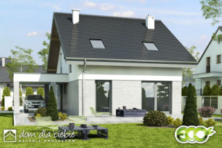 Agat to jednorodzinny dom wpisujący się idealnie w ofertę budynków tanich i ekonomicznych w budowie i w eksploatacji, co udaje się osiągnąć poprzez optymalnie zaprojektowaną funkcję i zwartą bryłę. Agat to dom nieduży, nowoczesny i wygodny z przybudowaną wiatą dla 4-5 osobowej rodziny. Strefa wejściowa do budynku przewiduje duży wiatrołap wyposażony w solidne szafy wnękowe z dostępem do pomieszczenia technicznego z piecem na paliwo stałe. Na parterze zaprojektowano jasny, praktyczny salon połączony z kuchnią , dodatkowy pokój, łazienkę oraz spiżarnię i garderobę wygospodarowaną w przestrzeni pod schodami. Na piętrze zaplanowano 3 sypialnie, garderobę oraz łazienkę.fundamenty: BETONOWE ściany zewnętrzne: POROTHERM+STYROPIAN TERMO ORGANIKA rodzaj stropu: TERIVA I elewacje: TYNK STRUKTURALNY pokrycie dachu: DACHÓWKA CEM. lub CER.