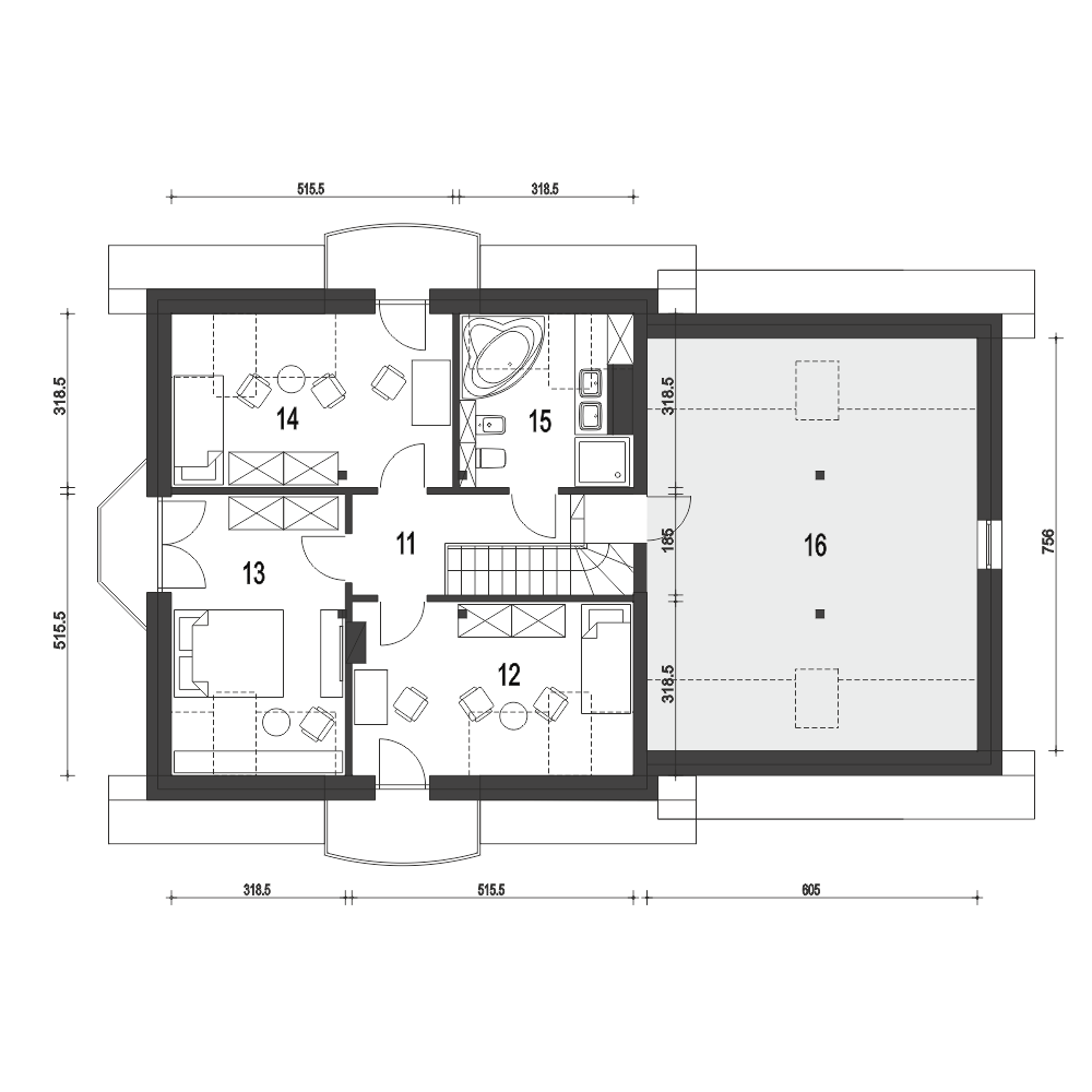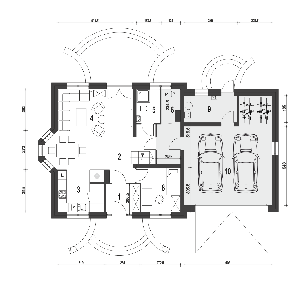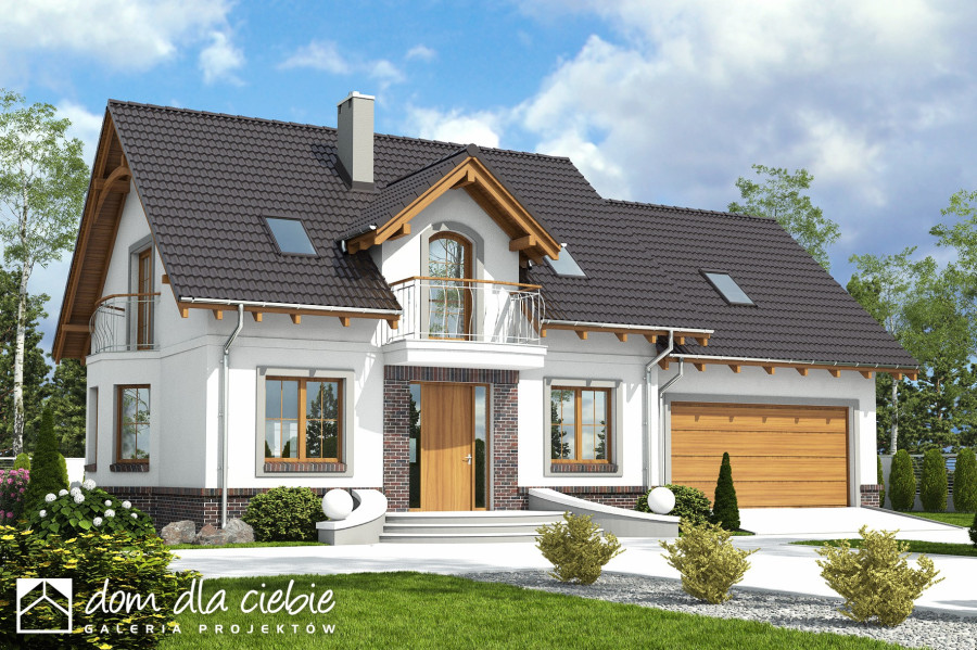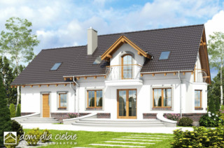 Dom Dla Ciebie 5 z garażem dwustanowiskowym to mniejsza wersja popularnego projektu Dom Dla Ciebie 1. Dom Dla Ciebie 5 to projekt domu o popularnej powierzchni użytkowej około 110 m2. To projekt z użytkowym poddaszem, o tradycyjnej więźbie drewnianej ze ścianką kolankową o wysokości około 1m. Przeznaczony jest dla 4ro osobowej rodziny i tak jak pozostałe projekty z tej serii zaprojektowany został z zachowaniem podziału na dwie strefy: ogólnie dostępną i prywatną. Strefa ogólnie dostępna przewidziana jest na parterze. Mamy tu wiatrołap z wnękowymi szafami, hol, kuchnię ze spiżarnią, salon z jadalnią i kominkiem oraz pokój od frontu, który może służyć jako gabinet. Ponadto jest tu nieduża łazienka z prysznicem oraz przechodnia pralnia z której dostaniemy się do garażu. Za Garażem, od strony ogrodu zaprojektowana jest kotłownia, która dodatkowo może spełnić funkcję pomieszczenia gospodarczego. Na poddasze prowadzą jednobiegowe schody, którymi ostaniemy się do przedpokoju prowadzącego do 3 wygodnych i dobrze oświetlonych pokoi z balkonami. Bezpośrednio ze schodów mozemy się dostać do nieużytkowego strychu, który z łatwością możemy zaadaptować na cele mieszkaniowe. Na poddaszu jest też przewidziana ogólnie dostępną łazienka z narożną wanną i prysznicem. Projekt domu Dom Dla Ciebie 5, to propozycja dla szukających projektu domu tradycyjnego o stylowej architekturze, funkcjonalnym wnętrzu i o energooszczędnych parametrach.