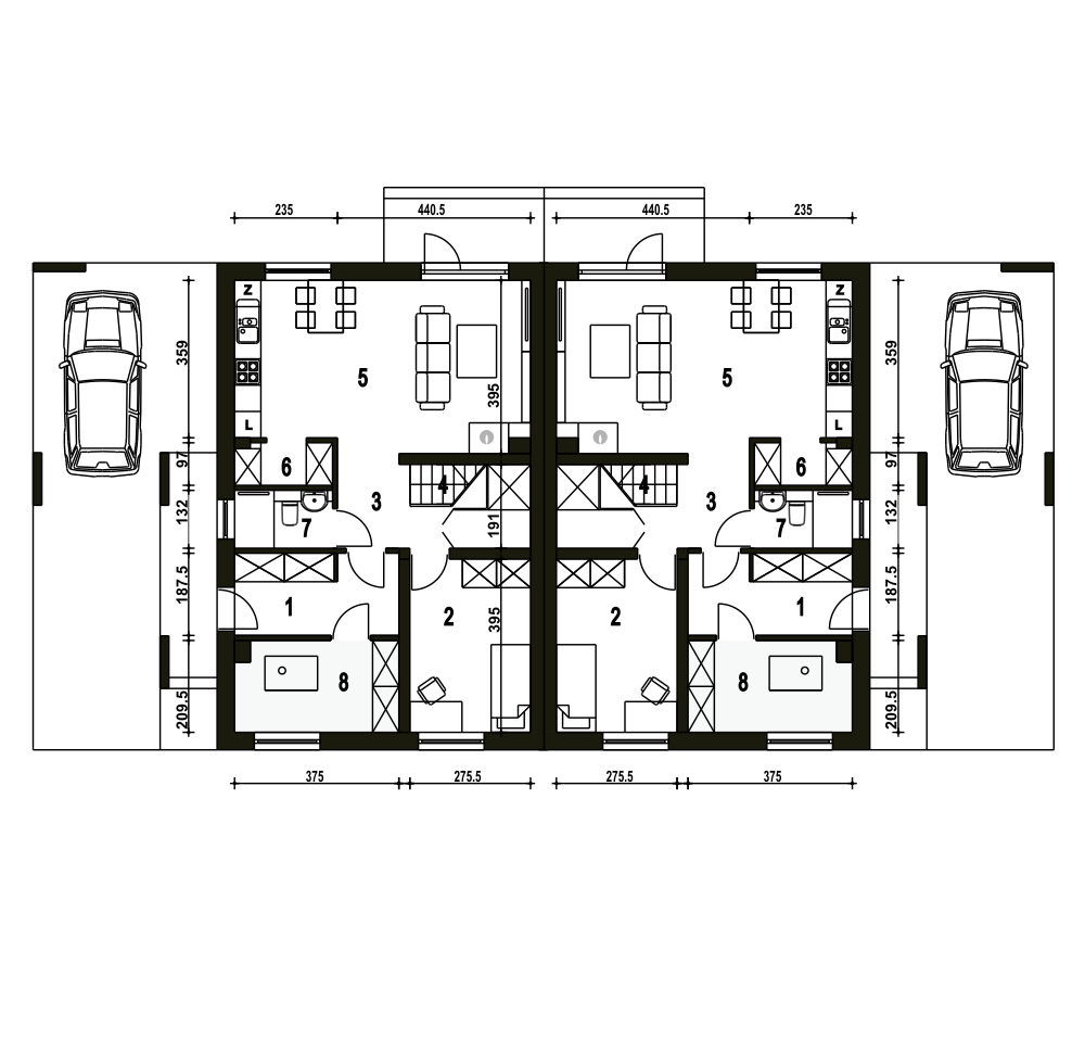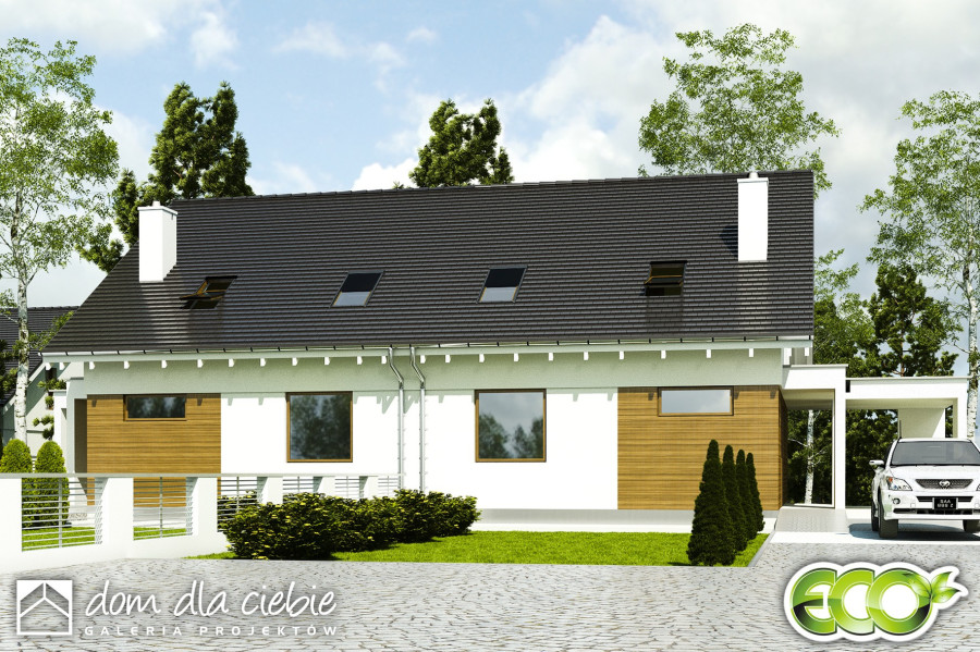 (Uwaga: projekty typu bliźniak oferujemy jako domy dwulokalowe, projekt można zamówić również w zabudowie bliźniaczej) Wariant A1-BL to dwa segmenty z garażami połączone ścianami szczytowymi od strony salonów. Opis odnosi się do jednego segmentu.Projekt domu Głuszec jest przykładem klasycznego domu jednorodzinnego z poddaszem przeznaczonym na cele mieszkalne. Ten dwukondygnacyjny i prosty konstrukcyjnie dom jest dobrą alternatywą na wąskie działki lub do zabudowy bliźniaczej. do budynku prowadzi zadaszone wejście usytuowane z boku budynku. Połączono je z dużą wiatą przed domem. Na parterze zaproponowano strefę wspólną a także dodatkowy pokój mogacy pełnić funkcję gościnnego lub gabinetu. Z salonu z jadalnią i kuchnią można wyjść na taras i kominek. W kuchni znajdziemy spiżarnię a obok niej łazienkę. Dużą kotłownię zaprojektowano od frontu budynku. Na piętrze w projekcie zaproponowano trzy sypialnie, garderobę oraz duża łazienkę. Głuszec to dom ekonomiczny w budowie i eksploatacji. Ze względów ekonomicznych zrezygnowano z balkonów i tarasów. Zastosowane portfenetry i dodatkowo okna połaciowe sprawią, że każde pomieszczenie na poddaszu będzie doskonale doświetlone. Elewacę domu charakteryzuje delikatny detal i naturalna kolorystyka.