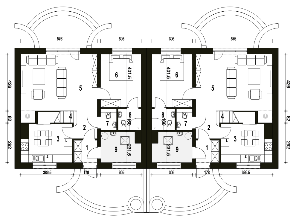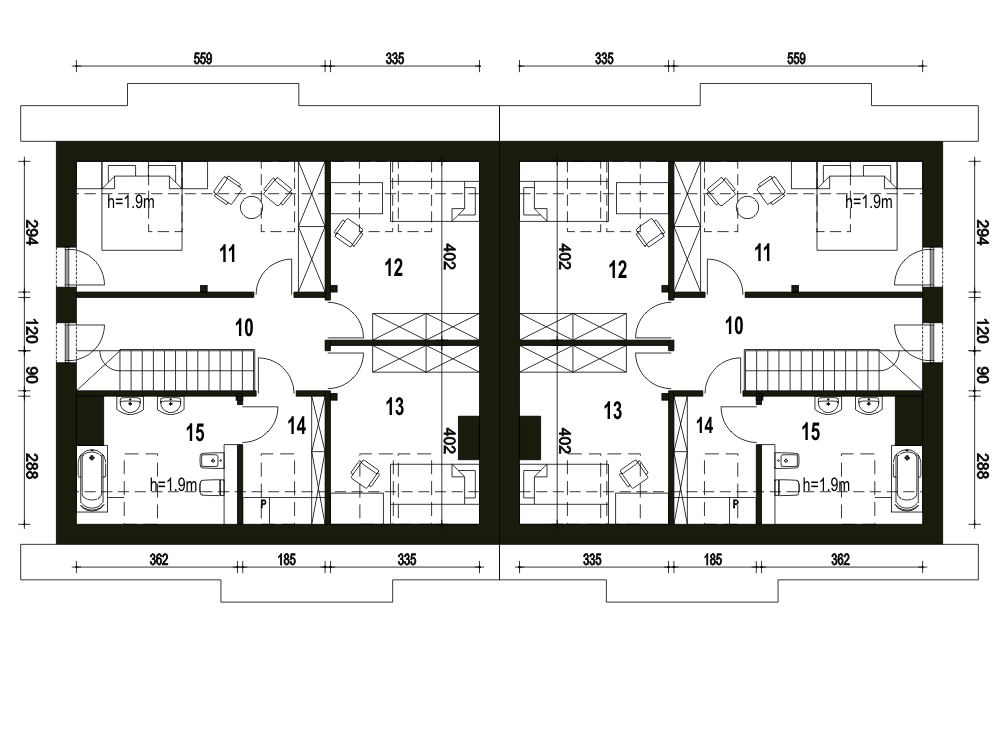 (Uwaga: projekty typu bliźniak oferujemy jako domy dwulokalowe, projekt można zamówić również w zabudowie bliźniaczej) Sosnówka II B-BL1 powstała poprzez połączenie dwóch segmentów ścianami szczytowymi od strony kotłowni. Poniższy opis dotyczy jednego segmentu: Dom Sosnówka II zaprojektowano na rzucie prostokąta gdzie kalenica jest równoległa względem elewacji frontowej. Doskonale wpisze się na nieduże działki o średniej wielkości i ze względu na typowy kształt będzie się dobrze komponował w każdym otoczeniu. Ze względu na prostą formę projekt ten zalicza się do tanich w budowie i eksploatacji. Widać tu wyraźny podział na strefę dzienną na parterze oraz nocną na poddaszu.Pod schodami umieszczono kominek. Na parterze oprócz przestronnego salonu zaprojektowano osobną kuchnię oraz pokój gościnny z indywidualną łazienką. Na tym poziomie mamy także wc oraz pomieszczenie z piecem co. Na poddaszu zaplanowano 3 sypialnie oraz łazienkę i garderobę.