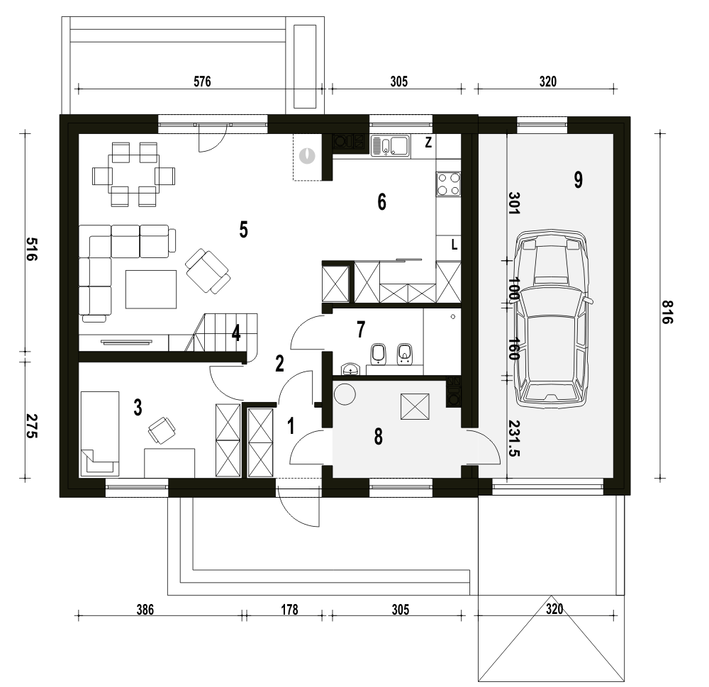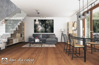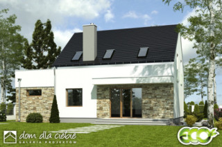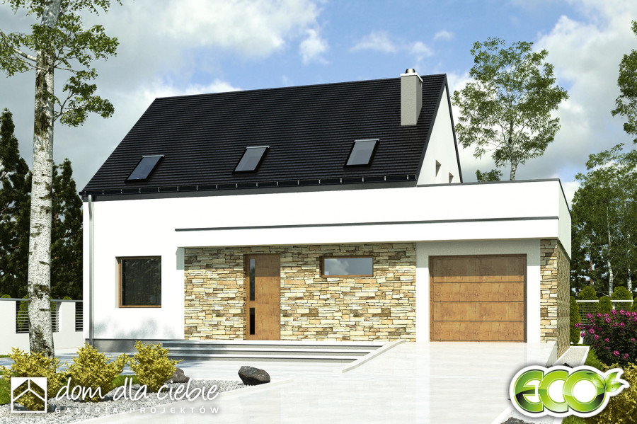 Dom Sosnówka zaprojektowano na rzucie prostokąta gdzie kalenica jest równoległa względem elewacji frontowej. Doskonale wpiasze się na nieduże działki o średniej wielkości i ze względu na typowy kształt będzie się dobrze komponował w każdym otoczeniu. Projekt zawiera w parterze; salon z kuchnią i kominkiem z dostępem do części tarasowej, łazienkę, pokój gościnny oraz w części komunikacyjnej wiatrołap i hol. Mamy tu także kotłownię,za nią pralnię . Przez kotłownię dostaniemy się do garażu. Poddasze na które prowadzą jednobiegowe schody to 3 sypialnie z dostępem do dużego tarasu oraz łazienka. Minimalistyczny ale jednocześnie ciepły wizerunek Sosnówki sprawia, że doskonale może się ona wpisać w każdy krajobraz.fundamenty: BETONOWE ściany zewnętrzne: POROTHERM+STYROPIAN TERMO ORGANIKA rodzaj stropu: TERIVA I elewacje: TYNK STRUKTURALNY, OKŁADZINA KAMIENNA pokrycie dachu: DACHÓWKA CEMENTOWA, CERAMICZNA lub BLACHA DACHÓWKO PODOBNA