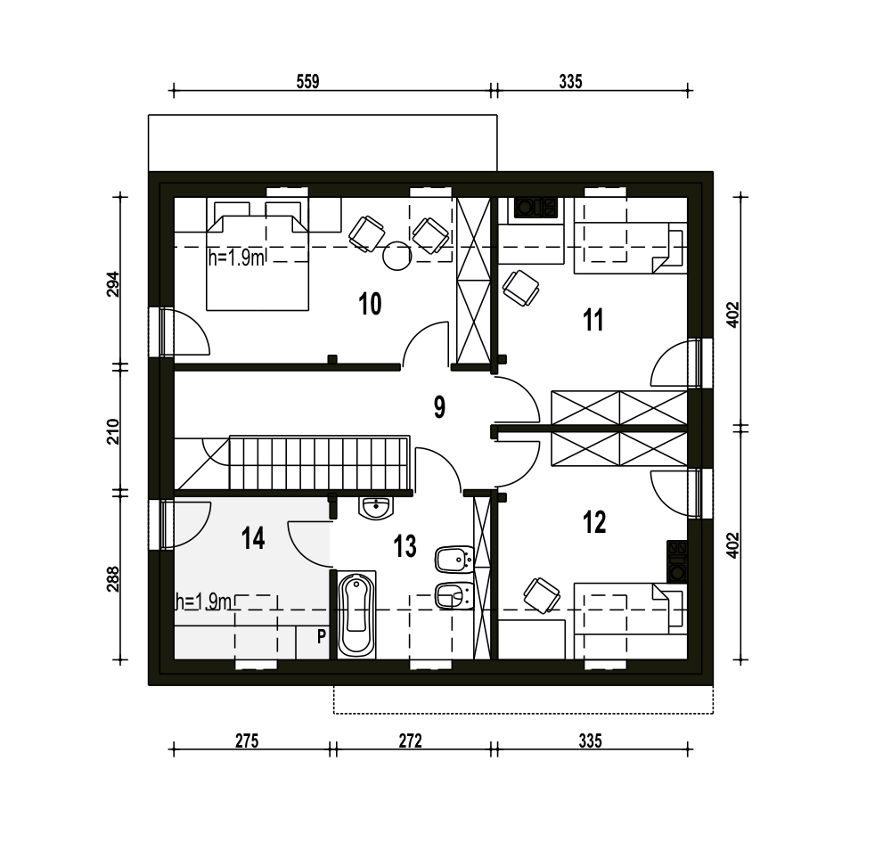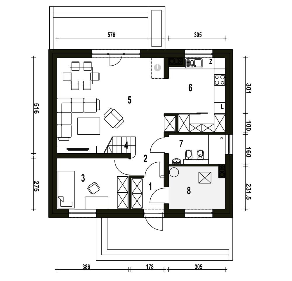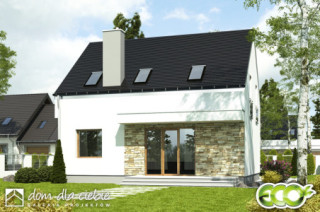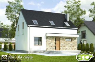 Dom Sosnówka zaprojektowano na rzucie prostokąta gdzie kalenica jest równoległa względem elewacji frontowej. Doskonale wpisze się na nieduże działki o średniej wielkości i ze względu na typowy kształt będzie się dobrze komponował w każdym otoczeniu. Projekt zawiera w parterze; salon z kuchnią i kominkiem z dostępem do części tarasowej, łazienkę, pokój gościnny oraz w części komunikacyjnej wiatrołap i hol. Mamy tu także kotłownię,za nią pralnię . Poddasze na które prowadzą jednobiegowe schody to 3 sypialnie z dostępem do dużego tarasu oraz łazienka. Sosnówka ma wizerunek minimalistyczny ale jednocześnie bardzo ciepły i zachęcający.