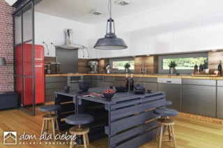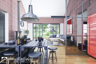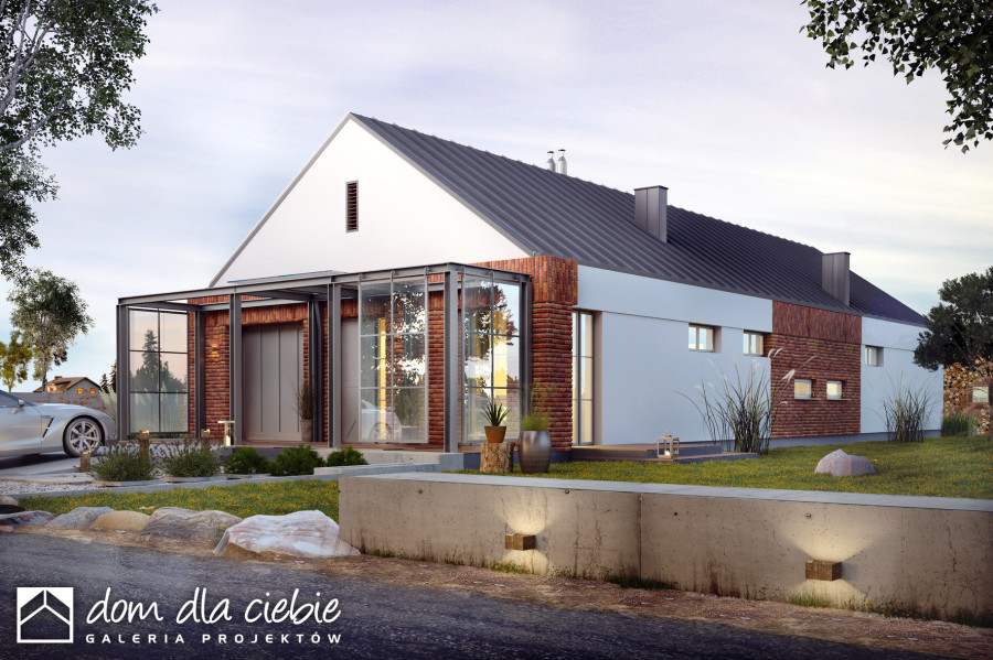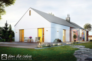 Dom Carmine to dom parterowy, zaprojektowany z myślą o 4-5 osobowej rodzinie. Serce domu stanowi duży salon z wyjściem na ogród połączony z kuchnią i jadalnią. Pomysł umieszczenia salonu w środku budynku jest próbą tworzenia ożywionego domu i stworzenia salonu z żywą ruchliwą funkcją, przez którą przewijać się będą wszyscy mieszkańcy. Parter obejmuje cztery sypialnie, spiżarnię przy kuchni, dwie łazienki i wc. Carmine posiada wbudowany garaż i duża kotłownię z piecem na paliwo stałe. Projekt jest przewidziany na wąska działkę i nietypowe ustawienie względem stron świata.fundamenty: BETONOWE ściany zewnętrzne: POROTHERM+STYROPIAN TERMO ORGANIKA rodzaj stropu i konstrukcja dachu: wiązary prefabrykowane MITEK elewacje: TYNK STRUKTURALNY, OKŁADZINA KLINKIEROWA pokrycie dachu: BLACHODACHÓWKA