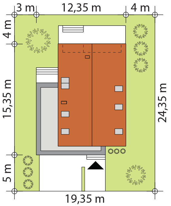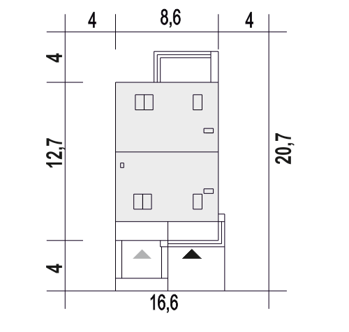 Nowoczesny, przytulny szeregowy dom na wąską działkę. Występuje też w formie bliźniaka lub bliźniaka z dwoma segmentami dwu-lokalowymi. Podstawowy moduł środkowy ma w osiach 540cm.