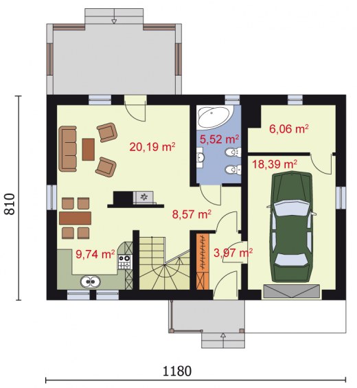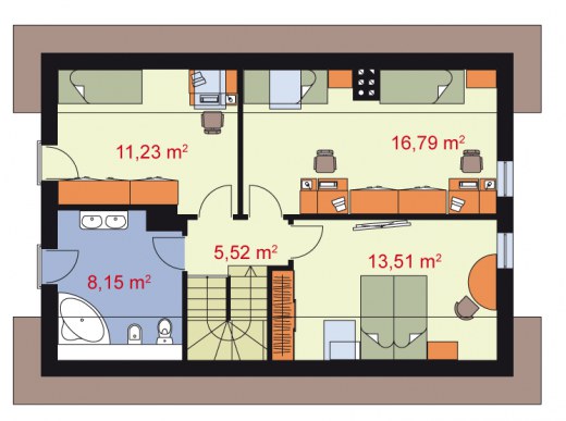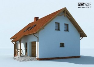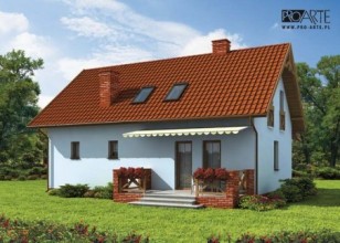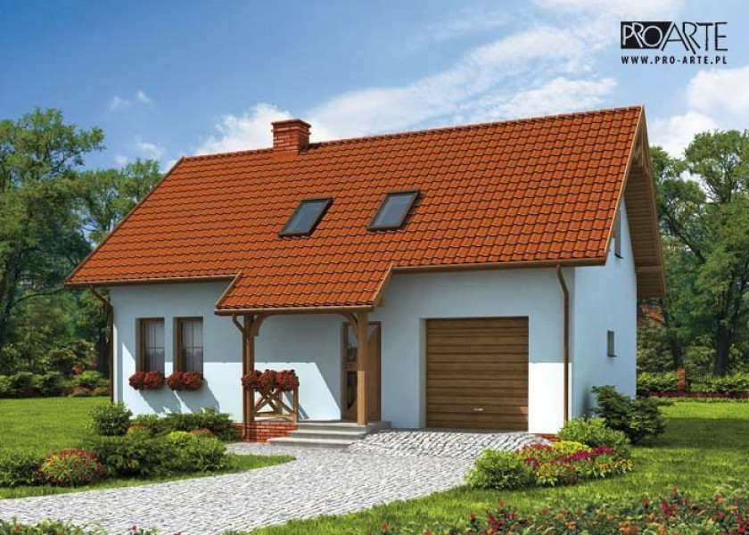 Trypolis - dom jednorodzinny z poddaszem użytkowym i garażem.Niewielki niepodpiwniczony domek jednorodzinny, niezwykle przemyślany i niedrogi w utrzymaniu. Z przodu domu znajduje się wjazd do garażu oraz wejście główne, umieszczone w centralnej części elewacji frontowej pod niewielkim zadaszeniem. Tył domu natomiast został zaprojektowany tak, by powstał tam wspaniały taras, który będzie stanowił doskonałe miejsce odpoczynku w ciepłe dni. Dach został zakończony na takiej wysokości, by możliwe była osłona tarasu poprzez zamontowanie dodatkowej markizy. Pokonawszy kilka schodków możemy skorzystać z głównego wejścia do domu. Znajdziemy się wówczas od razu w wiatrołapie, z którego będziemy mogli przejść do jednostanowiskowego garażu połączonego przejściem z kotłownią. Dom można podzielić na część dzienną umieszczoną na parterze i nocną – na piętrze. W części dziennej centralnym miejscem życia rodzinnego będzie zapewne pokój z kominkiem. Dodatkowym atutem pokoju dziennego jest wyjście na taras. Do ściany północnej parteru przylega niewielka łazienka z miejscem na kabinę prysznicową. Kuchnia została umiejętnie połączona z otwartą jadalnią umieszczoną przy jedynym oknie parteru, wychodzącym na zachód. Wspaniałym doświadczeniem dla mieszkańców domu będzie widok zachodzącego słońca, obserwowany, w zależności od pory roku, przy podwieczorku lub kolacji. Poddasze natomiast zostało wyposażone w ogromną łazienkę z wanną, posiadającą, podobnie, jak pokój obok, wyjście na niewielki balkon. Na poddaszu mamy jeszcze dodatkowo dwa pokoje, które możemy urządzić w zależności od potrzeb i gustu domowników. Ten dom jest niewątpliwie komfortowym rozwiązaniem dla czteroosobowej rodziny. Będzie stanowił spełnienie marzeń o własnym, niedrogim, rodzinnym gnieździe.Projekt składa się z części architektonicznej, konstrukcyjnej, wewnętrznych instalacji sanitarnych i instalacji elektrycznej. W projekcie załączone są podstawowe zestawienie stali, drewna i stolarki okienno-drzwiowej. Do projektu dołączamy bezpłatną zgodę na wprowadzenie zmian, oświadczenie projektantów o wykonaniu projektu zgodnie z obowiązującymi normami i przepisami oraz kserokopie uprawnień projektantów wraz z aktualnym wpisem do izby. W przypadku zamówienia projektu w technologii lekkiej, drewnianej konstrukcji szkieletowej, powierzchnia użytkowa budynku jest o około 7% większa. Wysokość ściany kolankowej 1.01m