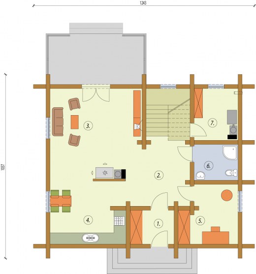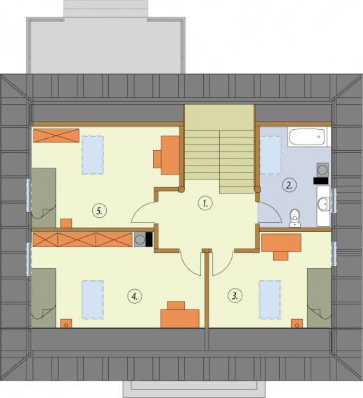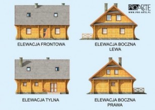 Santa Cruz - bale - dom z bali Urokliwy i ekologiczny dom w w technologii balowej, jego zwarta bryła wyróżnia się klasyczną prostotą i wyważonymi proporcjami. Szeroka wejściowa wnęka, symetrycznie rozmieszczone okna parteru i poddasza, dwuspadowy dach i zgrabna wiata tworzą efektowną całość. Na tyłach domu znajduje się taras, prowadzący bezpośrednio do ogrodu. Miejscem, gdzie koncentruje się życie domowników jest pokój dzienny połączony z kuchnią, w której wydzielono kącik jadalny. Na parterze jest także pomieszczenie idealne na zaciszny gabinet. Oprócz tego na parterze znajduje się łazienka i kotłownia, z której wchodzi się do praktycznego, przydatnego w każdym domu pomieszczenia gospodarczego, stamtąd zaś prowadzi wyjście na zewnątrz pod wiatę. Trzy kameralne i przytulne pokoje na poddaszu zapewnią mieszkańcom domu, tak potrzebną każdemu atmosferę spokoju i prywatności. Na górze jest także łazienka. Powierzchnię użytkową poddasza policzono do 1,9m. Santa Cruz to projekt, który łączy tradycję z nowoczesnością. Zastosowanie bali drewnianych nadaje konstrukcji uroku i naturalności. Realizacja tego projektu w górach, na wsi, nad jeziorem – pozwoli w pełni wydobyć piękno Santa Cruz z bali. Projekt składa się z części architektonicznej, konstrukcyjnej, wewnętrznych instalacji wod.-kan, c. o. i elektrycznej. W projekcie załączone są podstawowe zestawienie stali, drewna i stolarki okienno-drzwiowej. Do projektu dołączamy bezpłatną zgodę na wprowadzenie zmian, oświadczenie projektantów o wykonaniu projektu zgodnie z obowiązującymi normami i przepisami oraz kserokopie uprawnień projektantów wraz z aktualnym wpisem do izby. W przypadku zamówienia projektu w technologii lekkiej, drewnianej konstrukcji szkieletowej, powierzchnia użytkowa budynku jest o około 7% większa. Wysokość ściany kolankowej 1.20m
