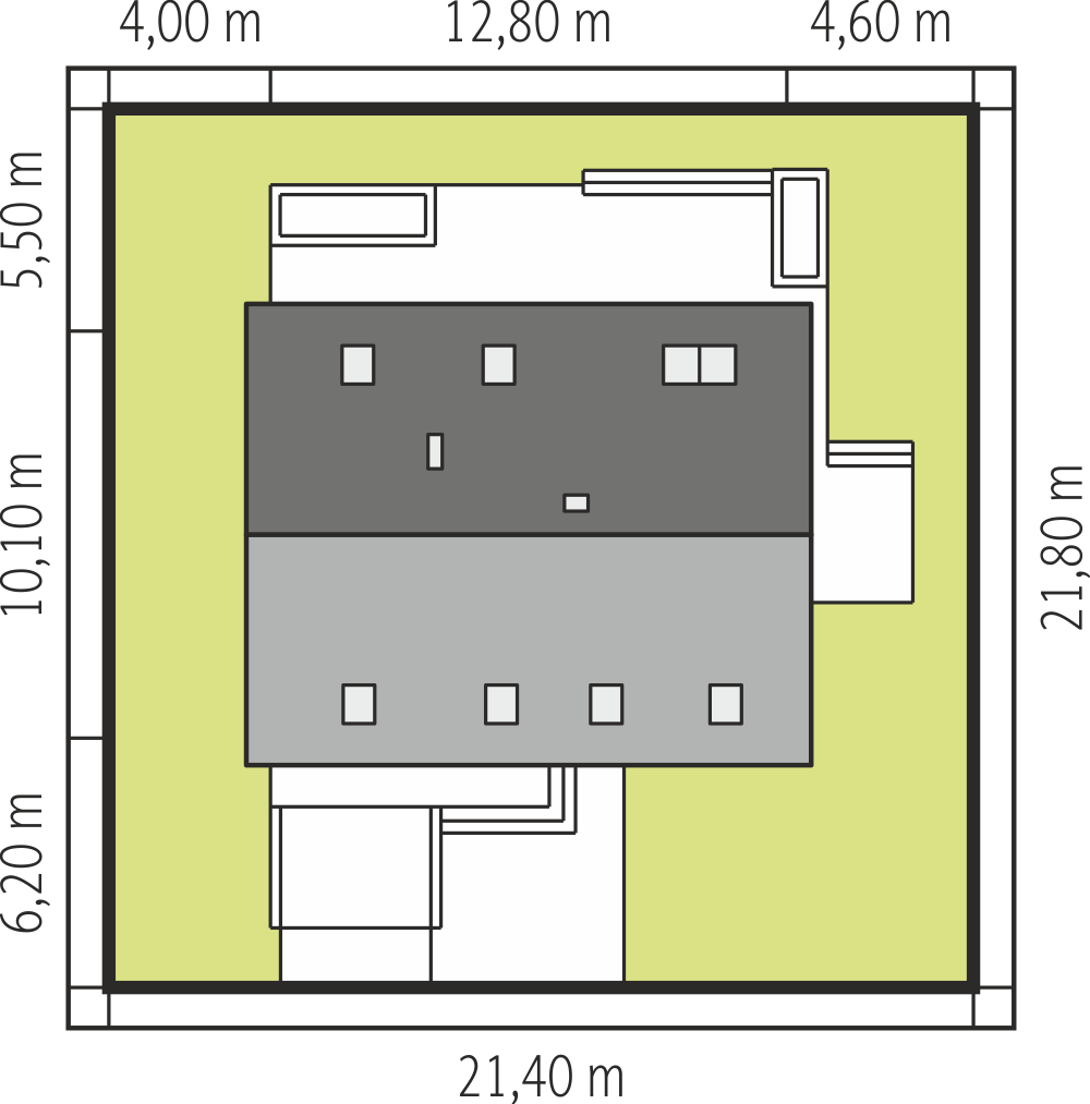 Rodzina Skarbka to projekty małych, tanich, prostych, funkcjonalnych domów. Zwarty prostopadłościan mieści w każdym z wariantów dwupoziomowe mieszkanie oraz garaż, który w wersjach z dwuspadowym dachem, jest wysunięty lekko pod opuszczonym okapem ku frontowi. Sukces koncepcji i rosnące zapotrzebowanie na przestrzeń spowodowały, że powstał projekt domu Skarbek Polo, większy od pozostałych, zaliczany już zdecydowanie do domów średniej wielkości. Rzut wydłużono, a na parterze zaproponowano, oprócz przestronnego rozwiązania z otwartym pokojem dziennym, niewielki gabinet. Część gospodarcza ma wyjątkowo wygodny, szeroki garaż z dużą kotłownią. Cztery pokoje na poddaszu, łazienka i pralnia są jeszcze bardziej komfortowe, a główna sypialnia zyskała garderobę. Projekt Skarbek Polo, proponuje prosty detal architektoniczny, elewacje bez balkonów są energooszczędne ale dzięki wysokim oknom z barierką doświetlającym poddasze eleganckie. Nowością w rodzinie są efektowne, narożne przeszklenia w jadalni i salonie. Dzięki nim skromna sylwetka Skarbka nabiera nowoczesnego i jednocześnie bar-dziej reprezentacyjnego wyrazu.