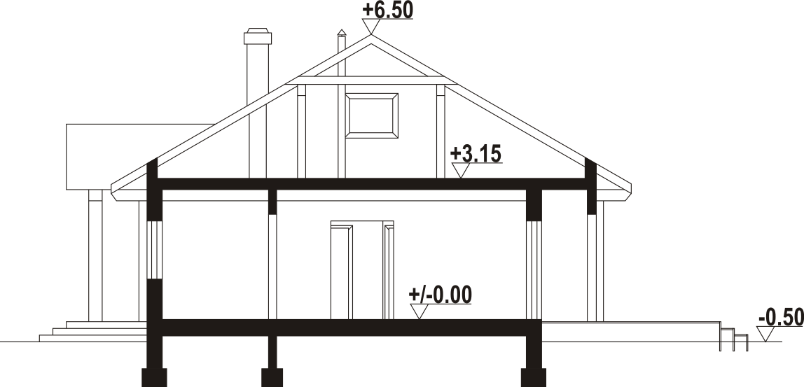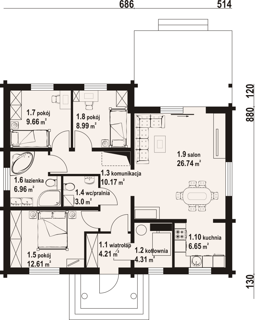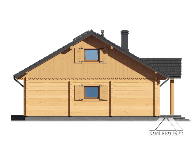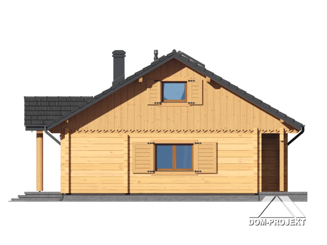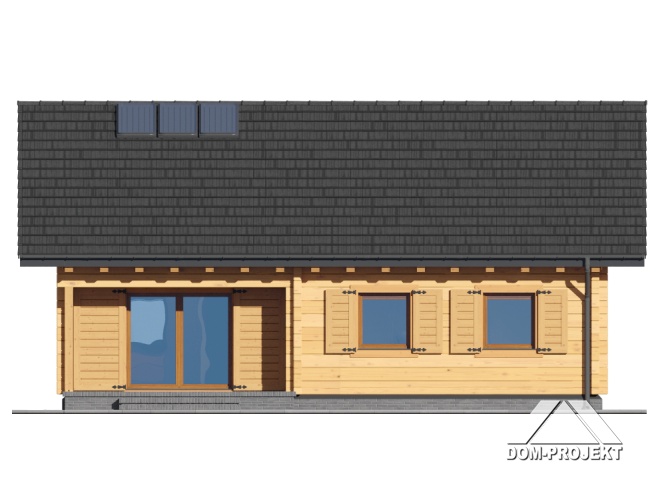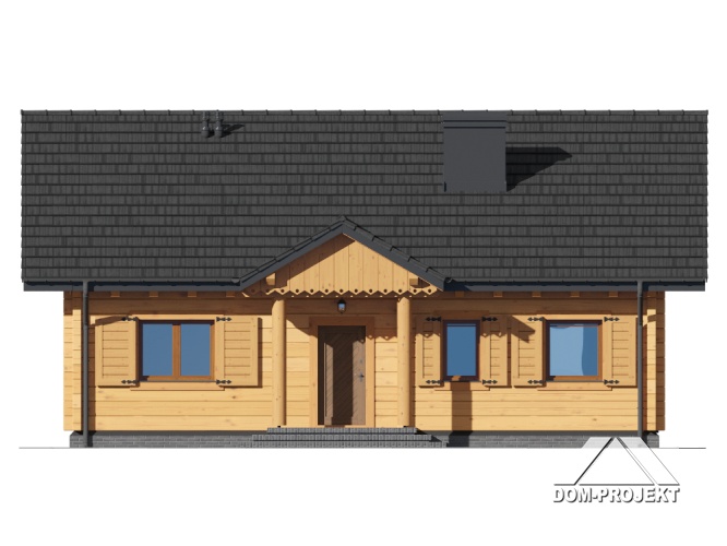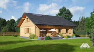 Dom z bali drewnianych. Duży salon z aneksem kuchennym, kominkiem i wyjściem na taras. Trzy pokoje, łazienka, wc, komunikacja, wiatrołap i kotłownia. Wyjście na poddasze schodami strychowymi rozkładanymi.