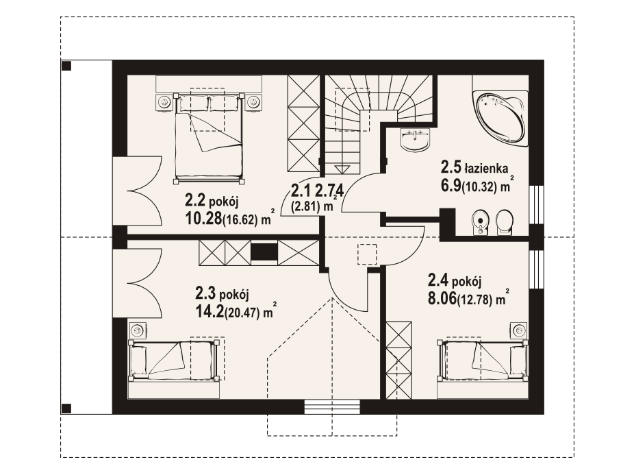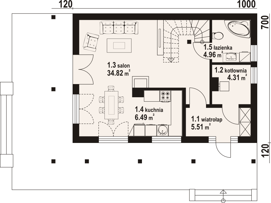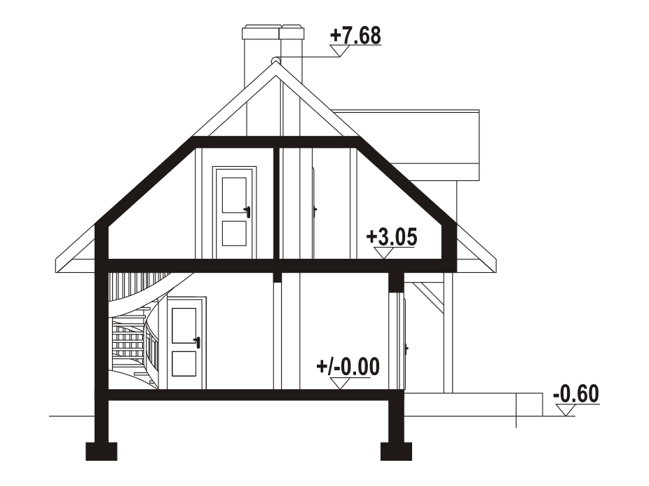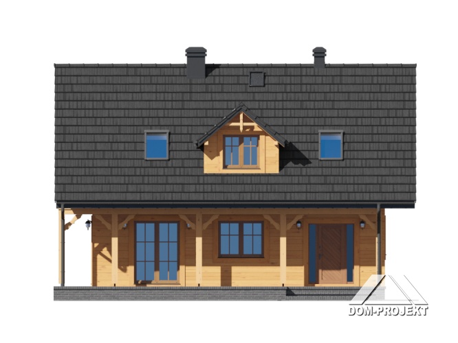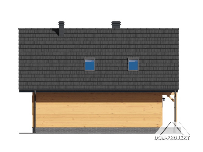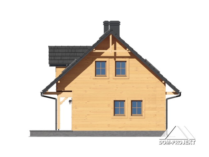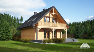 Niewielki dom z poddaszem użytkowym. Parter to część dzienna: salon z aneksem kuchennym i wyjściem na duży, częściowo zadaszony taras zewnętrzny. Kominek w salonie. Wydzielona kotłownia. Na poddaszu trzy pokoje - sypialnie i łazienka.