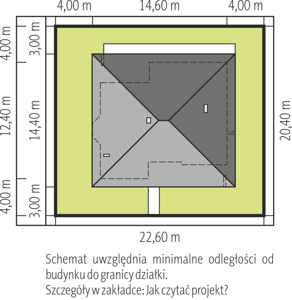 Przestronny parterowy dom z nieużytkowym poddaszem (strych) i dobudowaną częścią mieszczącą dwustanowiskowy garaż z kotłownią. Na parterze duży salon z kominkiem i wykuszem, oraz trzy pokoje. Schody na strych prowadzą z wiatrołapu.