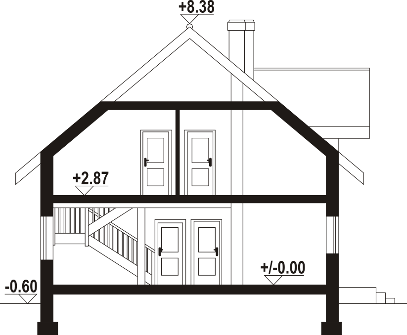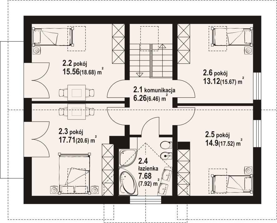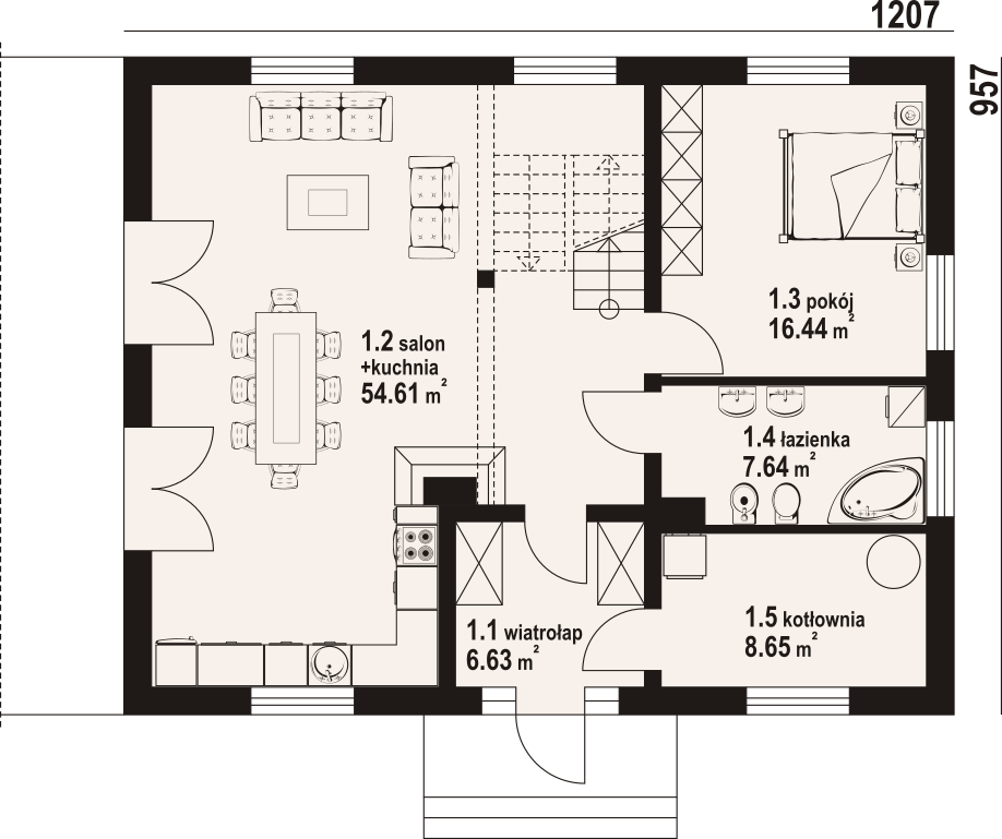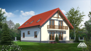 Dom z poddaszem użytkowym. Na parterze przestronny salon tworzy wspólną przestrzeń z aneksem kuchennym . W salonie kominek z możliwością rozprowadzenia ciepła. Na parterze także pokój oraz wydzielona kotłownia. Na poddaszu cztery sypialnie i łazienka.