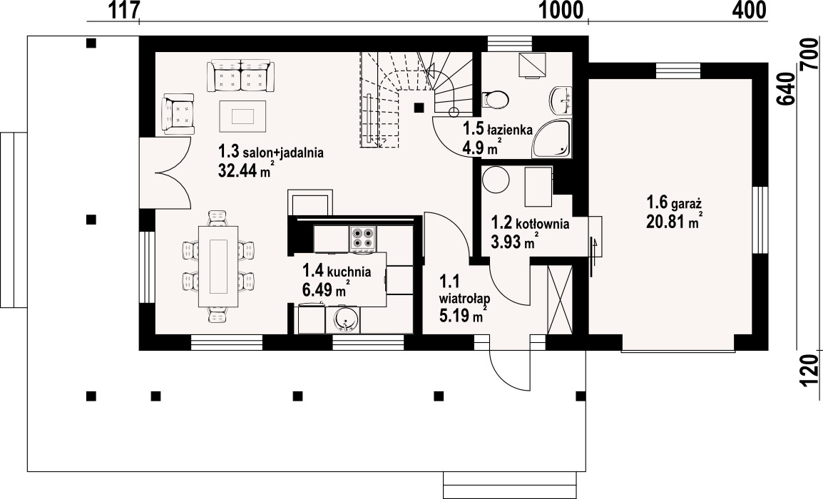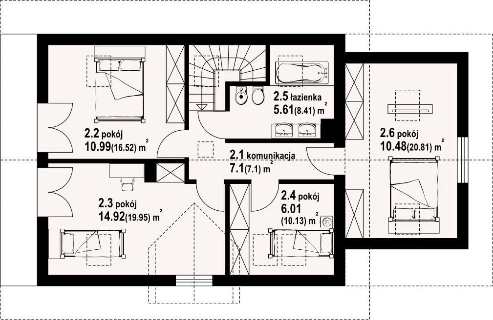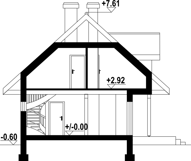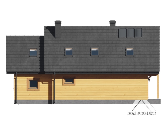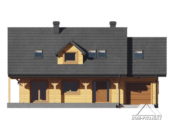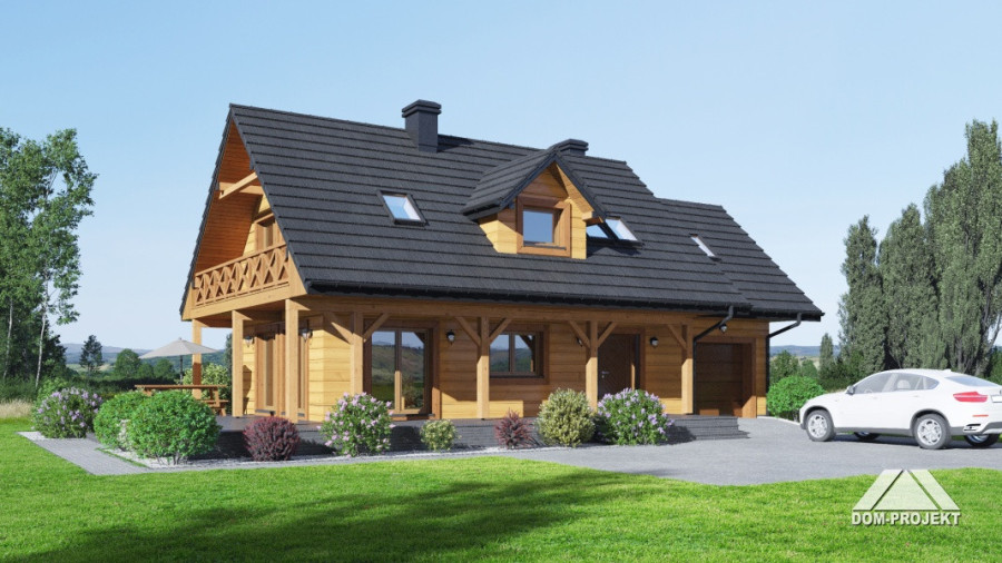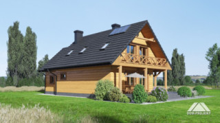 Nieduży, zgrabny dom z poddaszem mieszkalnym. W części dziennej na parterze salon z jadalnią, kominkiem i schodami na poddasze. Wydzielona kuchnia. Na poddaszu cztery sypialnie. W części gospodarczej domu kotłownia i jednostanowiskowy garaż. Częściowo zadaszony, duży taras.