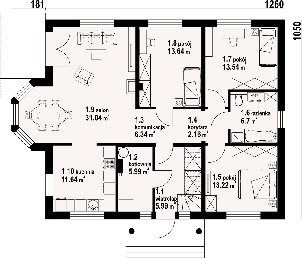 Niewielki parterowy dom z atrakcyjnym wykuszem w salonie. W salonie również kominek z możliwością rozprowadzenia ciepła. Trzy sypialnie, kuchnia, łazienka i wydzielona kotłownia. Z wiatrołapu schody na strych.