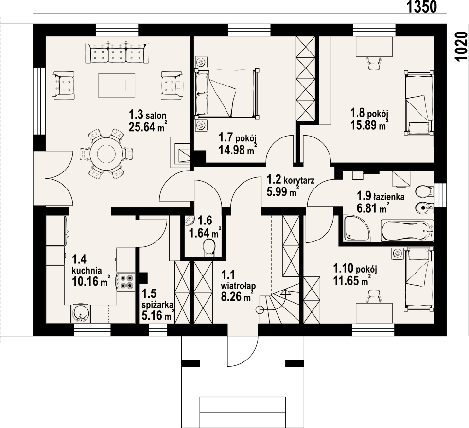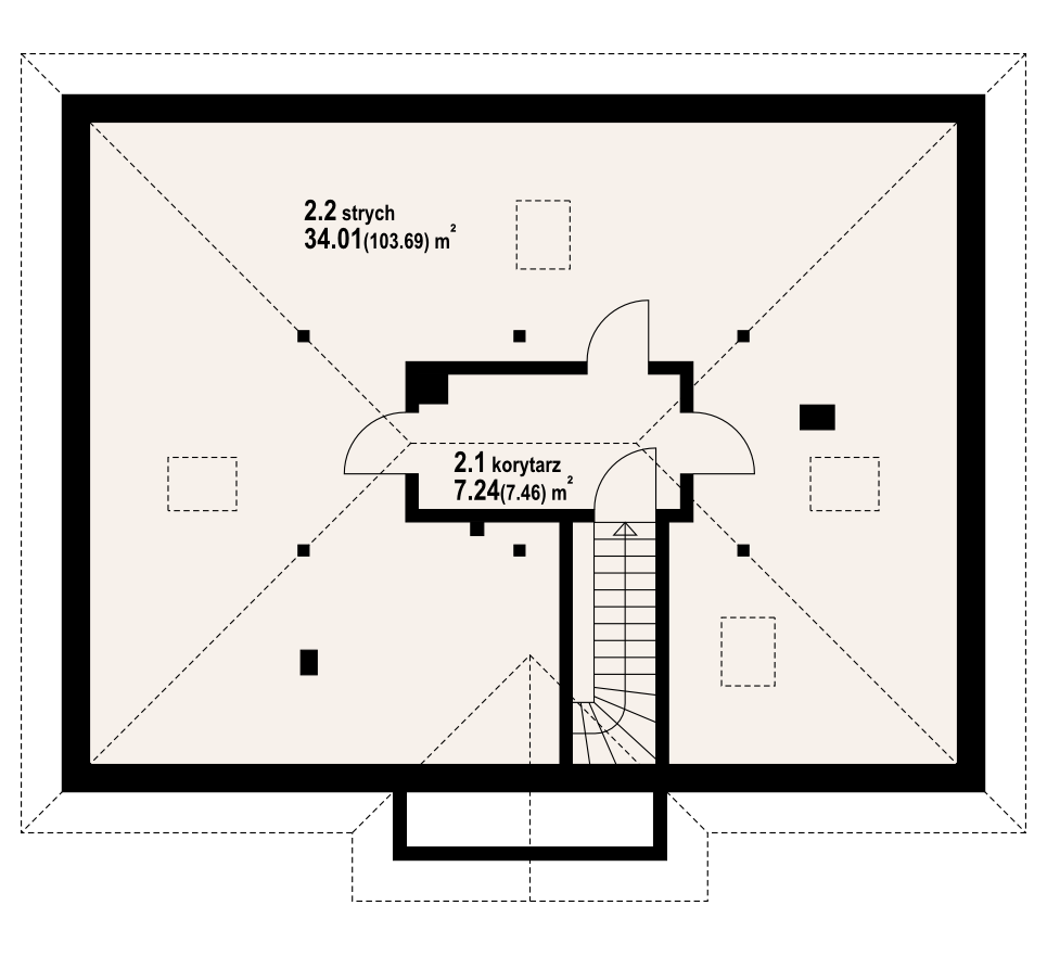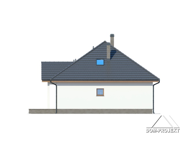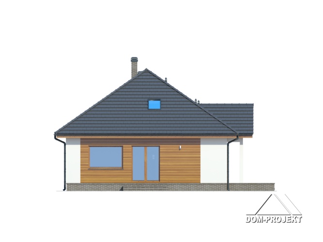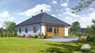 Niewielki, ładny i ekonomiczny dom parterowy. Podstawowym pomieszczeniem jest połączony z półotwartą kuchnią salon, zaprojektowano także trzy pokoje i łazienkę. W wiatrołapie usytuowano schody prowadzące na poddasze-strych. Istnieje możliwość wykorzystania tej powierzchni.