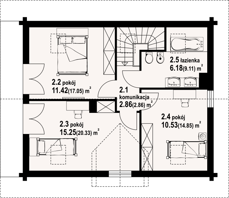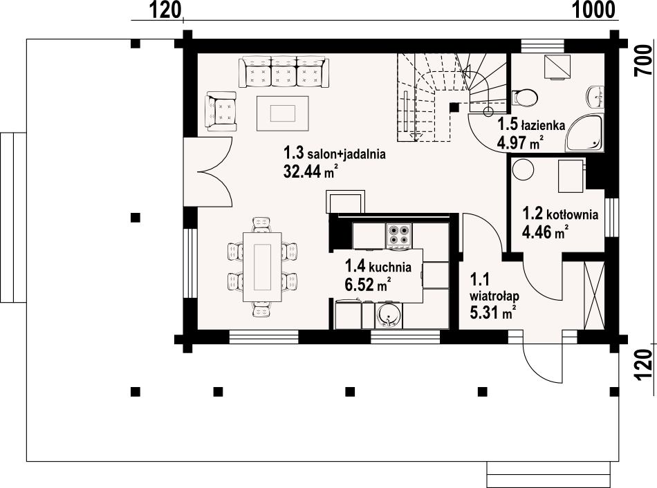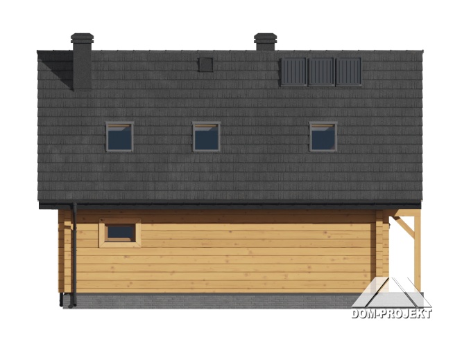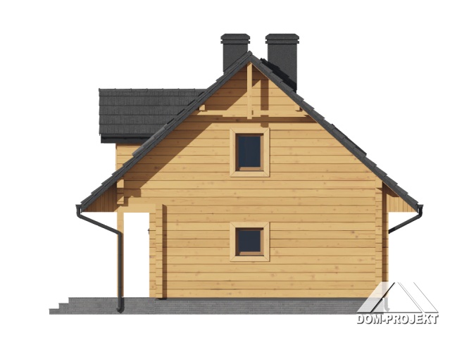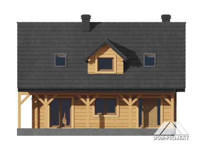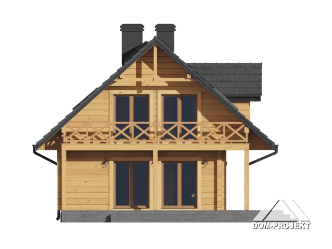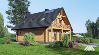 Dom z bali drewnianych. Zewnętrzny wygląd tradycyjny, układ funkcjonalny wewnątrz współczesny. 4 pokoje, 2 łazienki, aneks kuchenny, kotłownia, wiatrołap. Duży salon z aneksem kuchennym, schodami na poddasze, kominkiem i wyjściem na taras. Liczne wersje projektu.