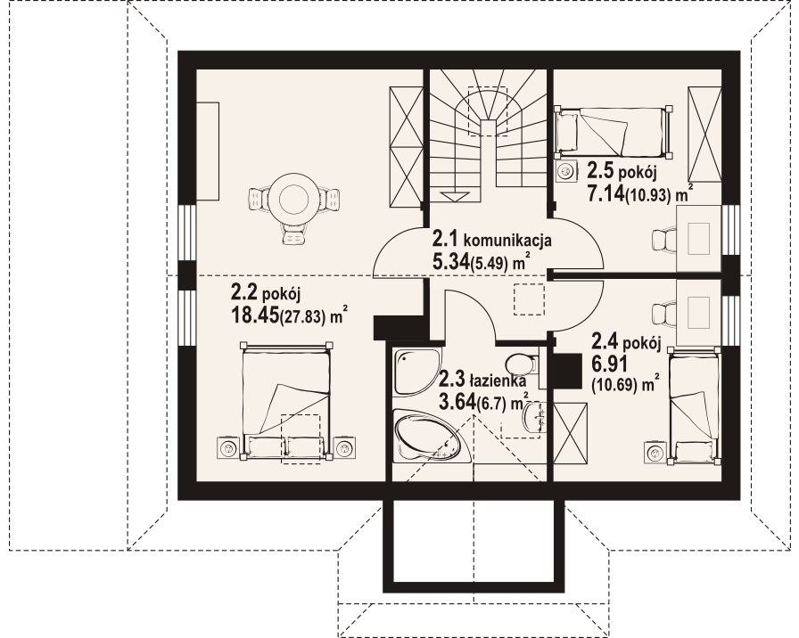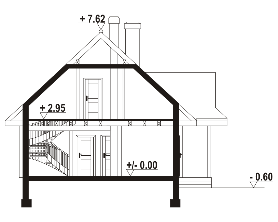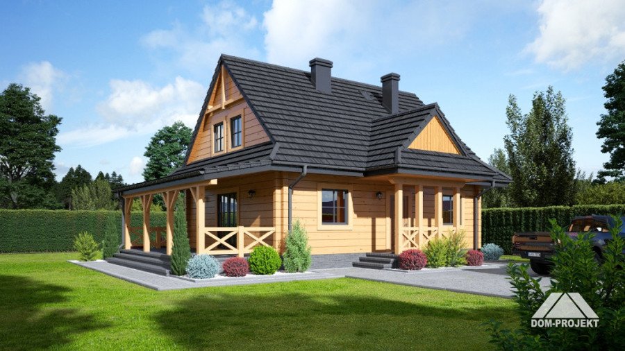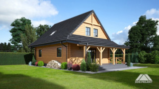 Dom o atrakcyjnej architekturze nawiązującej do tradycji domów góralskich. Na niedużej powierzchni zaprojektowano cztery pokoje, otwarty na kuchnię duży salon, dwie łazienki i kotłownię. W salonie kominek i wyjście na spory, zadaszony taras.