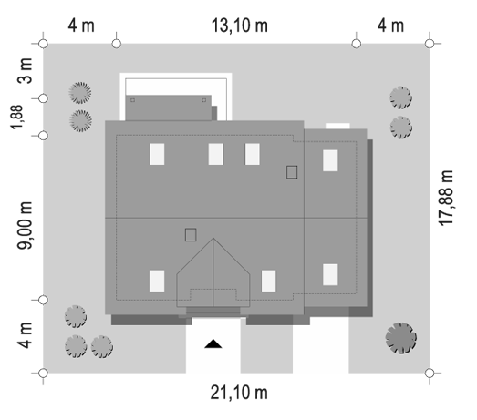 Nieduży dom parterowy, którego podstawowym pomieszczeniem jest salon z dostępną z niego częściowo zamkniętą kuchnią. W narożu salonu znajduje się kominek, a na przeciwległej ścianie wyjście na duży taras. Trzy sypialnie, łazienka, pom. wc i wydzielona kotłownia uzupełniają program funkcjonalny domu.