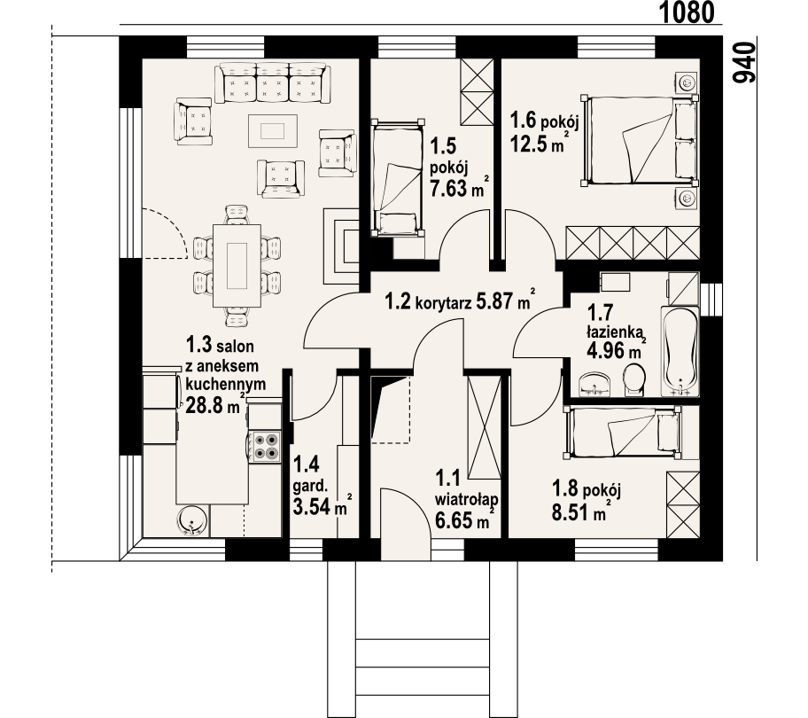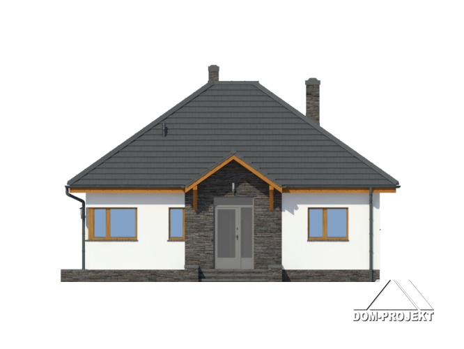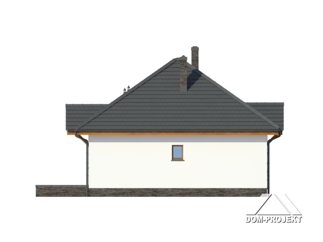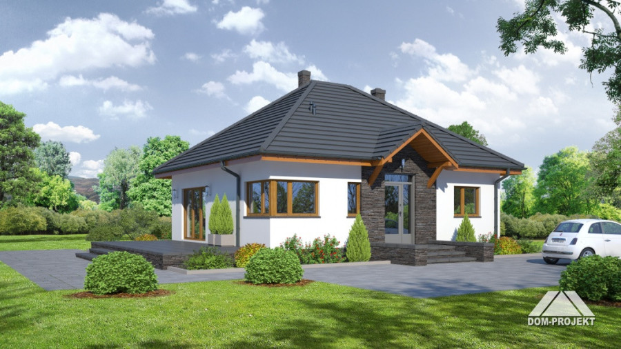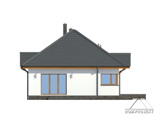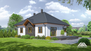Ekonomiczny w realizacji oraz późniejszym użytkowaniu dom parterowy. Funkcjonalnie, na niedużej powierzchni zaprojektowany następujący program użytkowy: salon z aneksem kuchennym, trzy sypialnie, łazienka i pom. gospodarcze.
