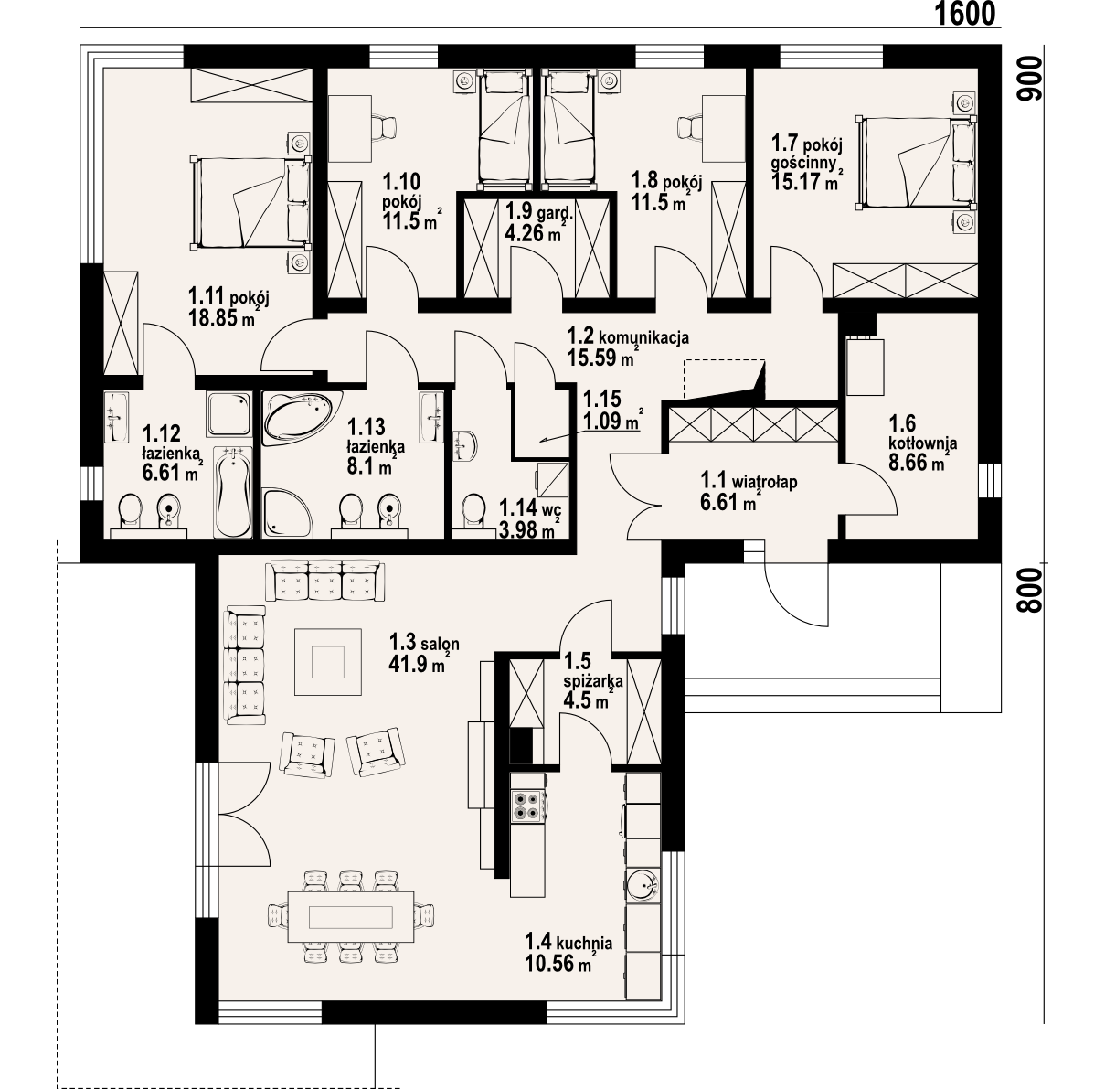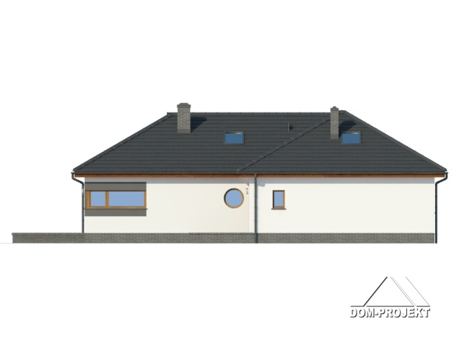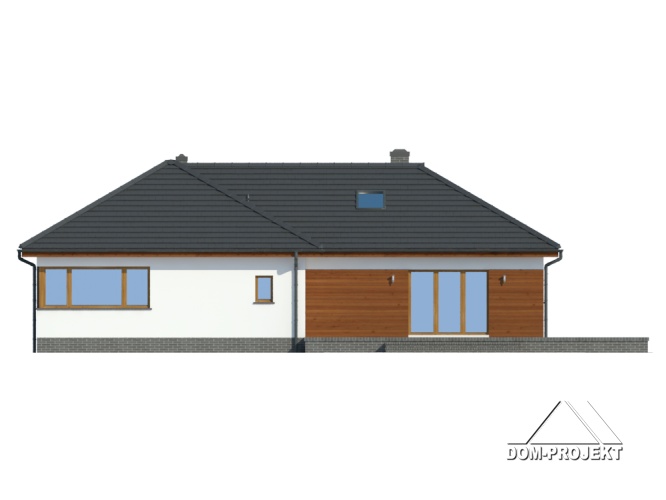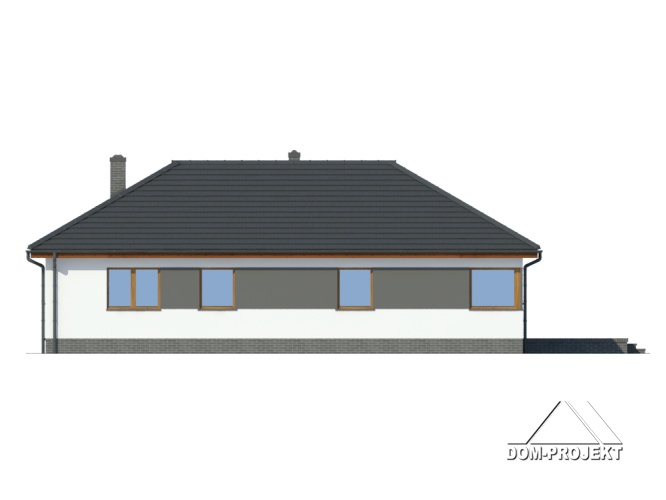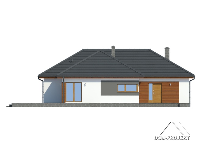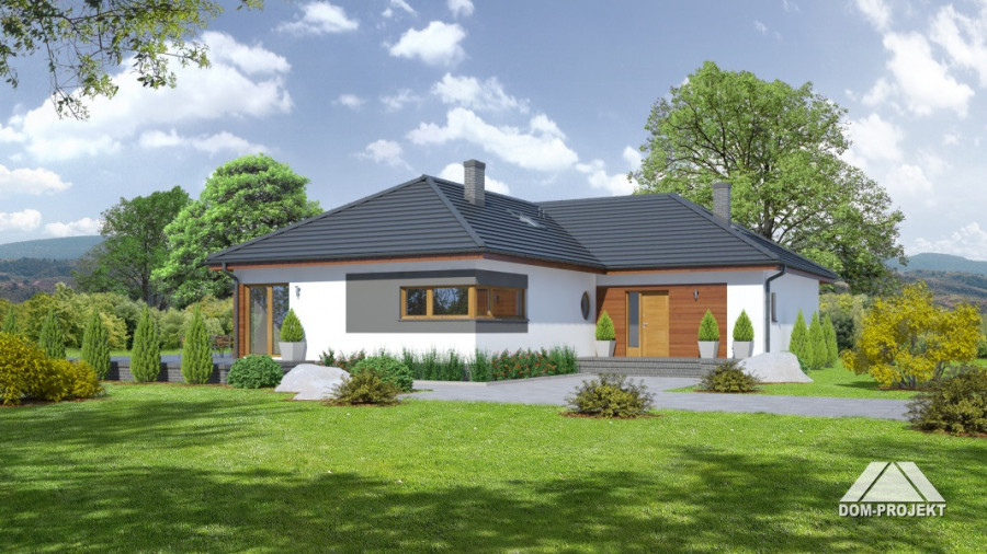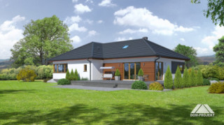 Nowoczesny dom parterowy którego głównym pomieszczeniem jest przestronny, słoneczny salon z kominkiem i wyjściem na taras. Z salonu dostępny aneks kuchenny ze spiżarką. Cztery sypialnie, dwie łazienki, garderoba oraz kotłownia doskonale uzupełniają program funkcjonalny domu.