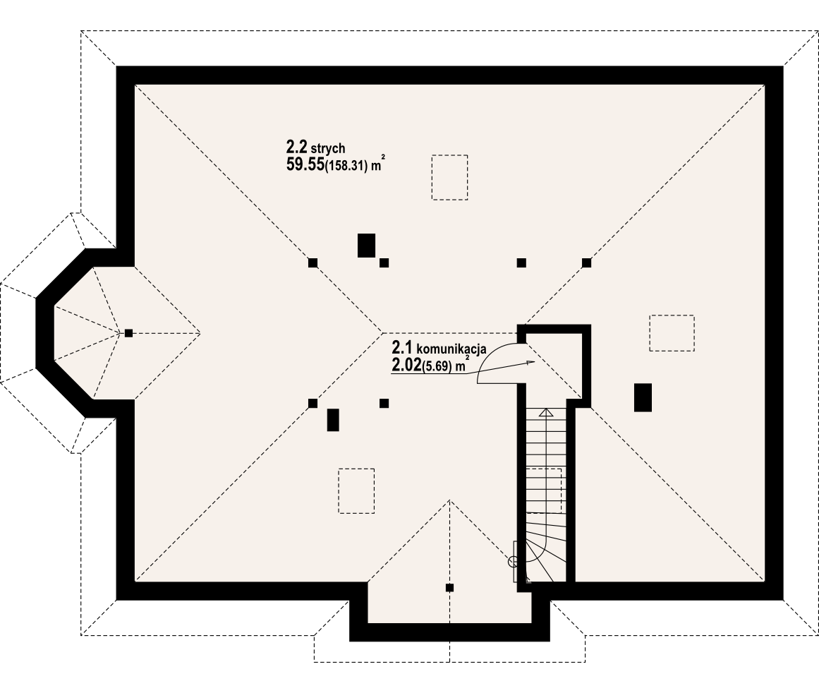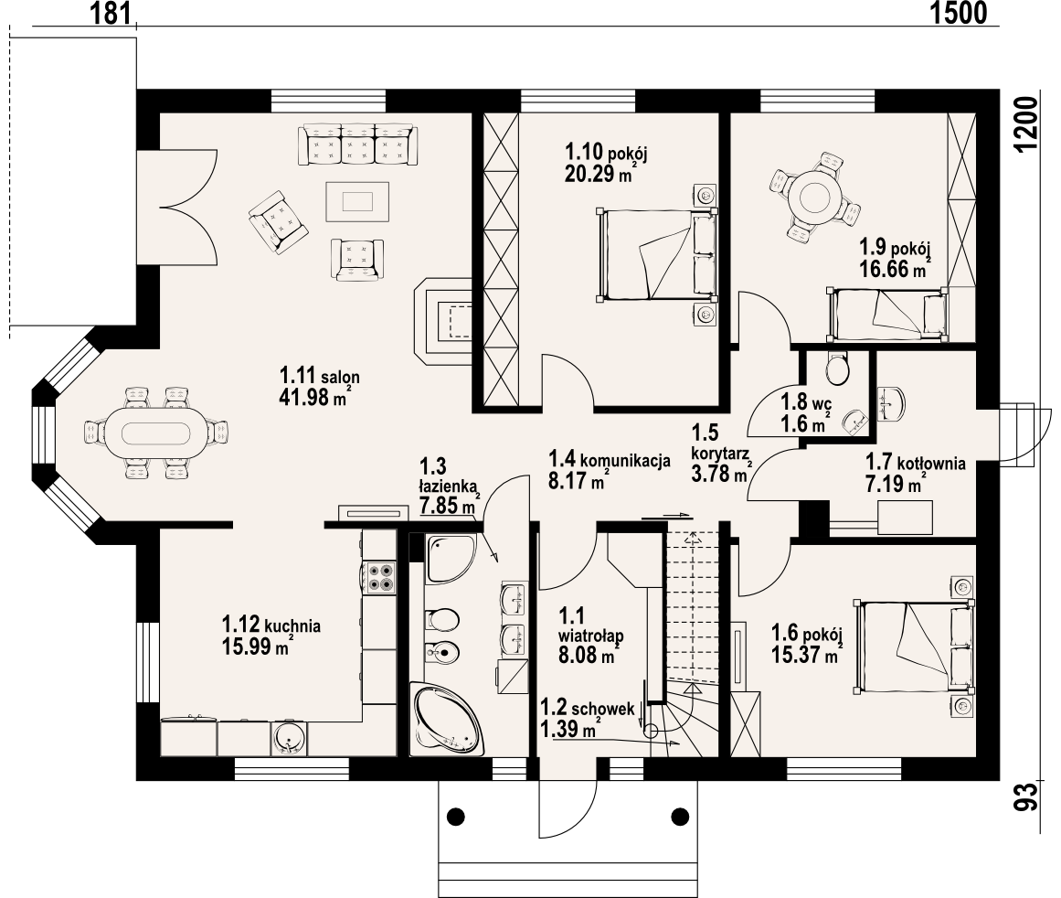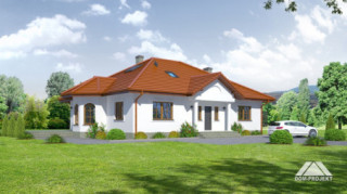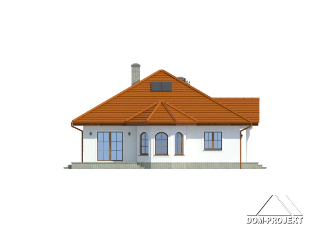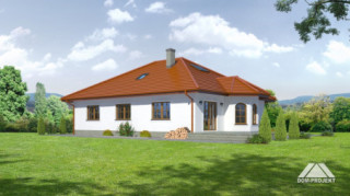 Wygodny dom parterowy. Duży salon z kominkiem, wyjściem na taras i szerokim przejściem do kuchni. Trzy pokoje, łazienka, wc, kotłownia, korytarz i wiatrołap. Z wiatrołapu schody na poddasze. Możliwość łatwego wykorzystania poddasza na cele mieszkalne.