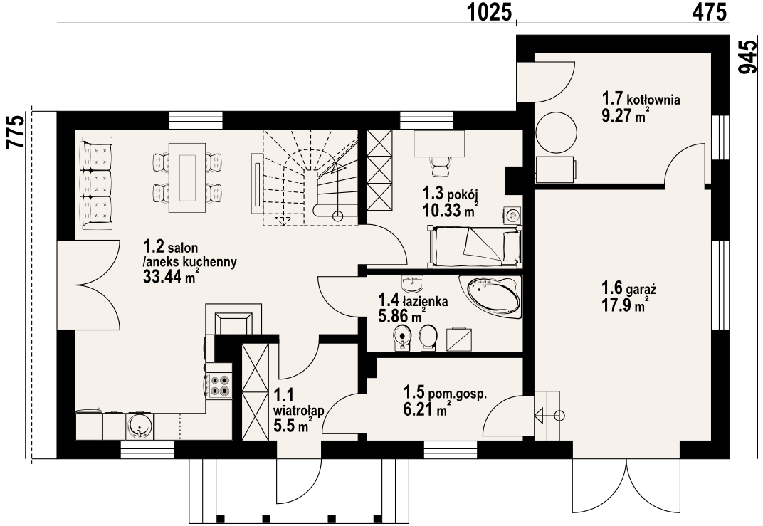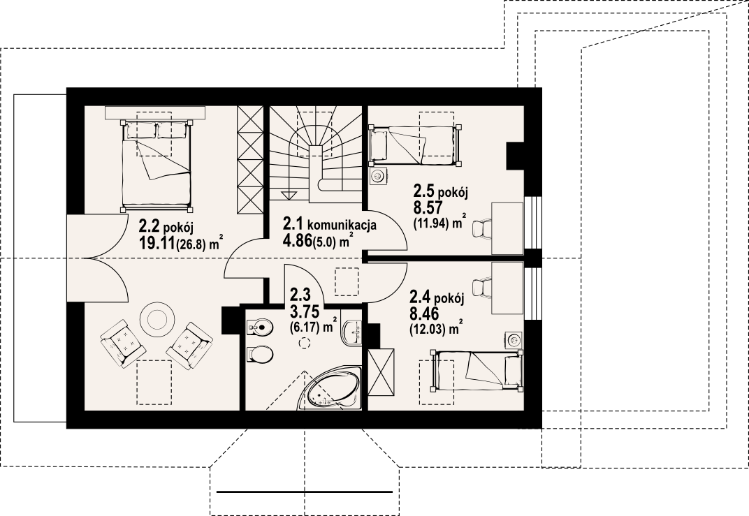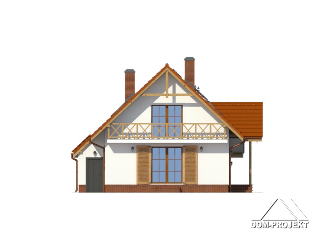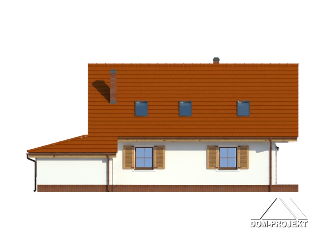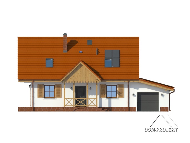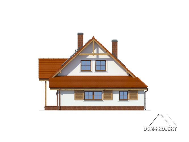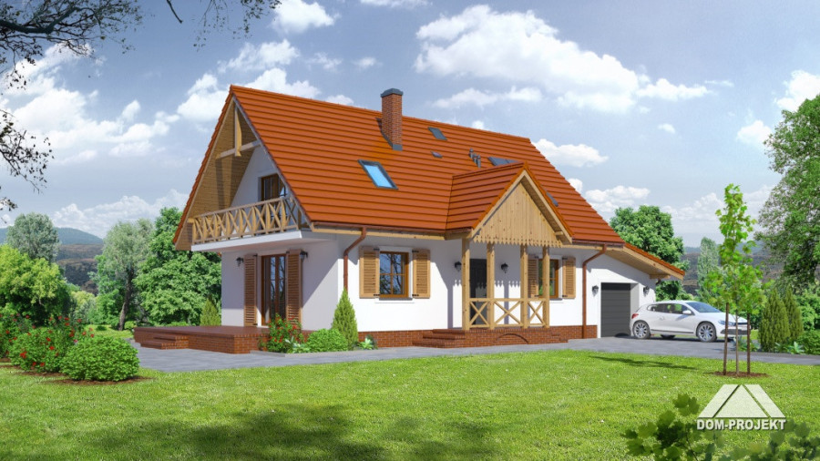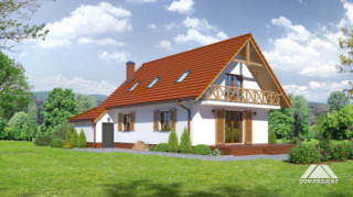Dom dla 4-5 osobowej rodziny. Duży salon z aneksem kuchennym, kominkiem, wyjściem na taras i schodami na poddasze. Pokój, łazienka, wiatrołap, pomieszczenie gospodarcze,garaż, kotłownia. Na poddaszu trzy pokoje, łazienka i komunikacja. Największy pokój poddasza ma balkon. Zwarta bryła budynku sprzyja szybkiej i taniej budowie oraz niskim kosztom realizacji.