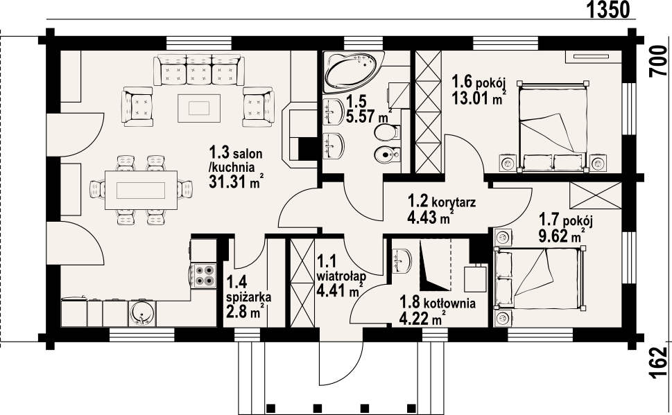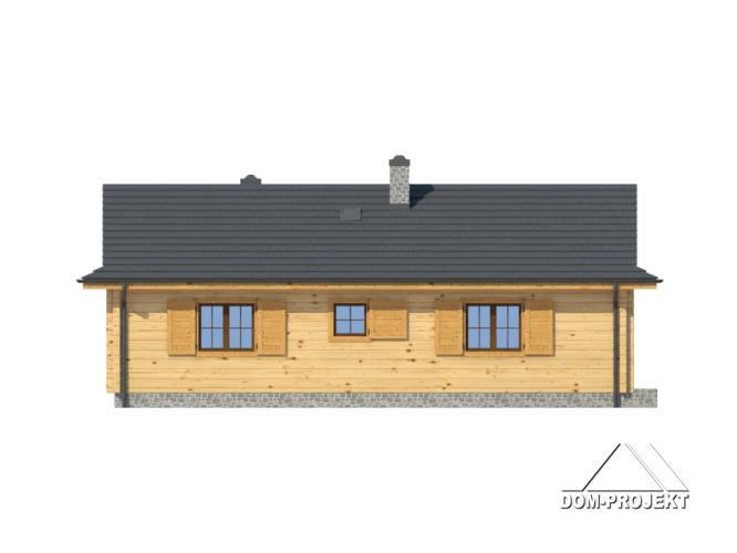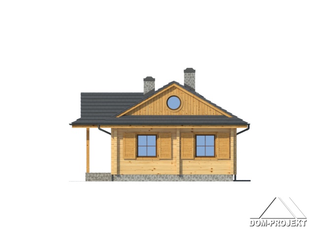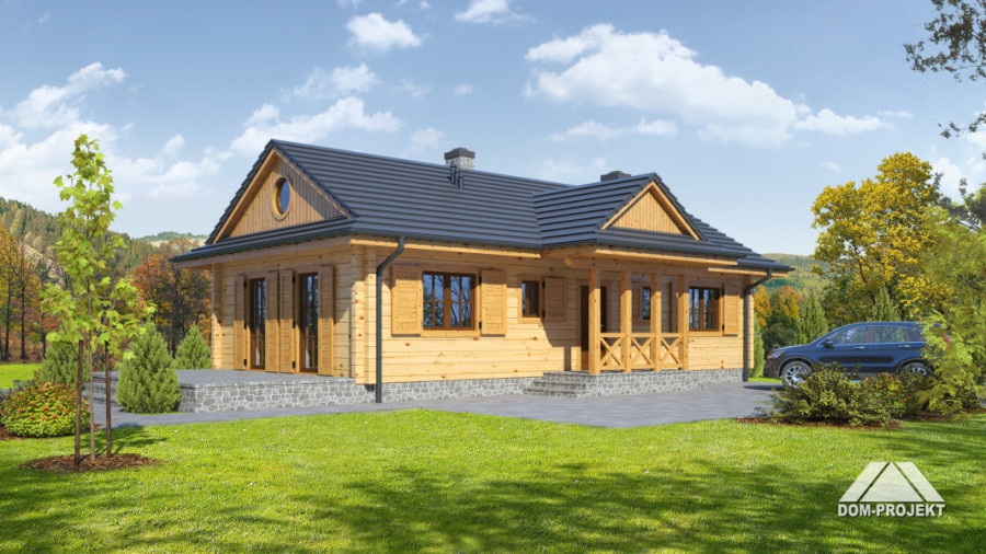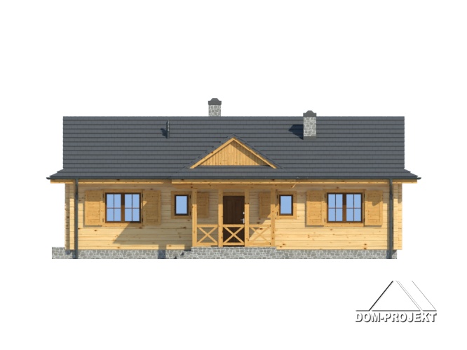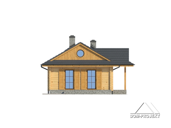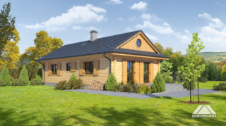 Dom z bali drewnianych.Architektura nawiązuje do domów góralskich. Duży salon z aneksem kuchennym, kominkiem i wyjściem na taras. Dwa pokoje, łazienka, spiżarka, wiatrołap i kotłownia. W kotłowni schody rozkładane na poddasze. Poddasze nieużytkowe.