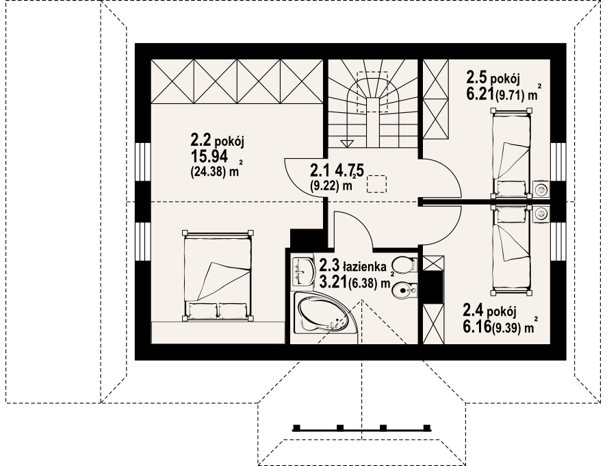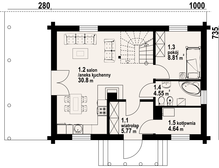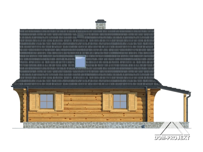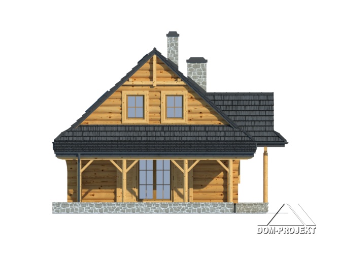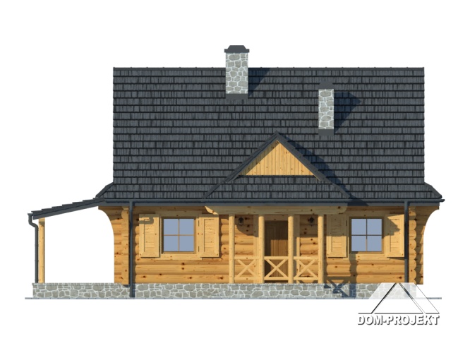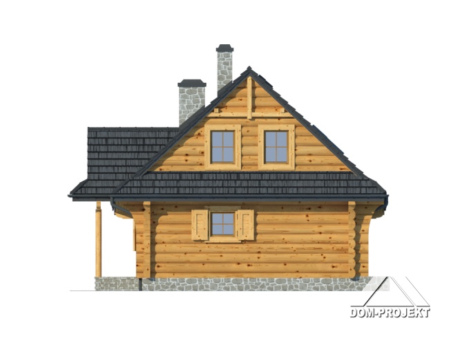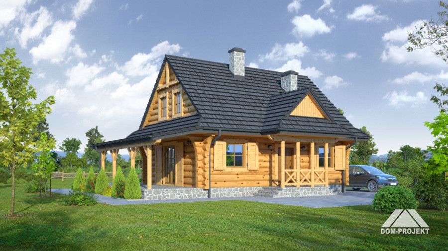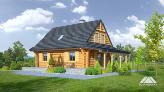 Dom z bali drewnianych. Architektura nawiązuje do tradycyjnych domów góralskich. Duży salon z aneksem kuchennym, kominkiem, wyjściem na zadaszony taras i schodami na poddasze. Pokój, łazienka, wiatrołap i kotłownia. Na poddaszu trzy pokoje, łazienka i komunikacja.