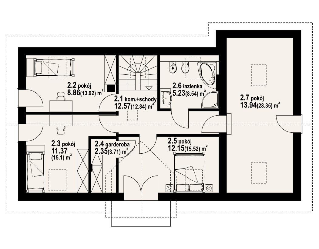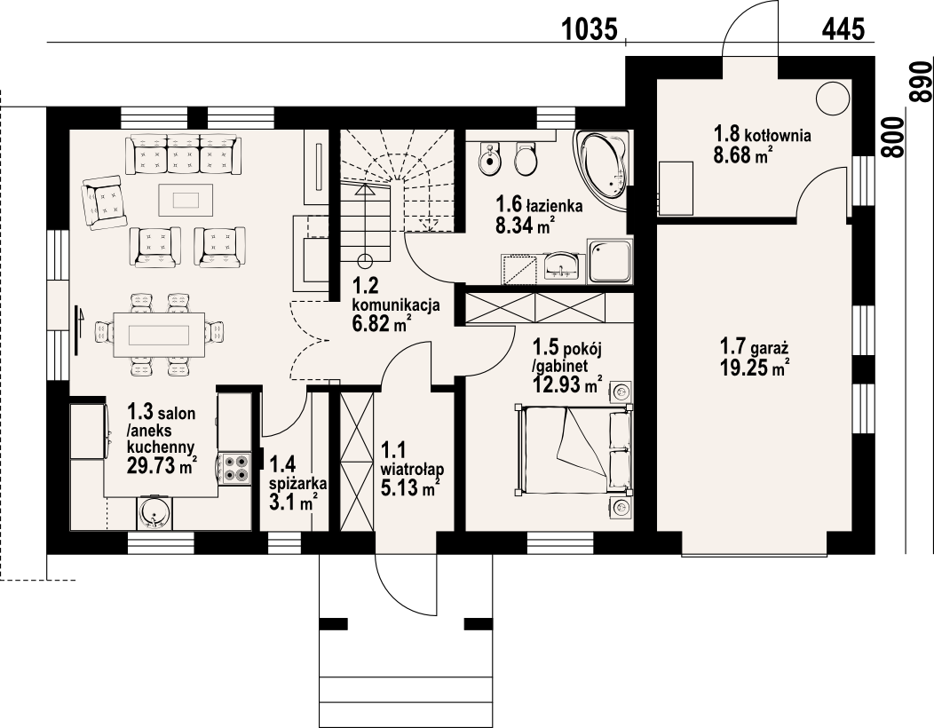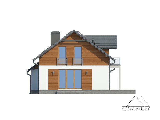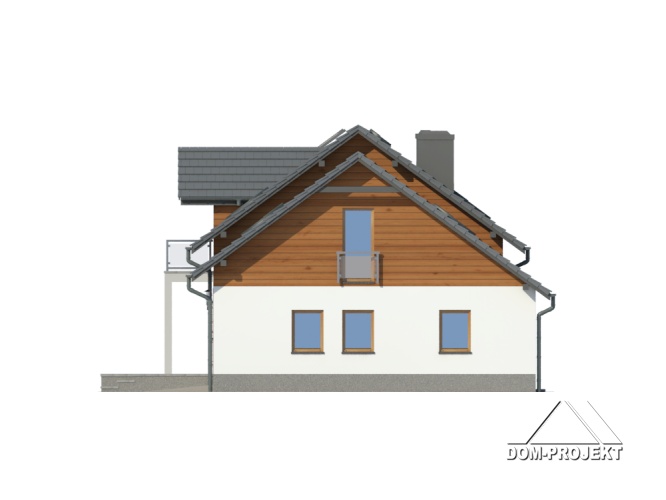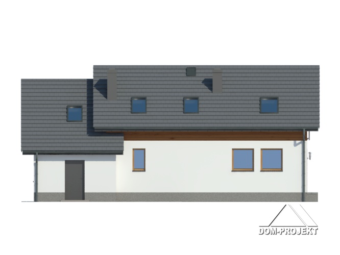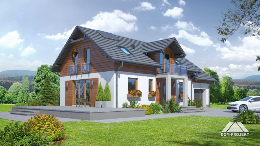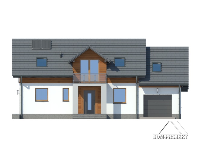 Dom z poddaszem, garażem i kotłownią Duży salon z aneksem kuchennym, kominkiem i wyjściem na taras. Pokój, łazienka, wiatrołap, komunikacja i spiżarka. Garaż i kotłownia. Na poddaszu cztery pokoje, łazienka, garderoba i komunikacja. Zwarta bryła budynku i dach dwuspadowy sprzyjają szybkiej i taniej budowie i niskim kosztom eksploatacji.