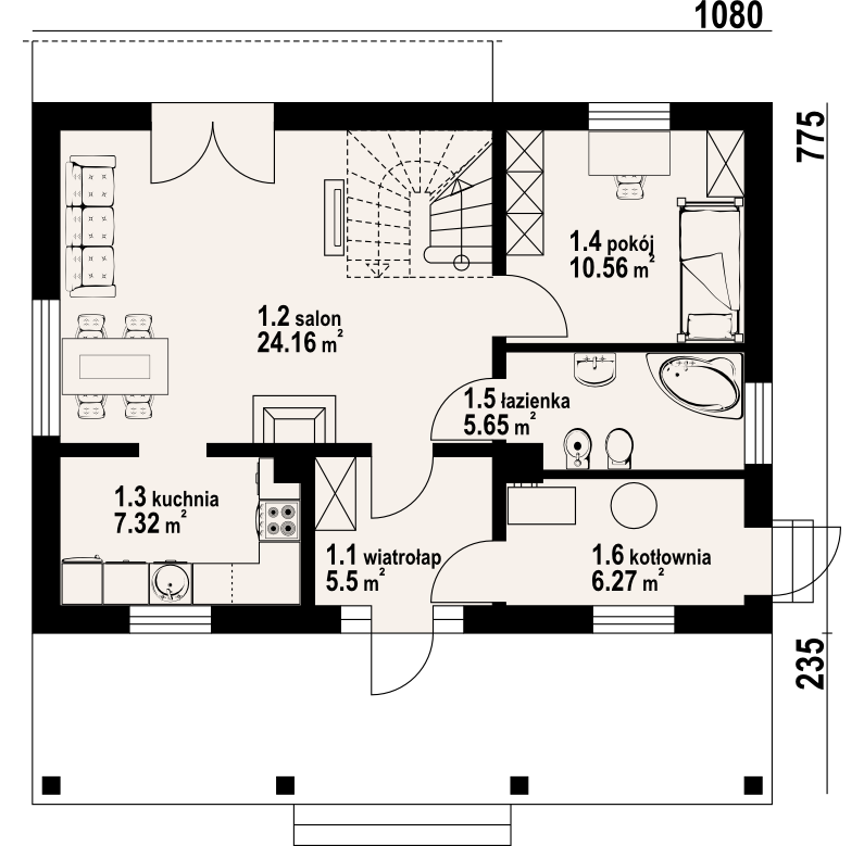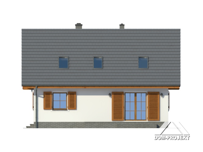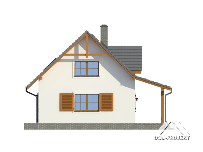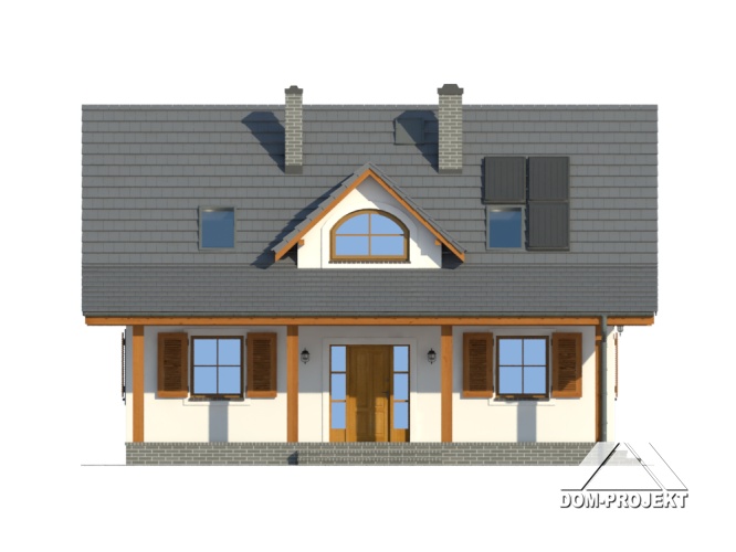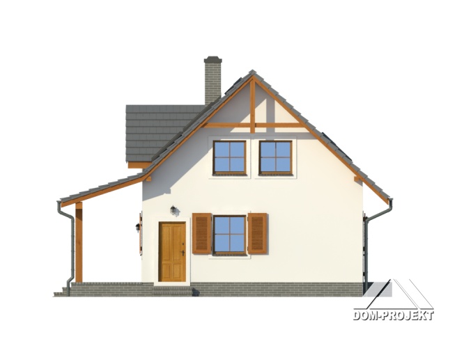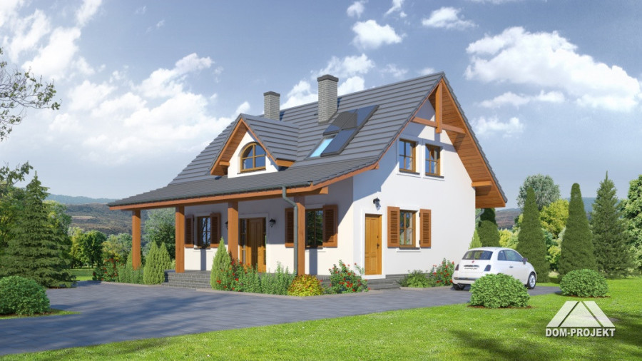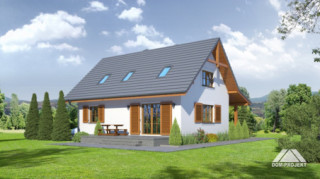 Wygodny dom z poddaszem użytkowym. Duży salon z aneksem kuchennym, kominkiem i wyjściem na taras. Pokój, komunikacja, wiatrołap, łazienka, kotłownia. Na poddaszu trzy pokoje, łazienka, garderoba i komunikacja. Prosta bryła budynku i dach dwuspadowy sprzyjają taniej i szybkiej budowie i niskim kosztom eksploatacji.