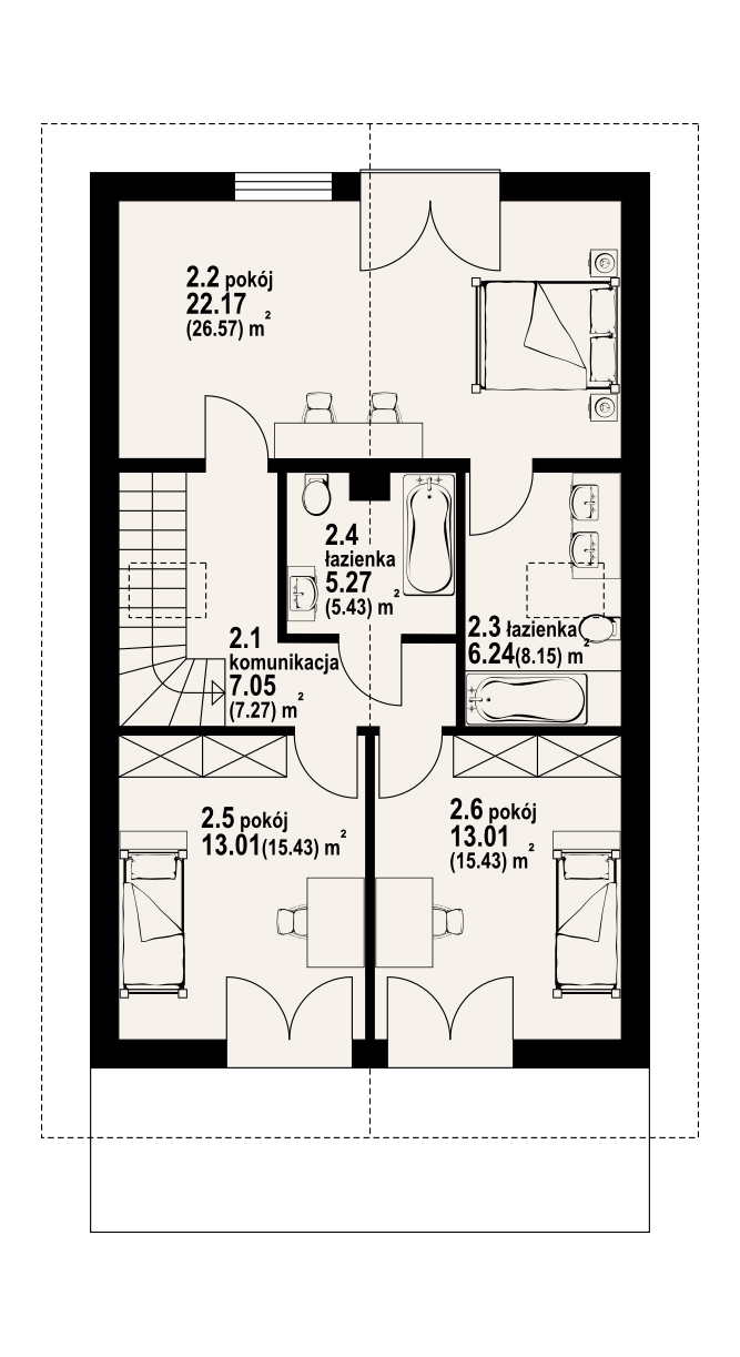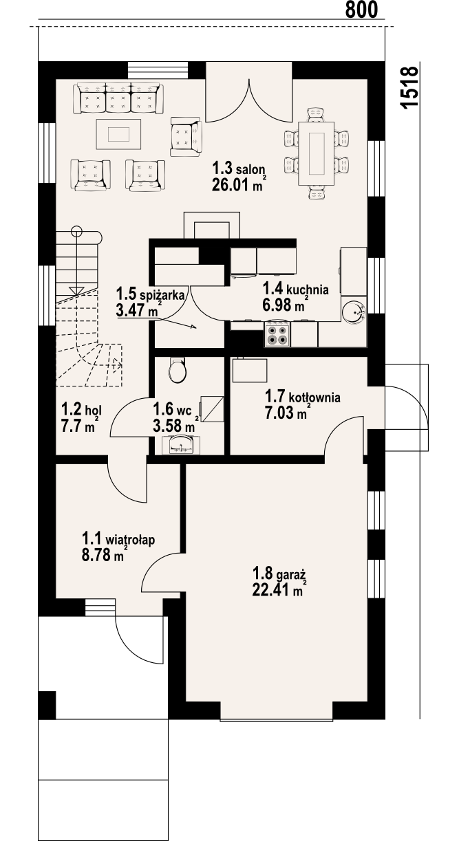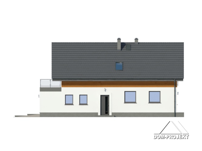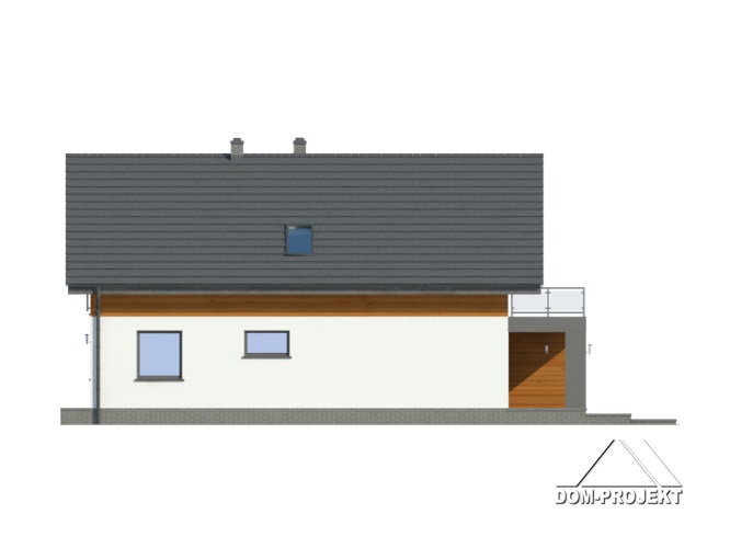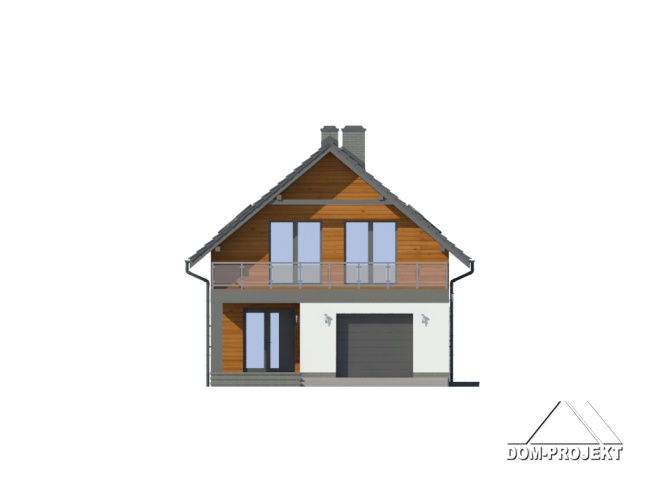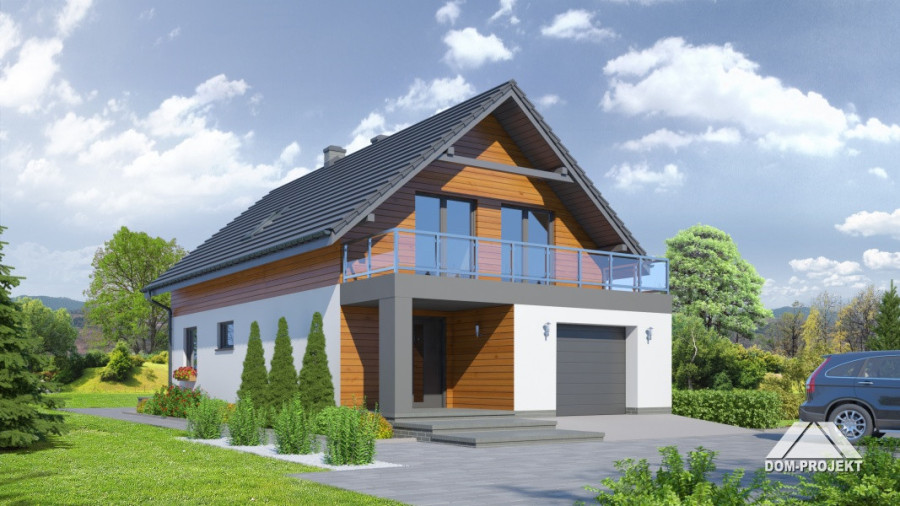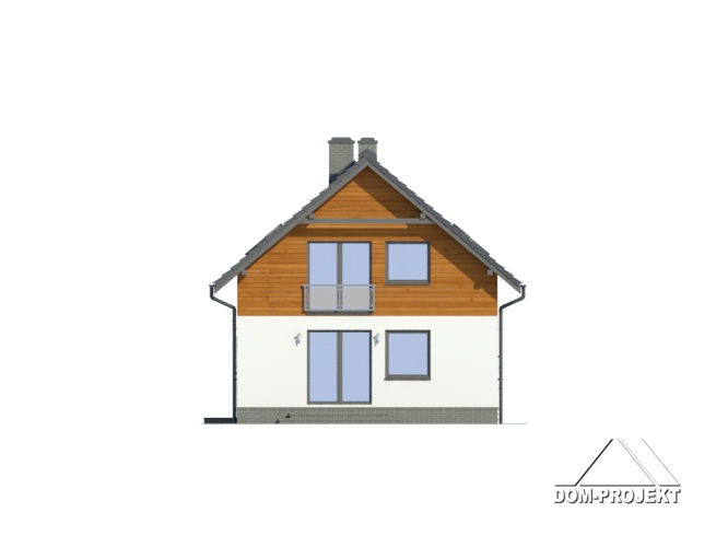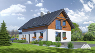 Dom na wąską działkę. Na parterze duży salon z kominkiem, wyjściem na taras i schodami na poddasze. Kuchnia, spiżarka, wc, wiatrołap, kotłownia i garaż. Na poddaszu trzy pokoje, dwie łazienki, komunikacja i balkon. Prosta bryła budynku i dach dwuspadowy sprzyjają szybkiej i taniej budowie i niskim kosztom eksploatacji.