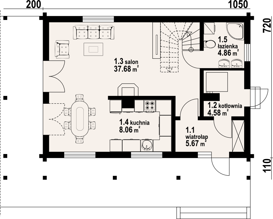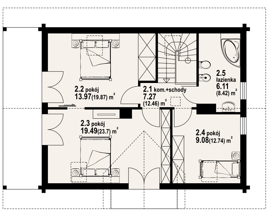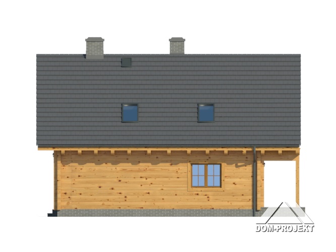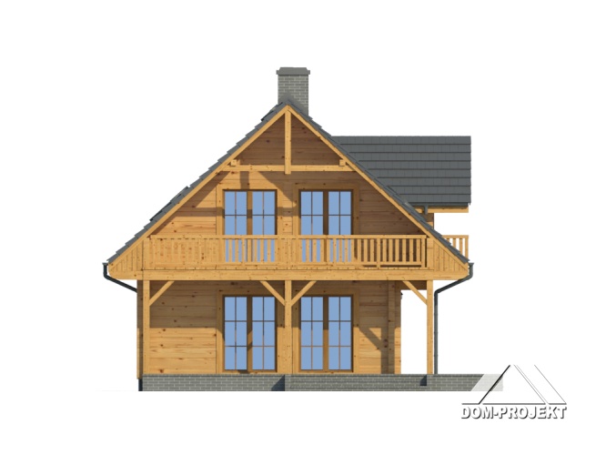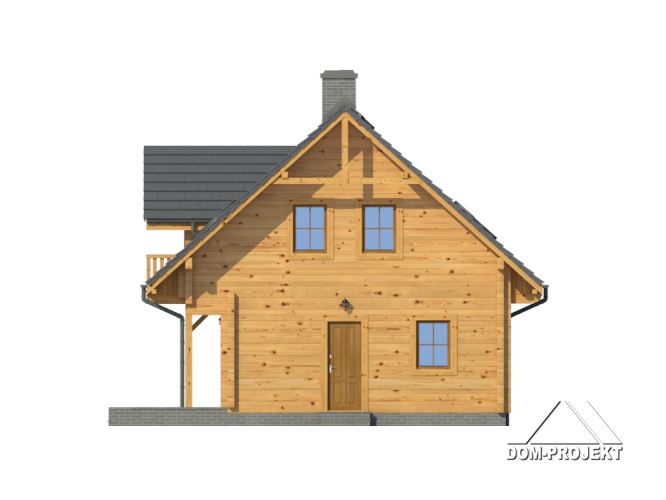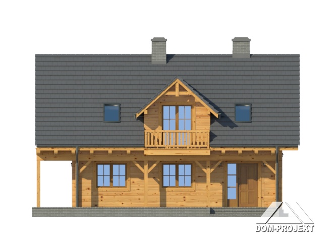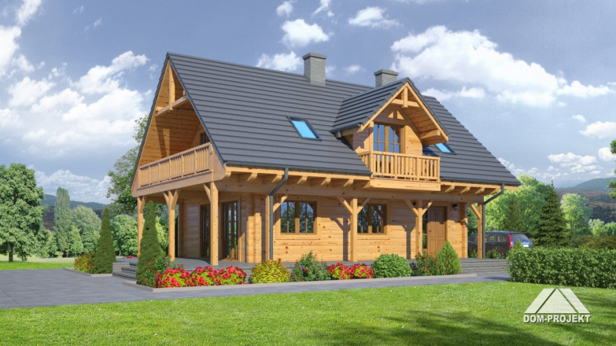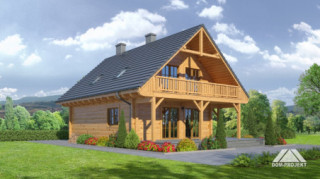 Dom z bali drewnianych. Na parterze duży salon z kominkiem, wyjściami na zadaszony taras i przejściem do kuchni. Łazienka, kotłownia, wiatrołap. Na poddaszu trzy pokoje, łazienka, komunikacja i dwa balkony. Zwarta bryła budynku i dach dwuspadowy sprzyjają taniej i szybkiej budowie oraz niskim kosztom eksploatacji.