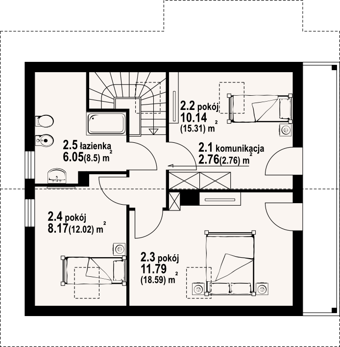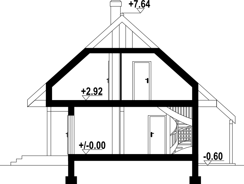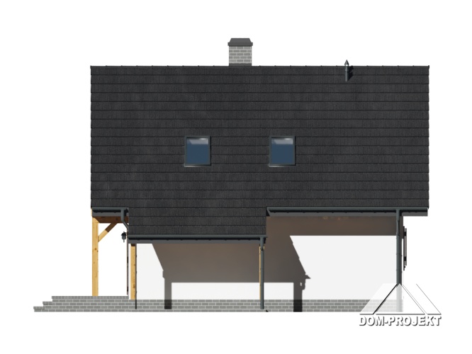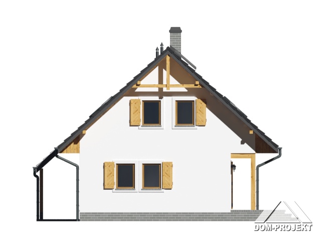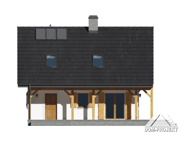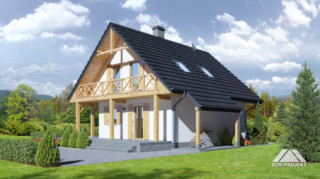Dom w konstrukcji szkieletu drewnianego. Duży salon z aneksem kuchennym, kominkiem, wyjściami na taras i schodami na poddasze. Łazienka, pomieszczenie gospodarcze, wiatrołap. Na poddaszu trzy pokoje, komunikacja i balkon. Prosta bryła budynku i dach dwuspadowy sprzyjają szybkiej i taniej budowie i niskim kosztom eksploatacji.