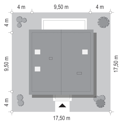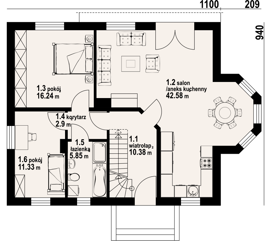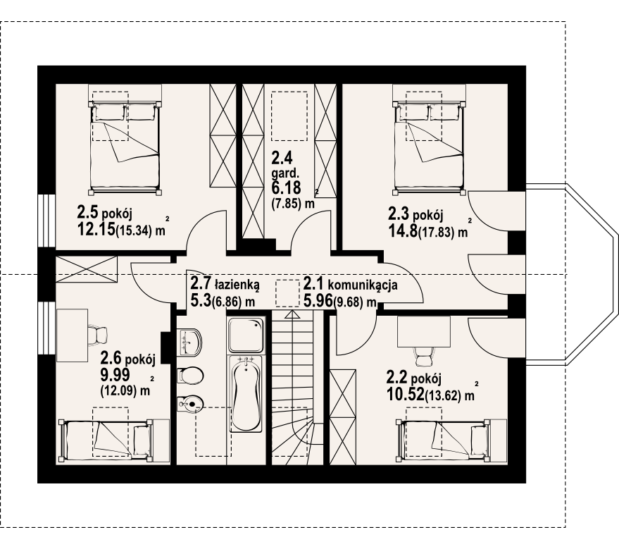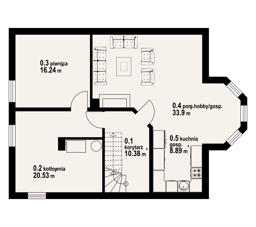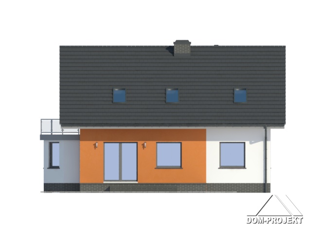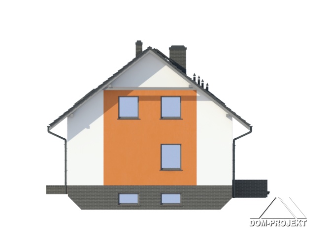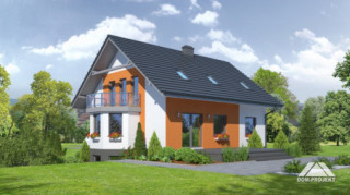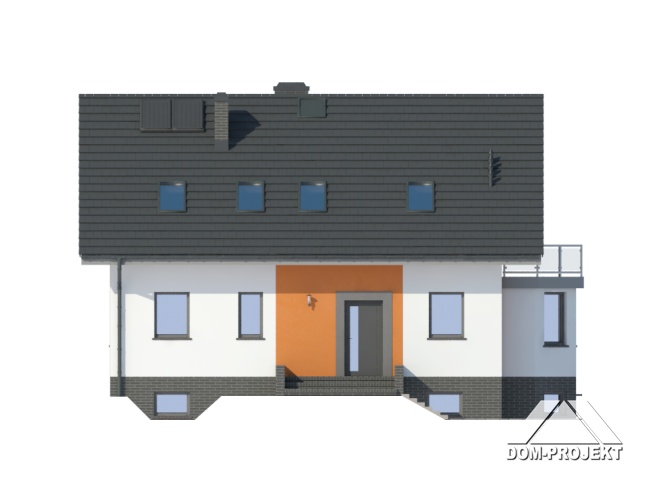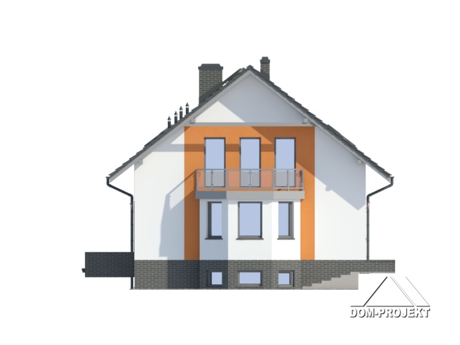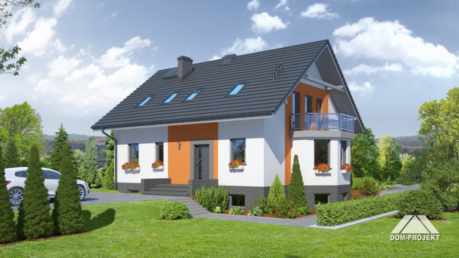 Dom z poddaszem użytkowym i piwnicami. Duży salon z kominkiem, wyjściem na taras i aneksem kuchennym. Dwa pokoje, łazienka i komunikacja. Na poddaszu cztery pokoje, łazienka, garderoba, komunikacja i balkon. W piwnicach pomieszczenie hobby, kuchnia gospodarcza, kotłownia, piwnica i komunikacja Prosta bryła budynku i dach dwuspadowy sprzyjają taniej i szybkiej budowie oraz niskim kosztom eksploatacji.