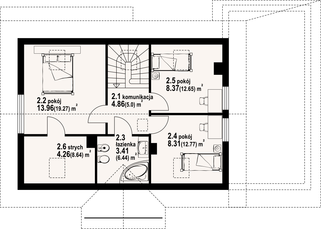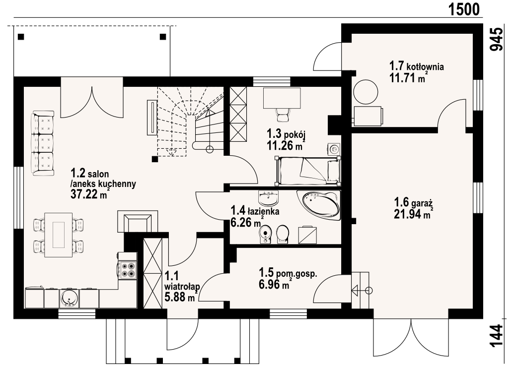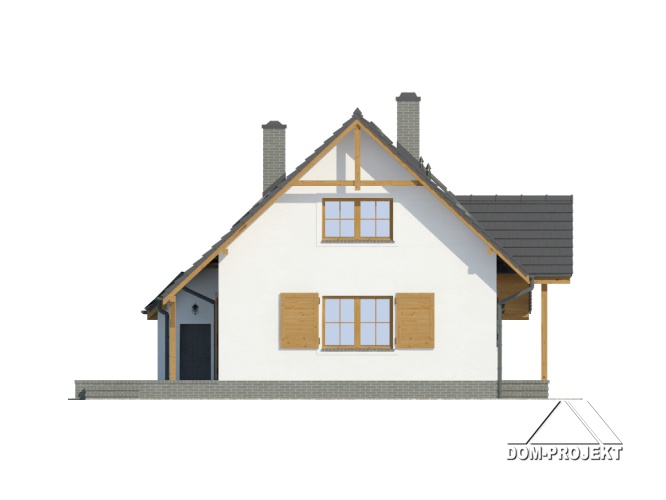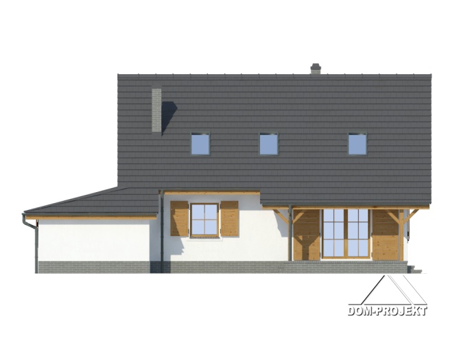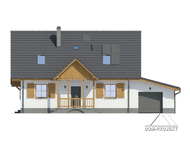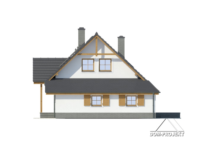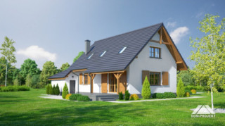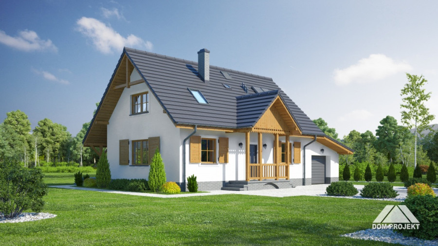 Atrakcyjny dom z poddaszem użytkowym w konstrukcji szkieletu drewnianego. Duży salon z aneksem kuchennym, kominkiem, wyjściem na taras i schodami na poddasze. Pokój, łazienka, wiatrołap, pomieszczenie gospodarcze garaż i kotłownia. Na poddaszu trzy pokoje, łazienka, strych i komunikacja. Zwarta bryła budynku i dach dwuspadowy sprzyjają taniej i szybkiej budowie i niskim kosztom eksploatacji.