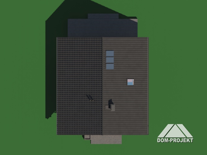 Dom w konstrukcji szkieletu drewnianego. Duży salon z aneksem kuchennym, kominkiem, wyjściem na zadaszony taras i schodami na poddasze, wiatrołap, łazienka, pralnia, kotłownia. Na poddaszu trzy pokoje, komunikacja i strych. Zwarta bryła budynku i dach dwuspadowy sprzyjają szybkiej i taniej budowie i niskim kosztom eksploatacji.