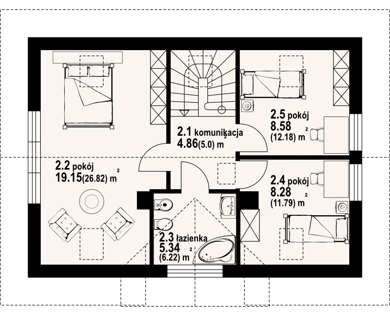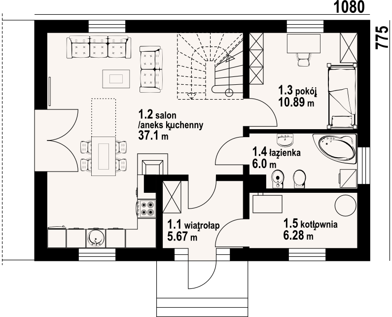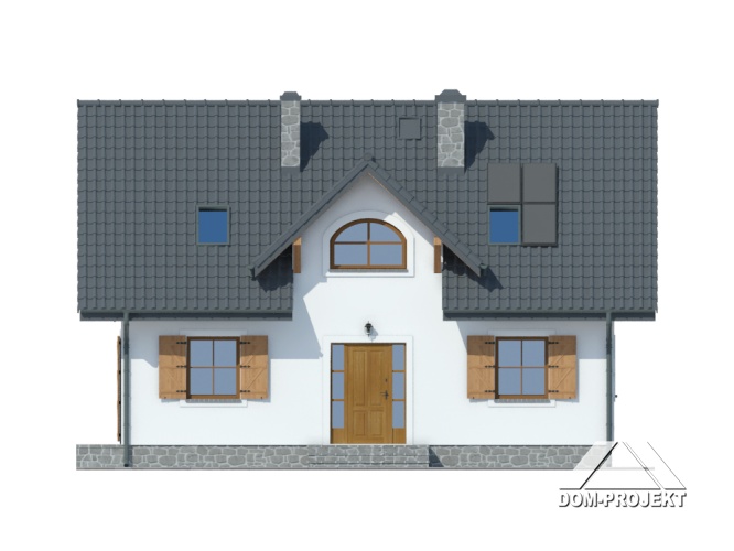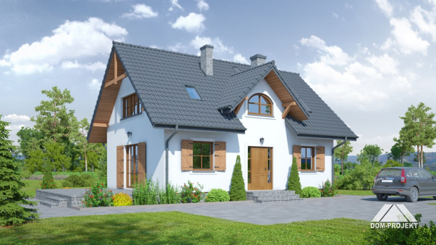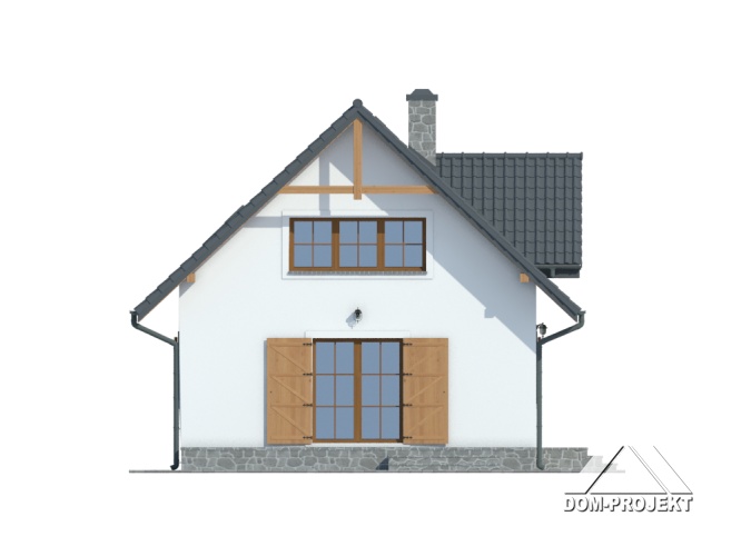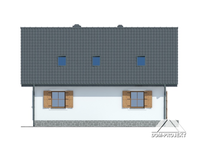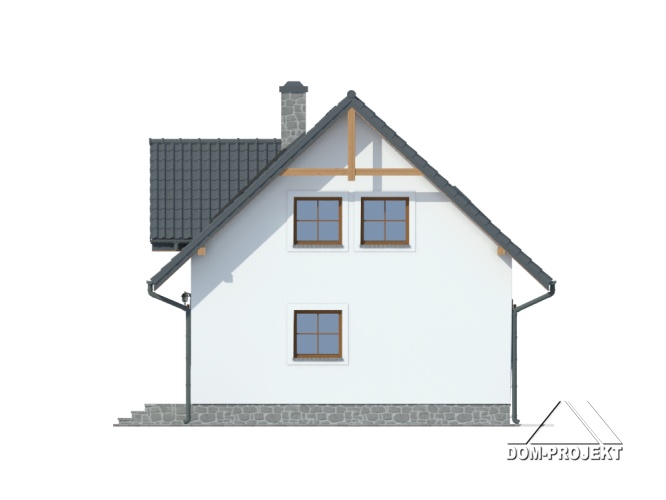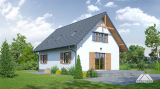 Dom z poddaszem mieszkalnym. Duży salon z aneksem kuchennym, kominkiem, wyjściem na taras i schodami na poddasze. Pokój, łazienka, wiatrołap i kotłownia. Na poddaszu trzy pokoje, łazienka i komunikacja. Zwarta bryła budynku i dach dwuspadowy sprzyjają szybkiej i taniej budowie i niskim kosztom eksploatacji.