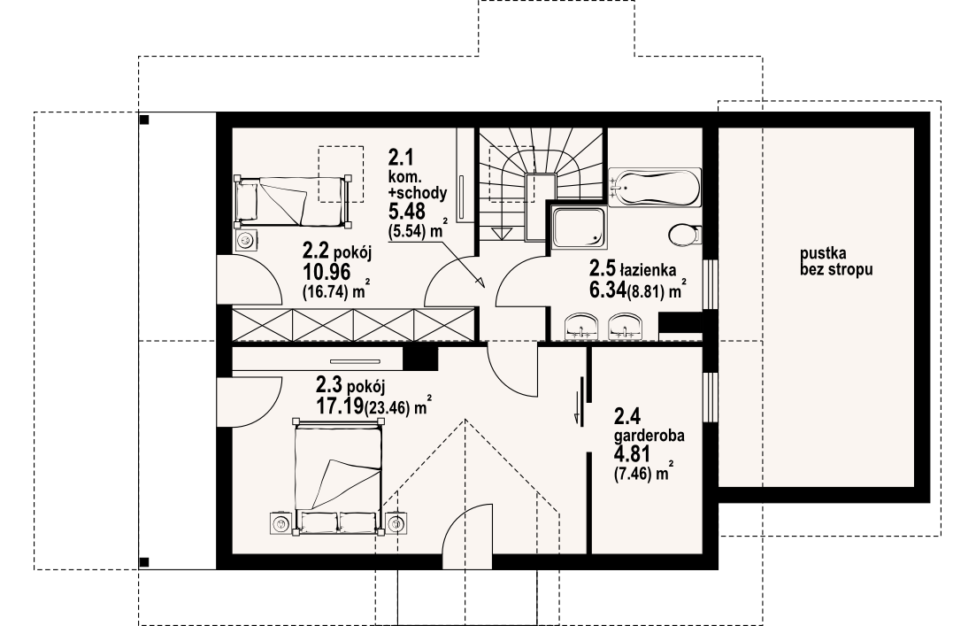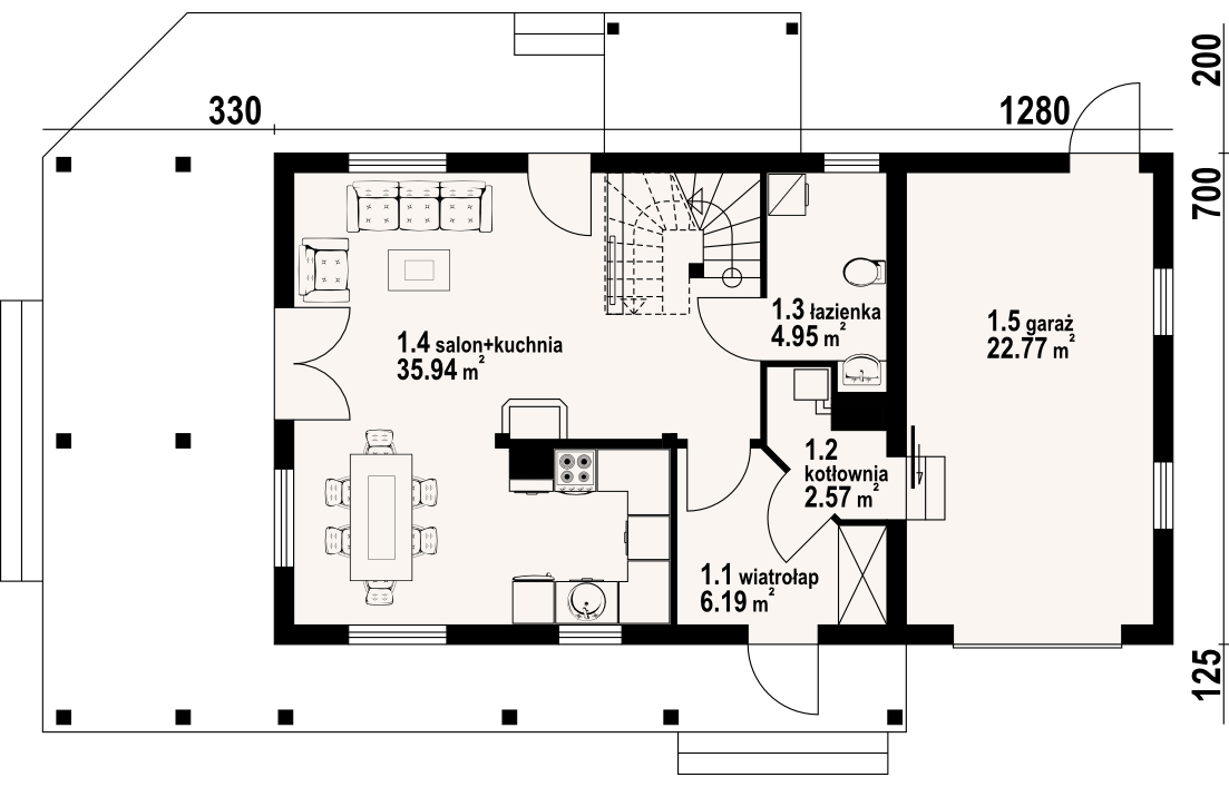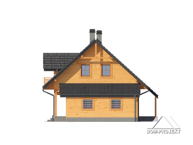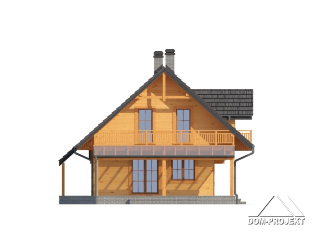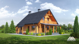 Dom w konstrukcji szkieletu drewnianego. Otwarta przestrzeń parteru. Duży salon z aneksami jadalnym oraz kuchennym, kominkiem, wyjściem na zadaszony taras i schodami na poddasze. Łazienka, kotłownia, wiatrołap i garaż. Na poddaszu dwa wygodne pokoje (sypialnia małżeńska z garderobą), duża łazienka, komunikacja, dwa balkony. Zwarta bryła budynku i dach dwuspadowy sprzyjają taniej i szybkiej budowie i niskim kosztom eksploatacji.
