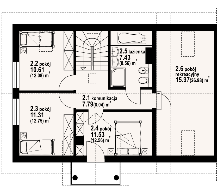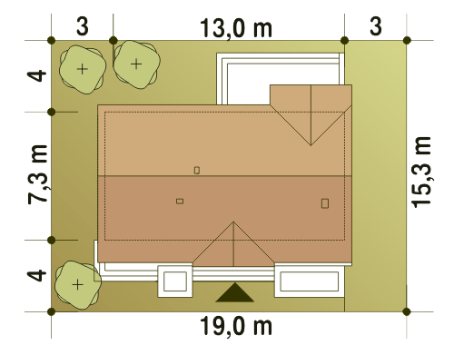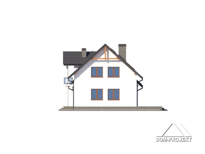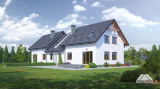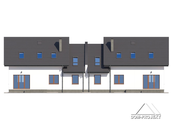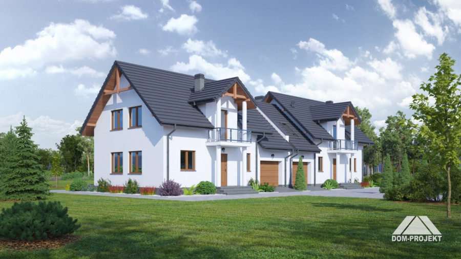 Dom - bliżniak. Każdy segment składa się z: dużego salonu z aneksem kuchennym, kominkiem i wyjściem na taras. Pokój, łazienka, komunikacja, wiatrołap i przejście do garażu. Garaż, kotłownia. Na poddaszu cztery pokoje, łazienka, balkon i komunikacja. Zwarta bryła budynku i dach dwuspadowy sprzyjają szybkiej i taniej budowie i niskim kosztom eksploatacji.