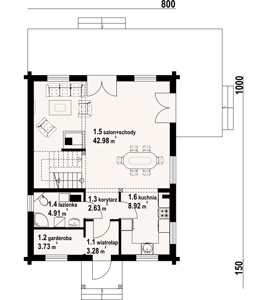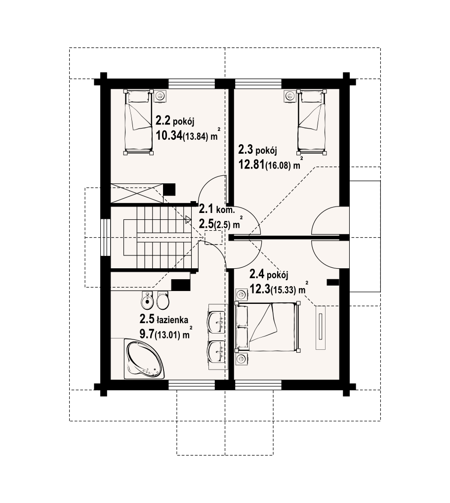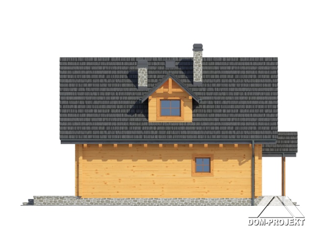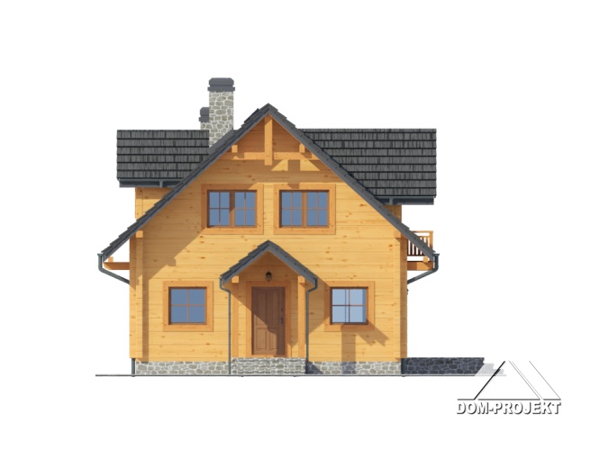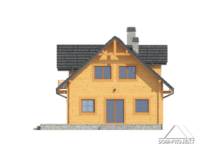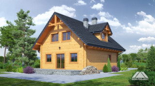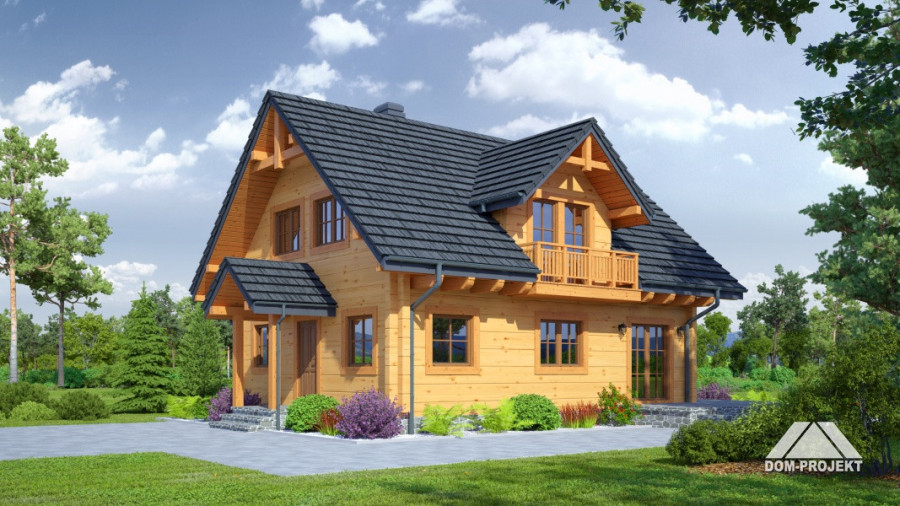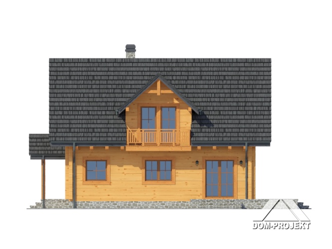 Dom z bali drewnianych. Duży salon z kominkiem, wyjściami na taras i schodami na poddasze. Kuchnia, łazienka, garderoba, korytarz i wiatrołap. Na poddaszu trzy pokoje, łazienka i komunikacja. Zwarta bryła budynku i dach dwuspadowy sprzyjają szybkiej i taniej budowie i niskim kosztom eksploatacji.
