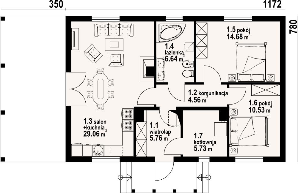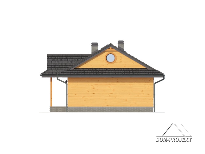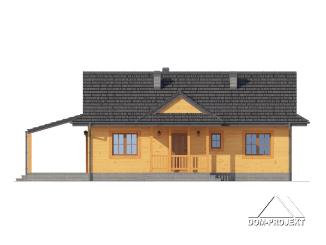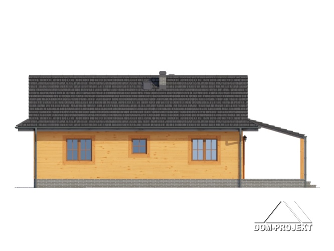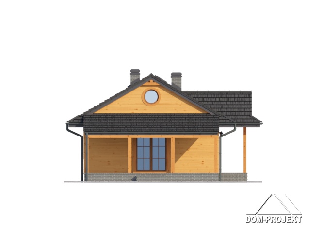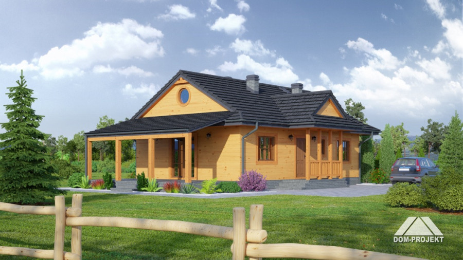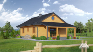 Dom parterowy w konstrukcji szkieletu drewnianego. Duży salon z aneksem kuchennym, kominkiem, wyjściem na duży zadaszony taras. Dwa pokoje, łazienka, komunikacja, kotłownia i wiatrołap. Wejście do domu zadaszone. Poddasze nieużytkowe. Zwarta bryła budynku i dach dwuspadowy sprzyjają szybkiej i taniej budowie i niskim kosztom eksploatacji.