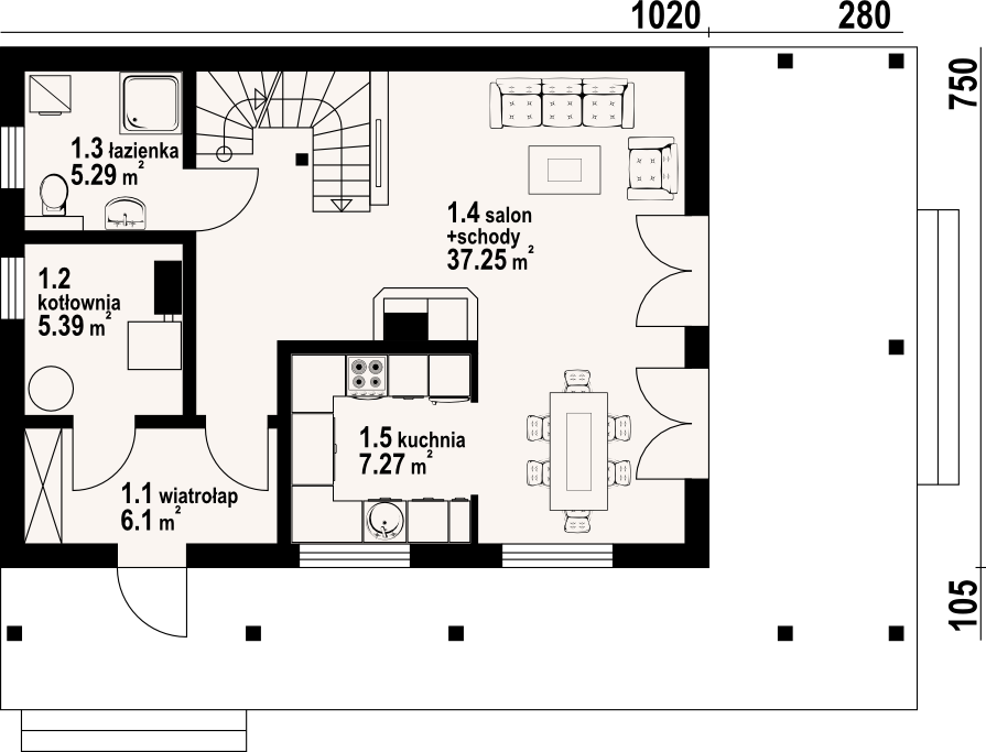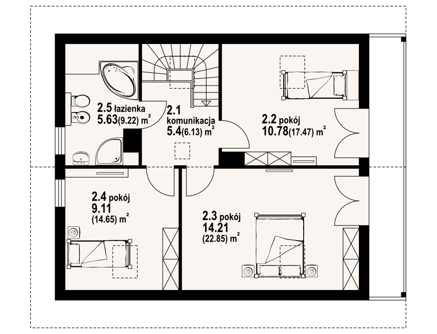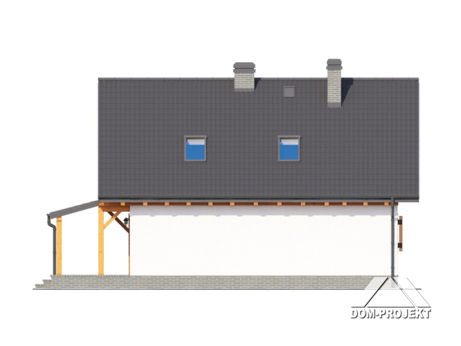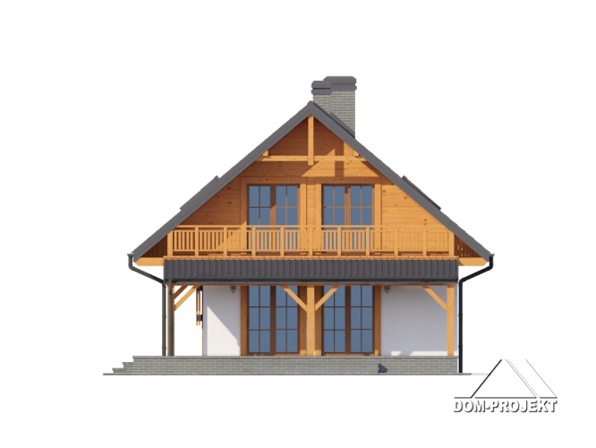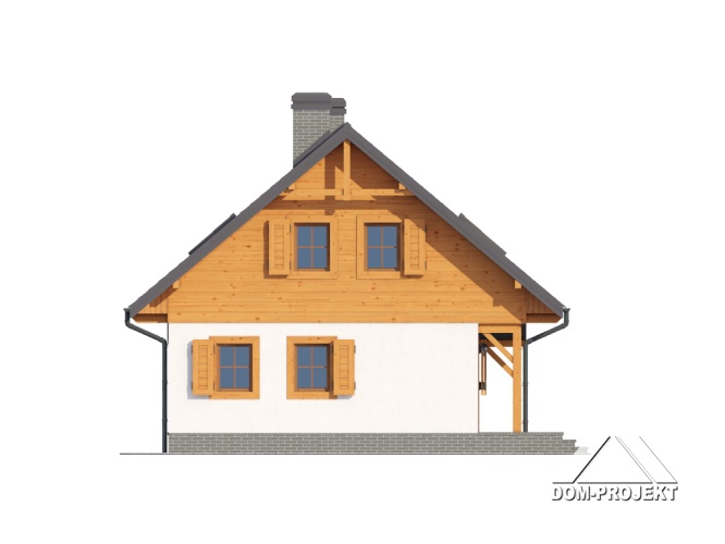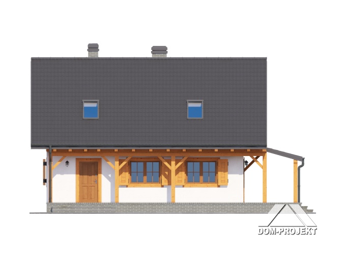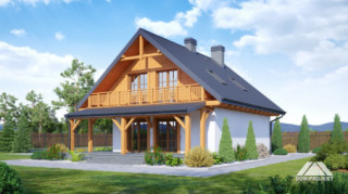 Dom z poddaszem. Parter murowany (beton komórkowy+ocieplenie), poddasze - szkielet drewniany. Duży salon z aneksem kuchennym, kominkiem, schodami na poddasze i wyjściem na zadaszony taras. Łazienka, kotłownia, wiatrołap. Na poddaszu trzy pokoje, łazienka, komunikacja i balkon.