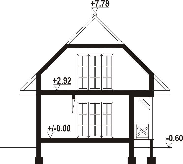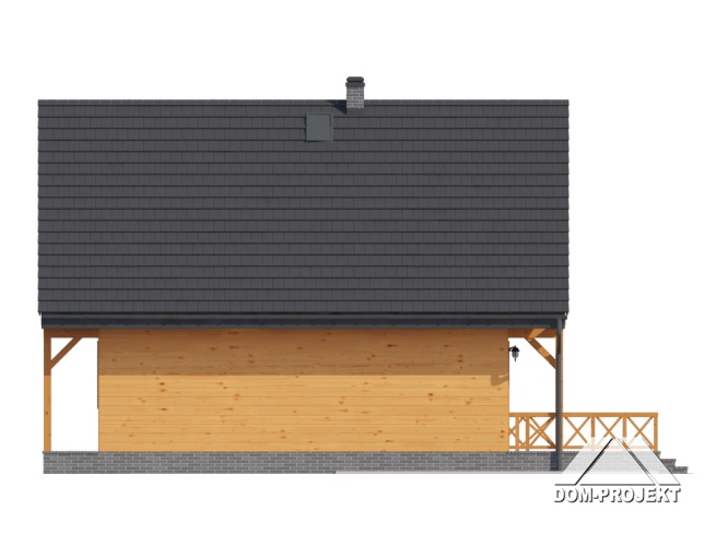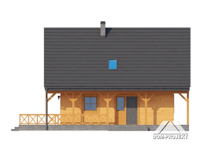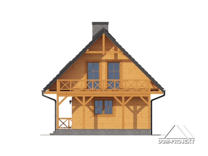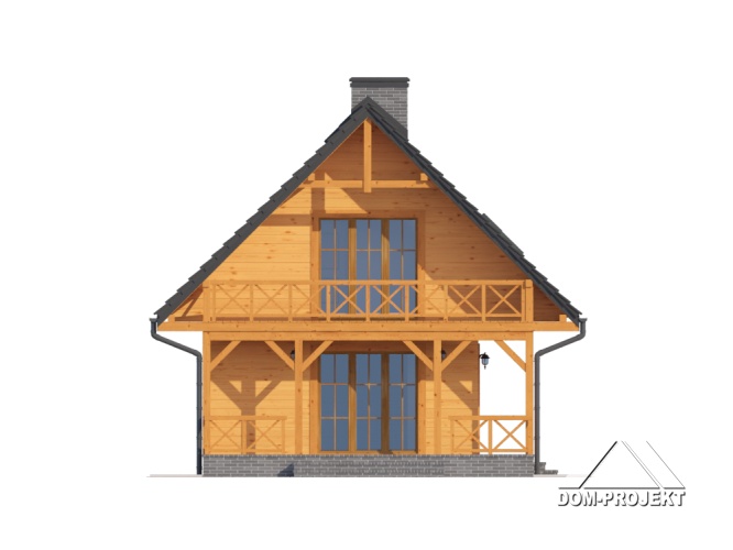 Dom w konstrukcji szkieletu drewnianego. Duży salon z aneksem kuchennym, kominkiem, schodami na poddasze i wyjściem na zadaszony taras. Pokój, łazienka, wiatrołap. Na poddaszu dwa pokoje, łazienka, garderoba, komunikacja i dwa balkony. Zwarta bryła budynki i dach dwuspadowy sprzyjają szybkiej i taniej budowie i niskim kosztom eksploatacji.