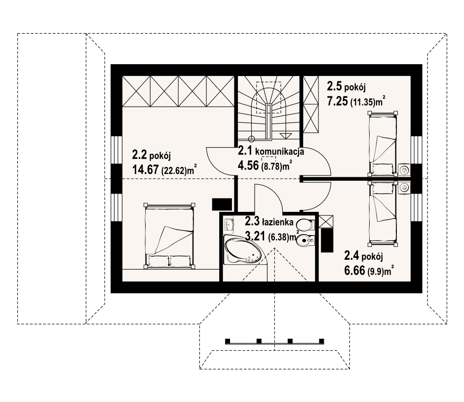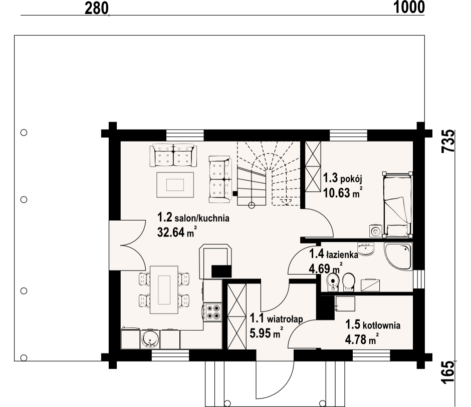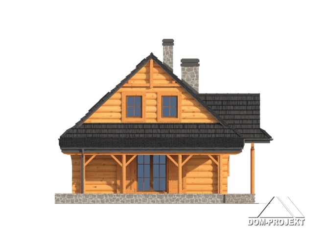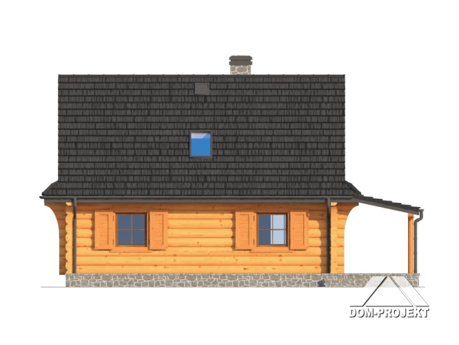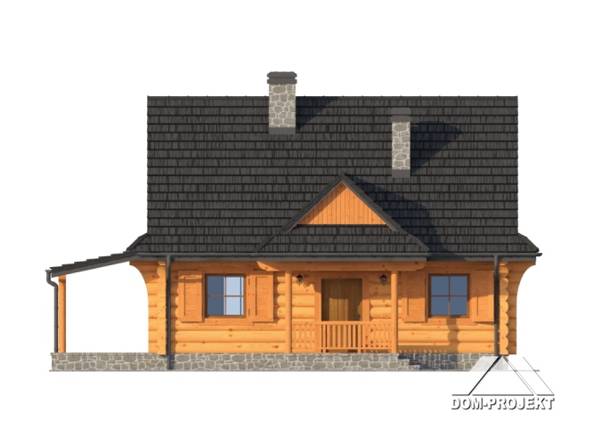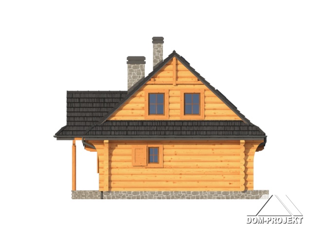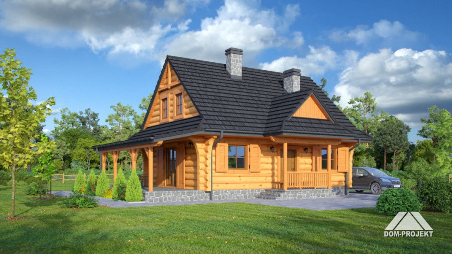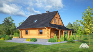 Dom z bali drewnianych. Duży salon z aneksem kuchennym, kominkiem, wyjściem na zadaszony taras i schodami na poddasze. Pokój, łazienka, kotłownia, wiatrołap. Na poddaszu trzy pokoje, łazienka i komunikacja. Zwarta bryła budynku i dach dwuspadowy sprzyjają szybkiej i taniej budowie i niskim kosztom eksploatacji.