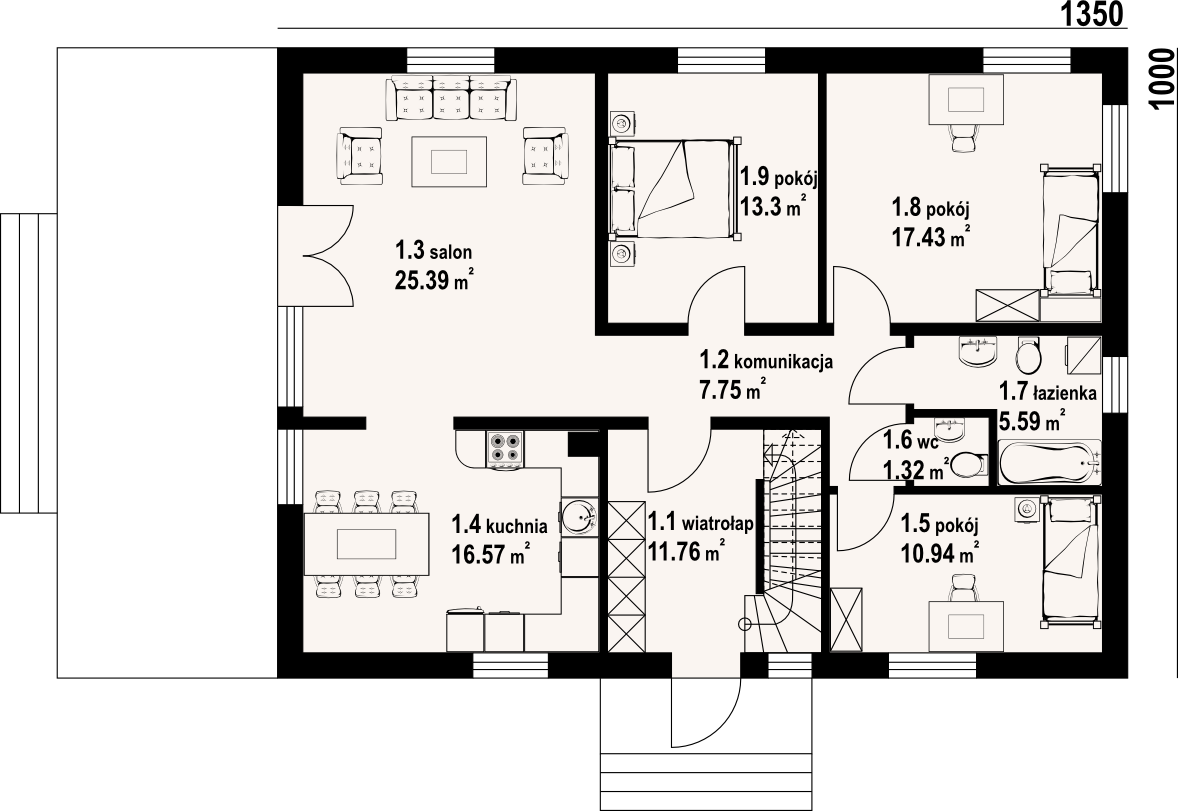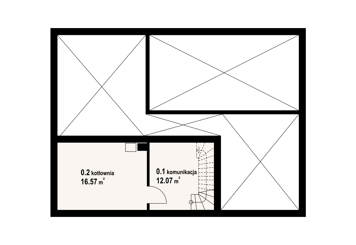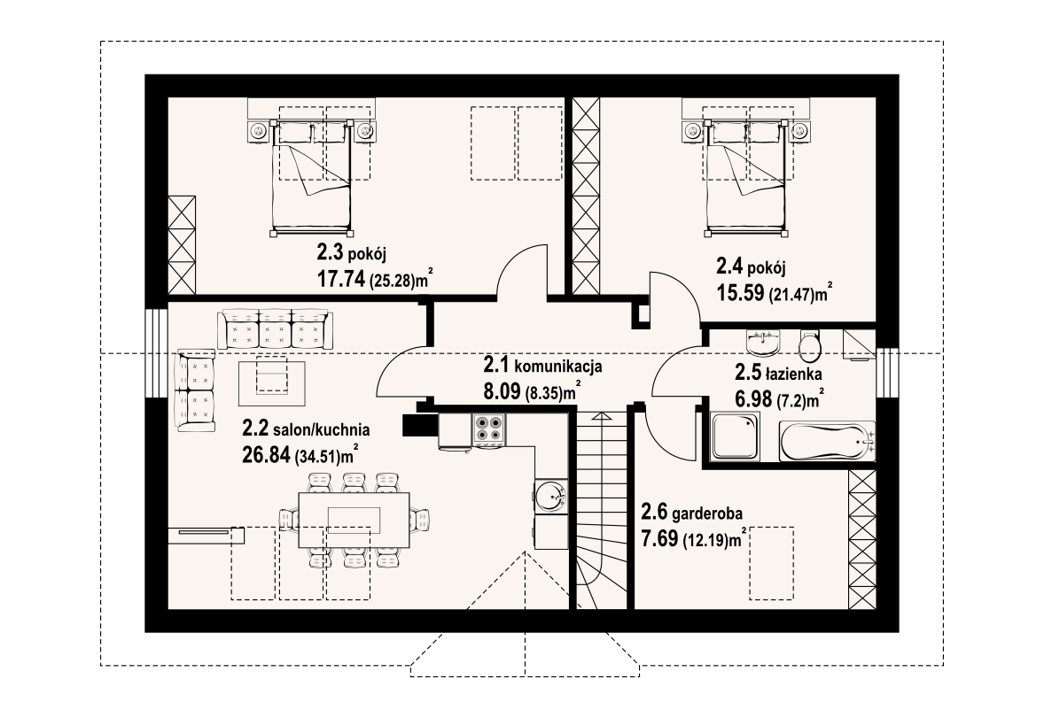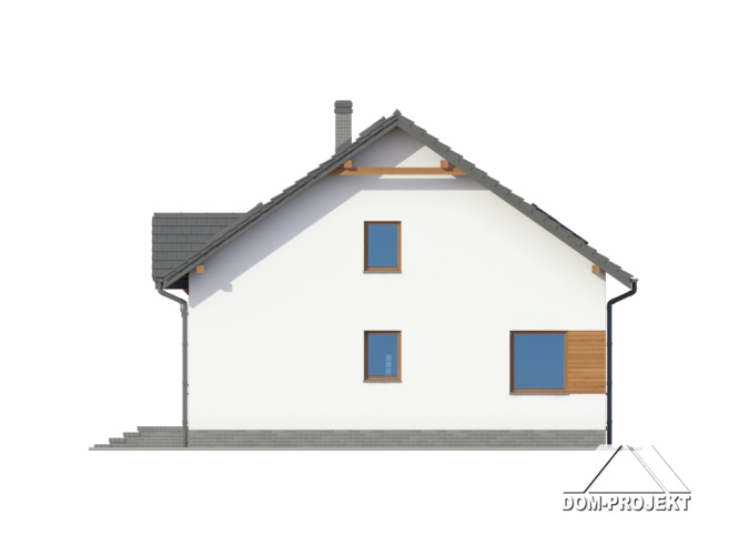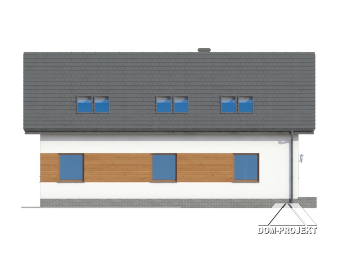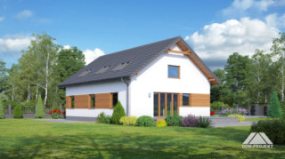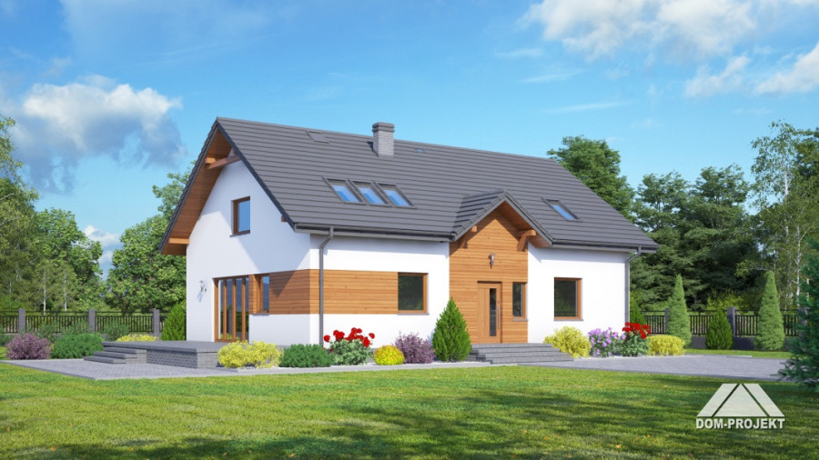 Dom z częściowym podpiwniczeniem. Duży salon z wyjściem na taras, duża kuchnia, trzy pokoje, łazienka, wc, wiatrołap i komunikacja. Na poddaszu salon z aneksem kuchennym, dwa pokoje, łazienka, garderoba i komunikacja. W piwnicach kotłownia i komunikacja. Zwarta bryła budynku i dach dwuspadowy sprzyjają szybkiej i taniej budowie i niskim kosztom eksploatacji.