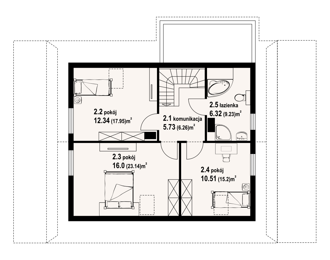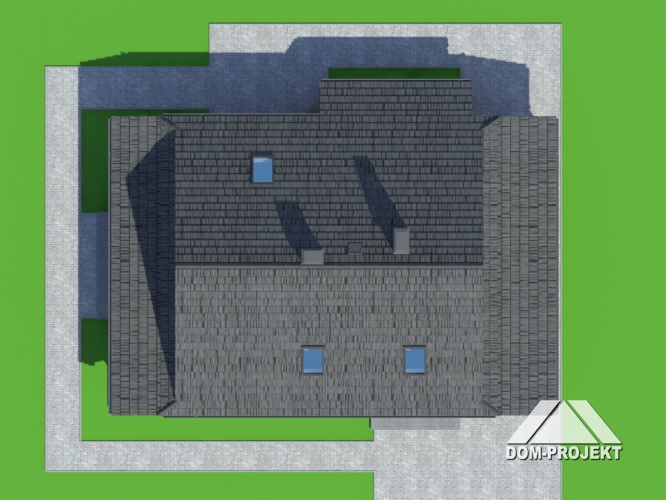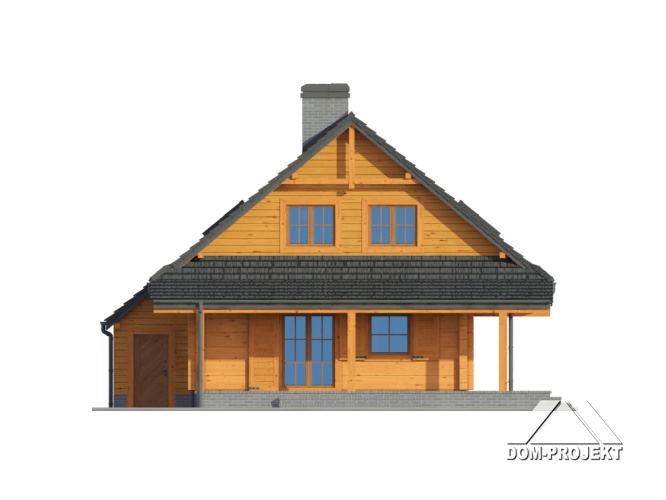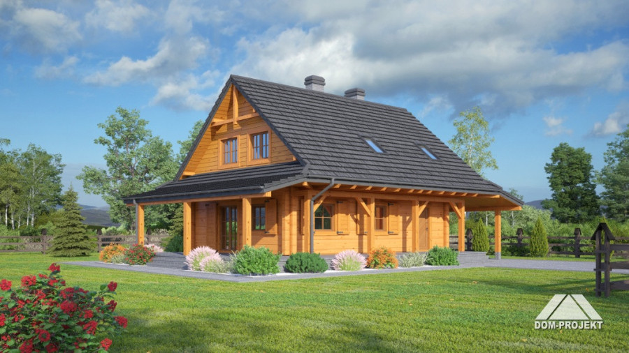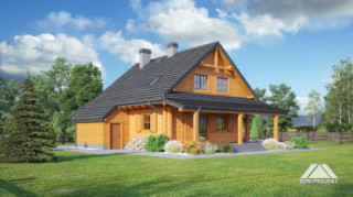 Dom z bali drewnianych. Duży salon z aneksem kuchennym, kominkiem, wyjściem na zadaszony taras i schodami na poddasze.Łazienka, kotłownia i wiatrołap. Na poddaszu trzy pokoje, łazienka i komunikacja. Zwarta bryła budynku i dach dwuspadowy sprzyjają szybkiej i taniej budowie i niskim kosztom eksploatacji.
