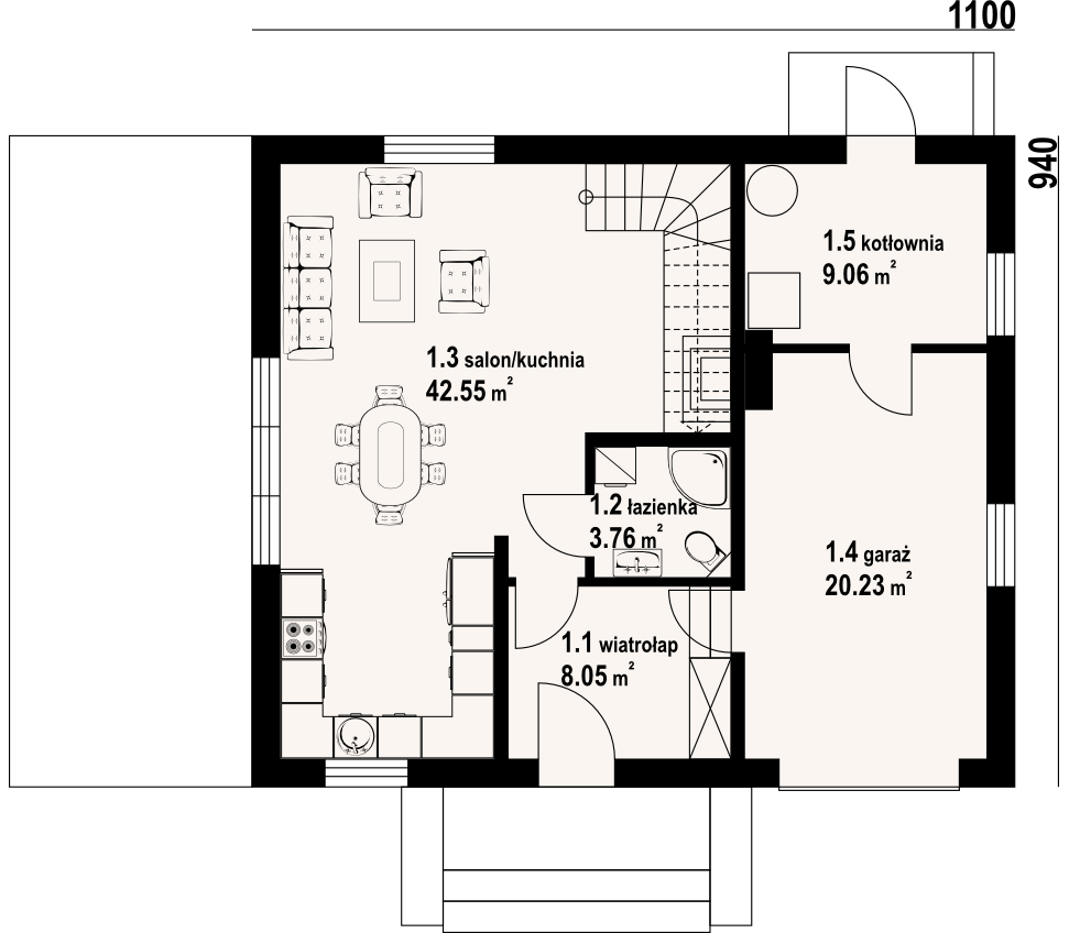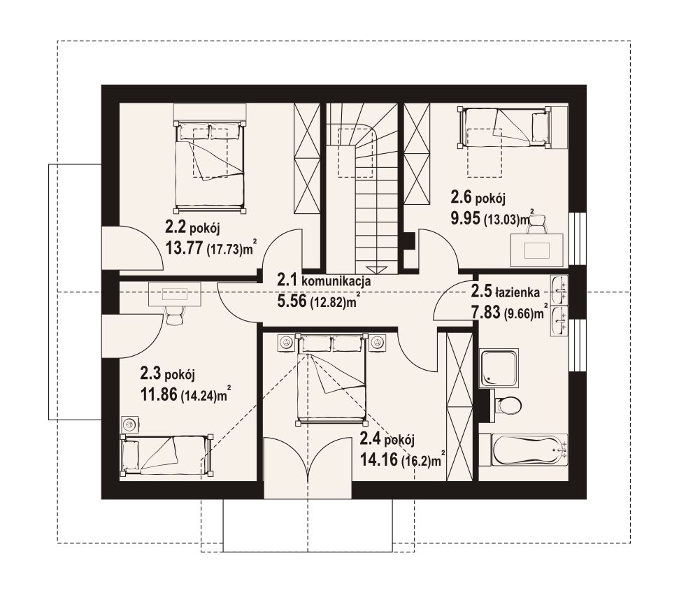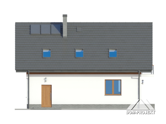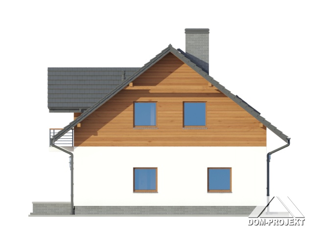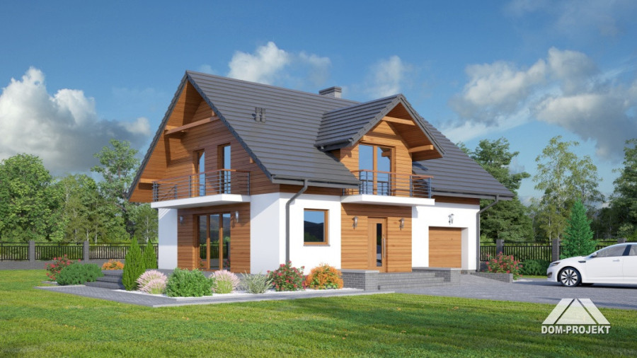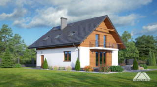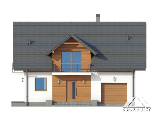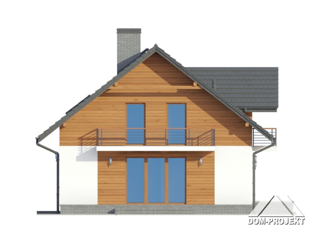 Dom z poddaszem. Duży salon z aneksem kuchennym, kominkiem, wyjściem na taras i schodami na poddasze. Łazienka, wiatrołap, garaż i kotłownia. Na poddaszu cztery pokoje, łazienka, komunikacja i dwa balkony. Zwarta bryła budynku i dach dwuspadowy sprzyjają szybkiej i taniej budowie i niskim kosztom eksploatacji.