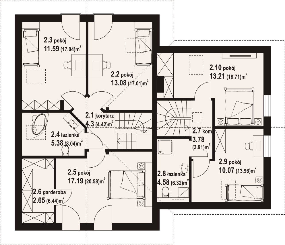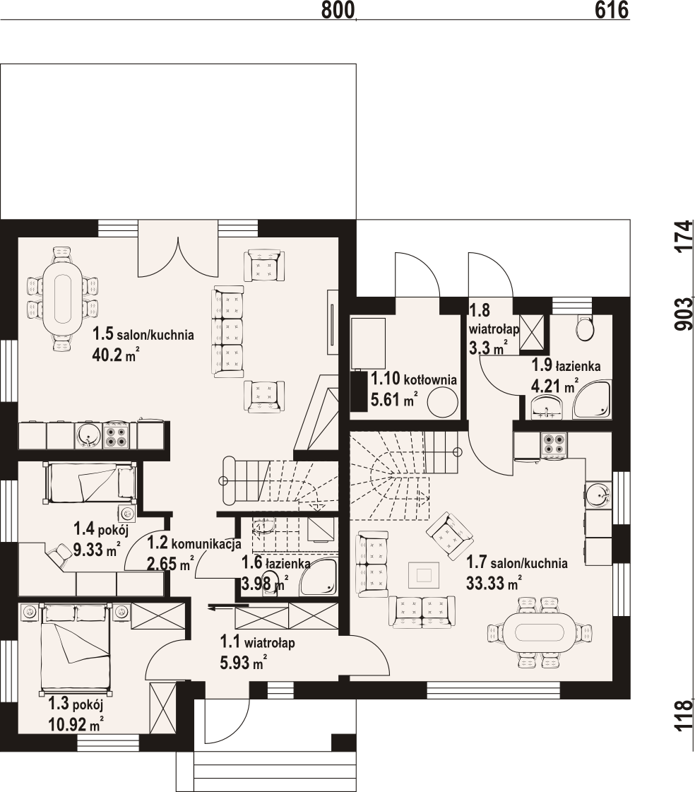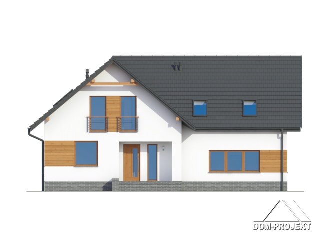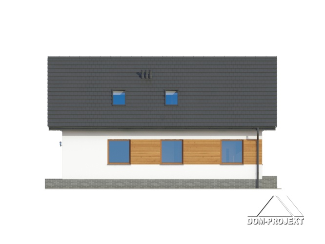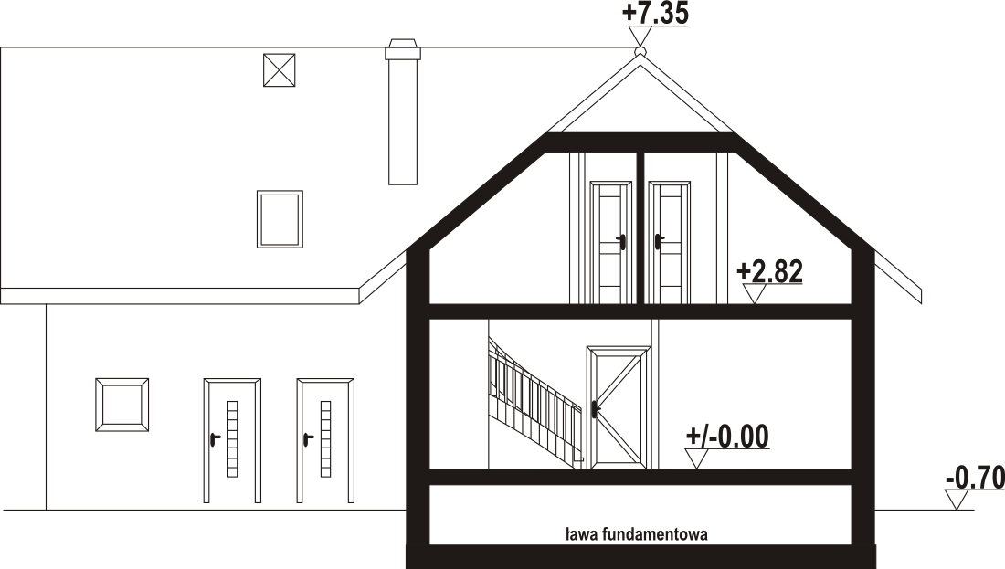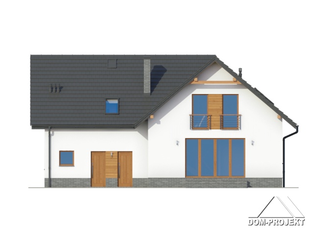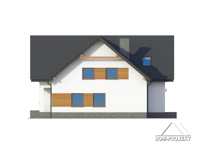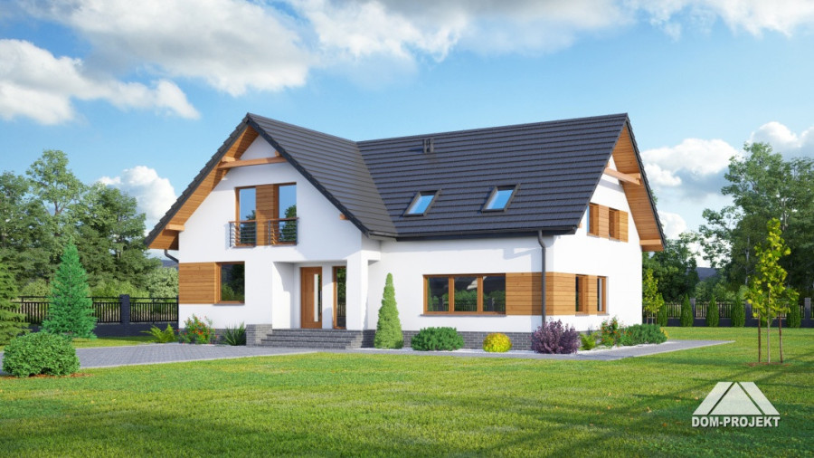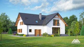 Dom jednorodzinny dwulokalowy. Duży salon z aneksem kuchennym, kominkiem, wyjściem na taras i schodami na poddasze. Dwa pokoje, łazienka, wiatrołap. Na poddaszu trzy pokoje, łazienka i garderoba. W drugim lokalu Salon z aneksem kuchennym i schodami na poddasze. Łazienka, wiatrołap i kotłownia. Na poddaszu dwa pokoje, łazienka i komunikacja.