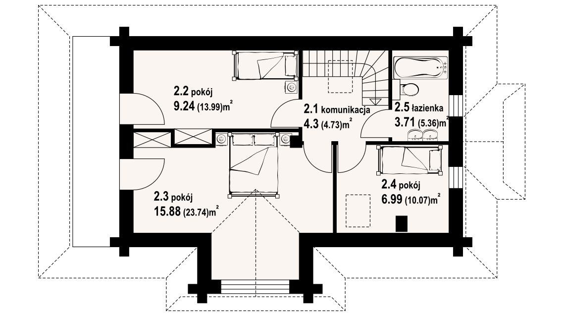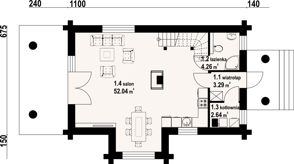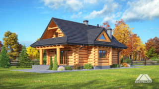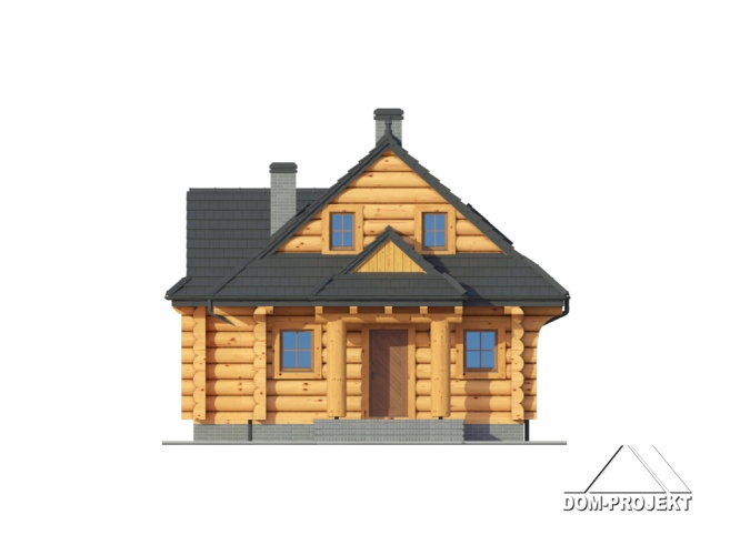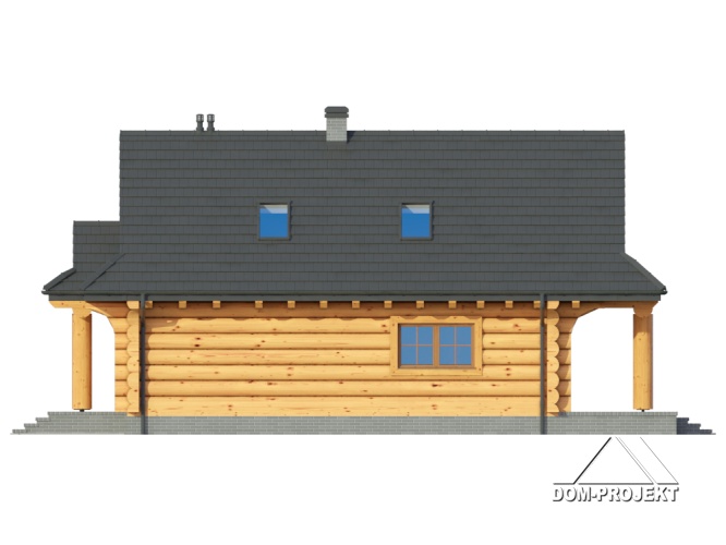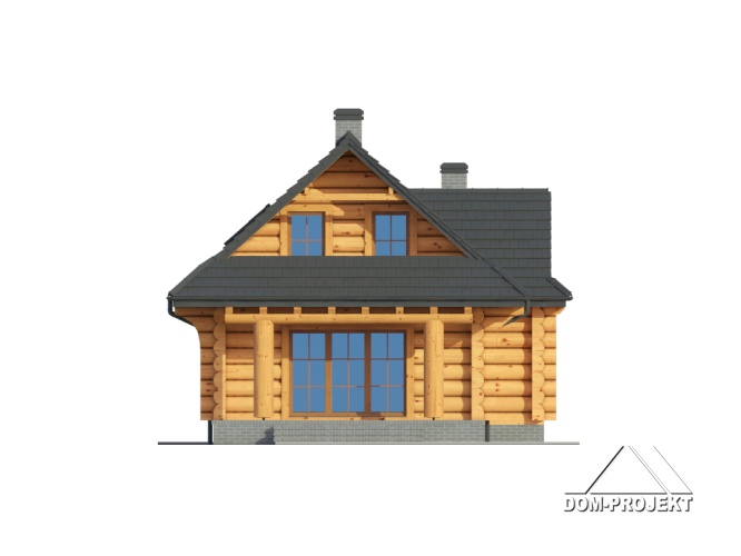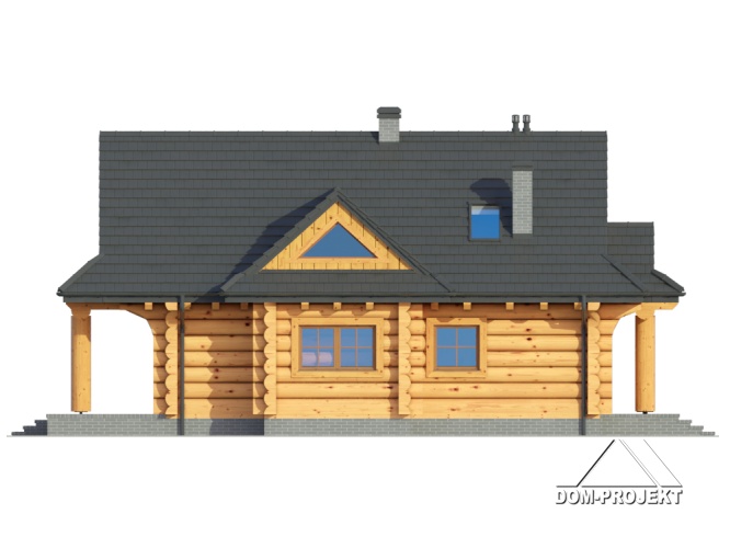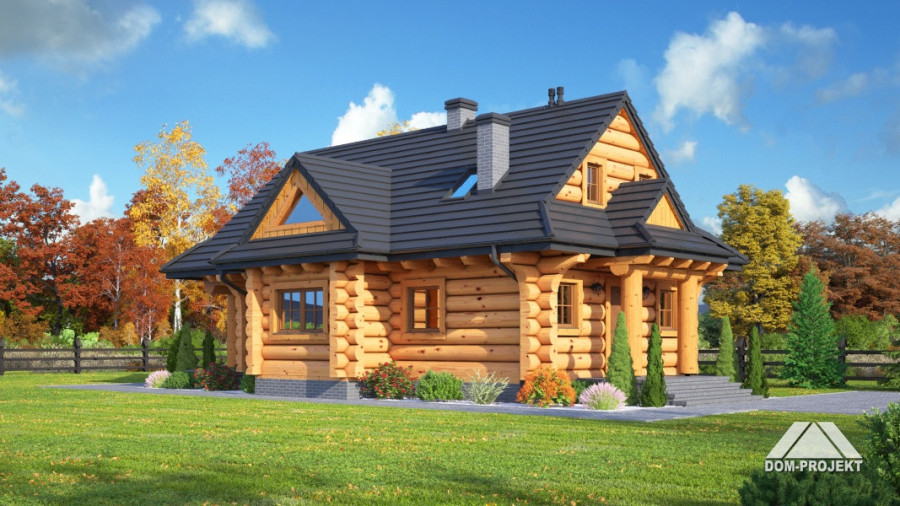 Dom z bali drewnianych. Duży salon z aneksem kuchennym, kominkiem, wyjściem na zadaszony taras i schodami na poddasze. Łazienka, wiatrołap, pomieszczenie gospodarcze. Na poddaszu trzy pokoje, łazienka i balkon.