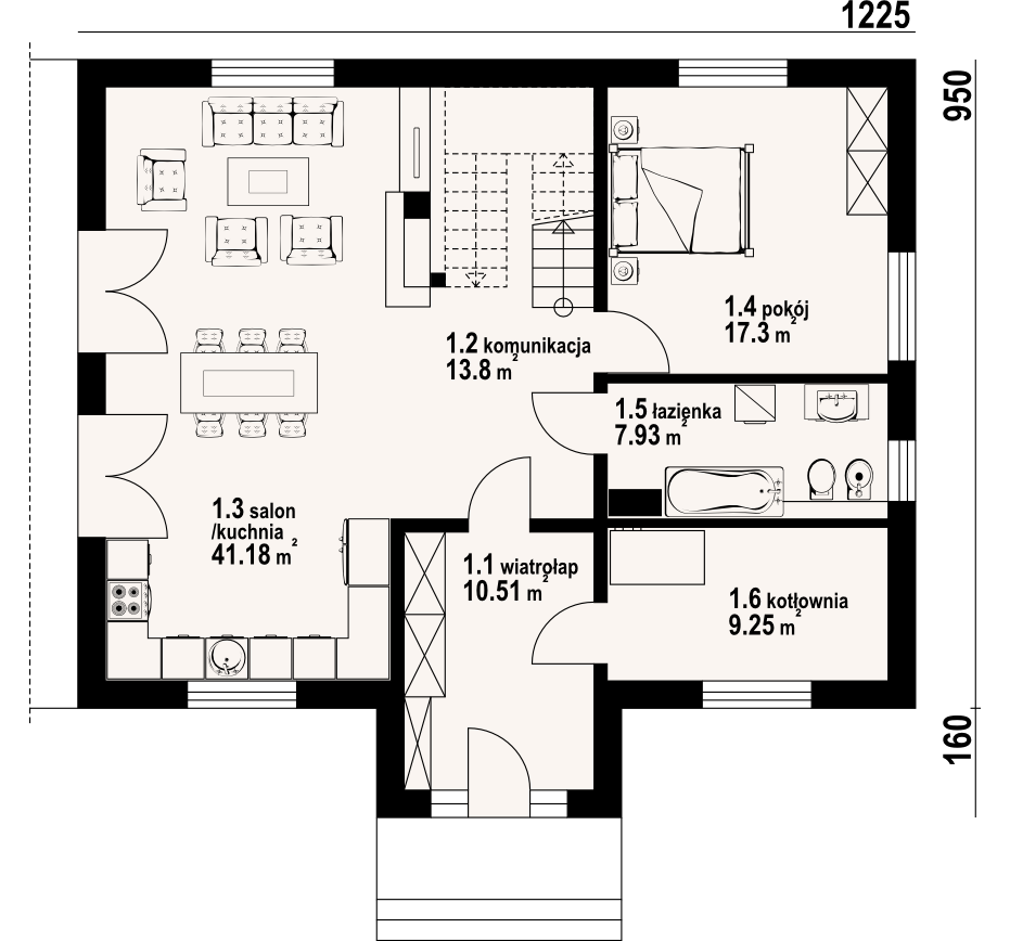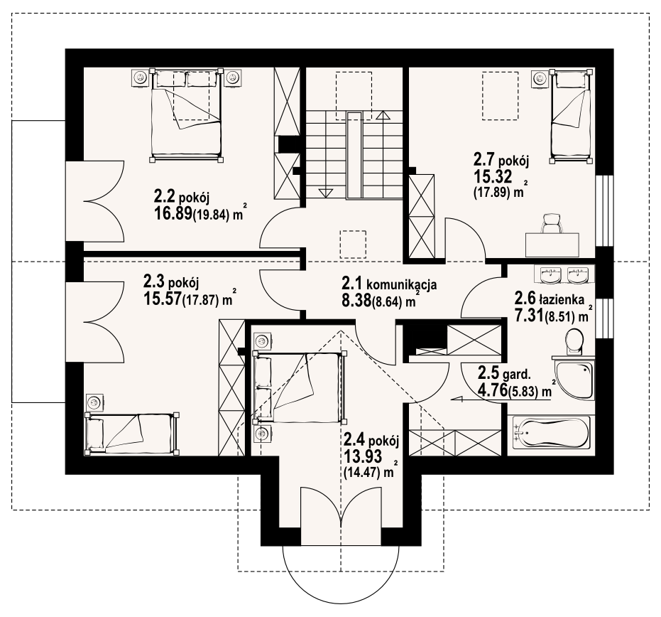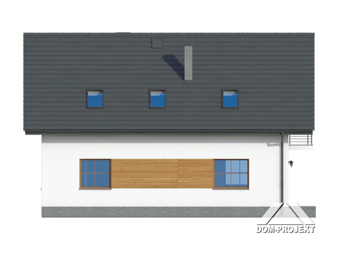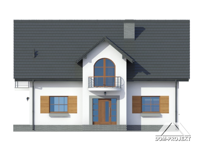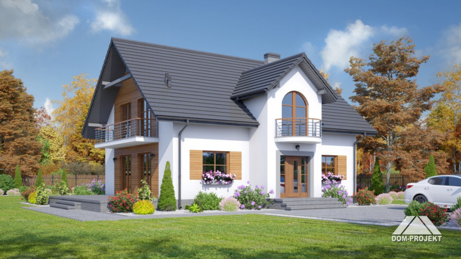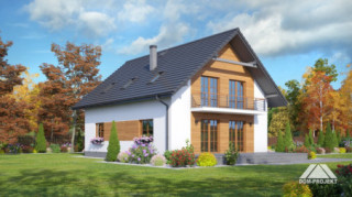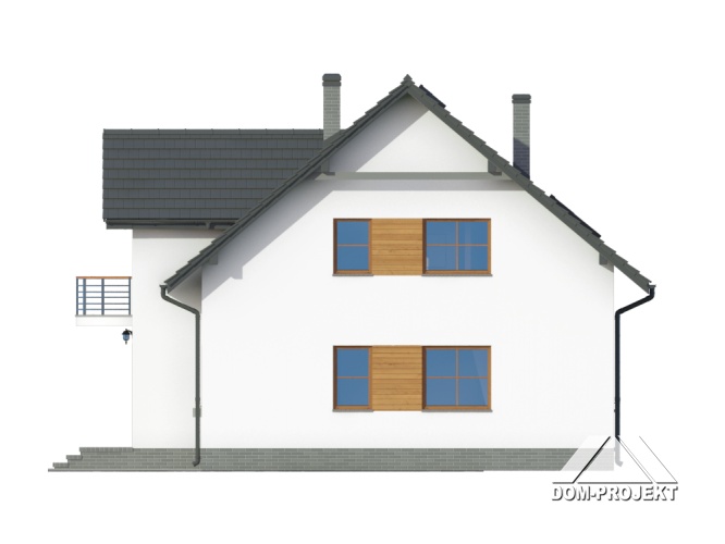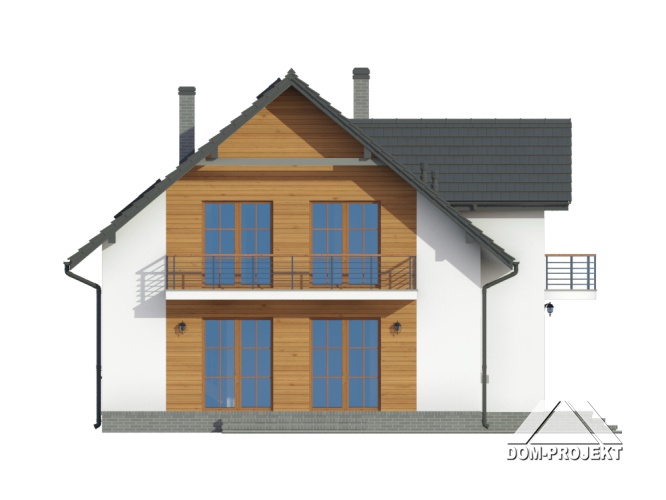 Dom z poddaszem. Duży salon z aneksem kuchennym, kominkiem, wyjściem na taras i schodami na poddasze. Pokój, łazienka, wiatrołap. Na poddaszu cztery pokoje, łazienka, garderoba, komunikacja i dwa balkony. Zwarte bryła budynku i dach dwuspadowy sprzyjają taniej i szybkiej budowie i niskim kosztom eksploatacji.