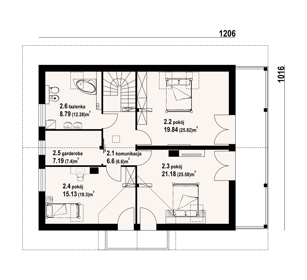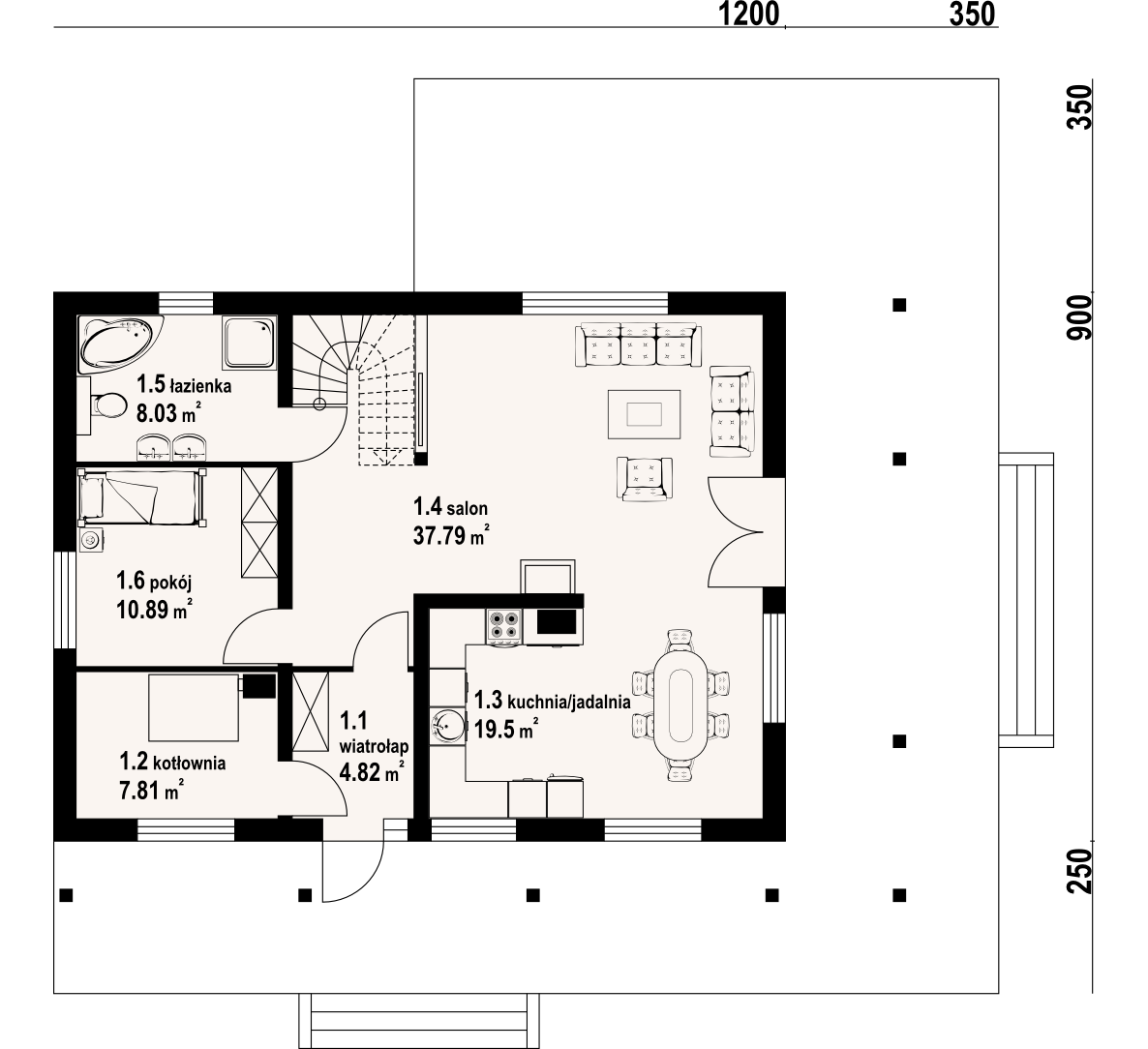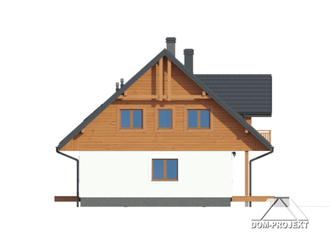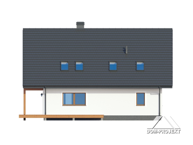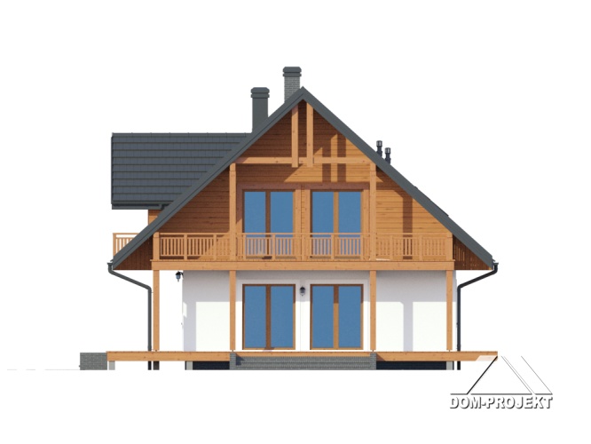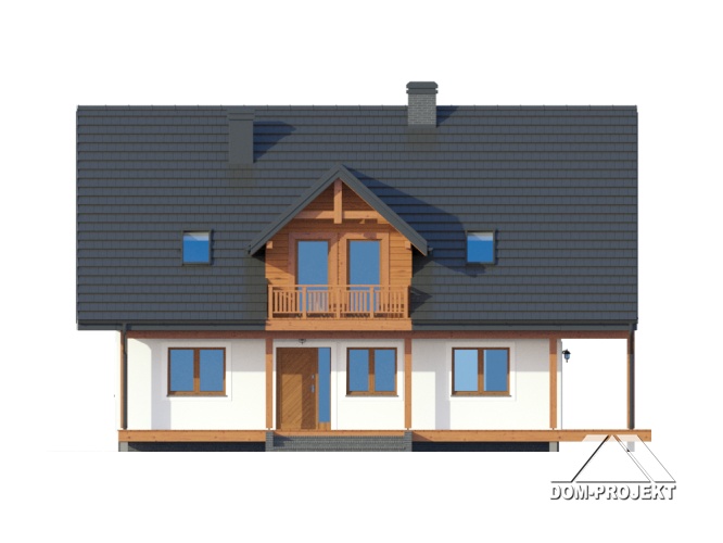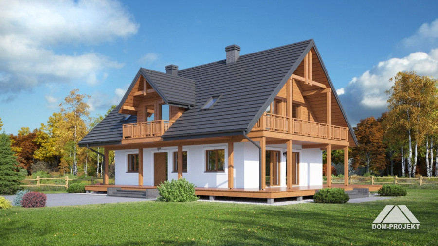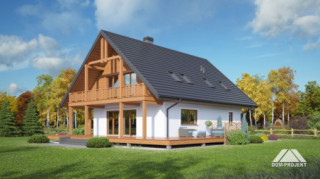 Dom w konstrukcji szkieletu drewnianego. Duży salon z aneksem kuchennym, jadalnią, wypoczynkiem, kominkiem, wyjściem na zadaszony taras i schodami na poddasze. Pokój, łazienka, kotłownia, wiatrołap. Na poddaszu trzy pokoje, łazienka, garderoba, komunikacja i dwa balkony. Zwarta bryła budynku i dach dwuspadowy sprzyjają szybkiej i taniej budowie i niskim kosztom eksploatacji.